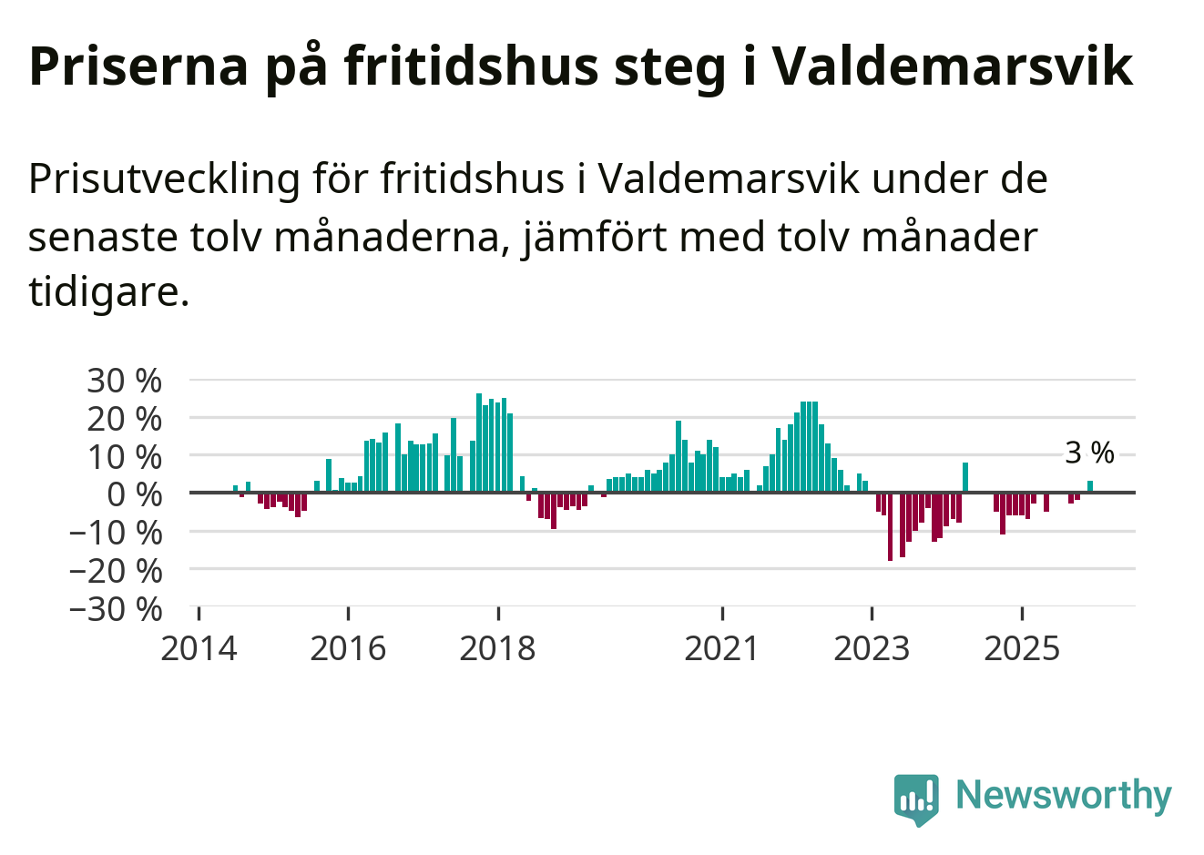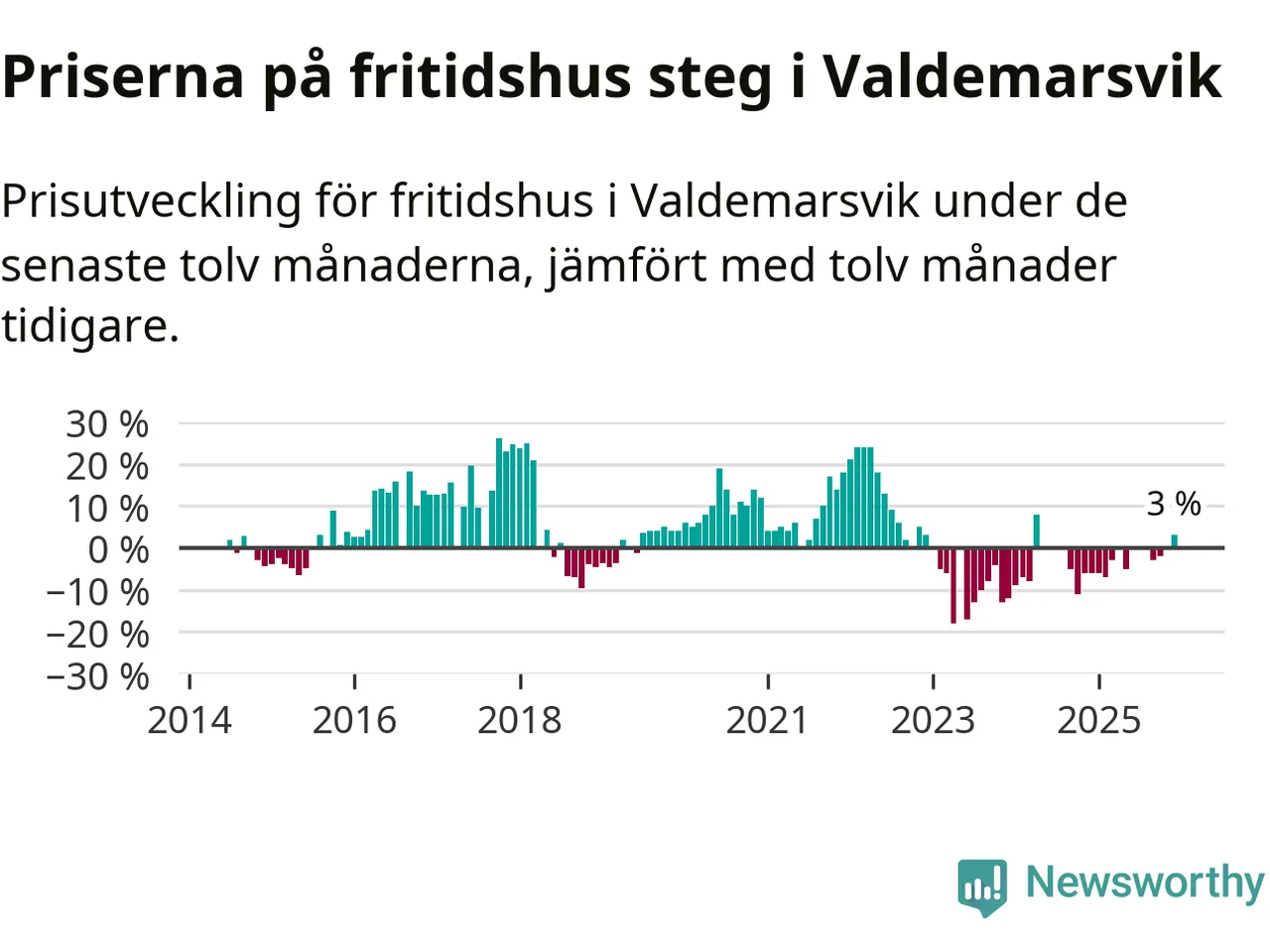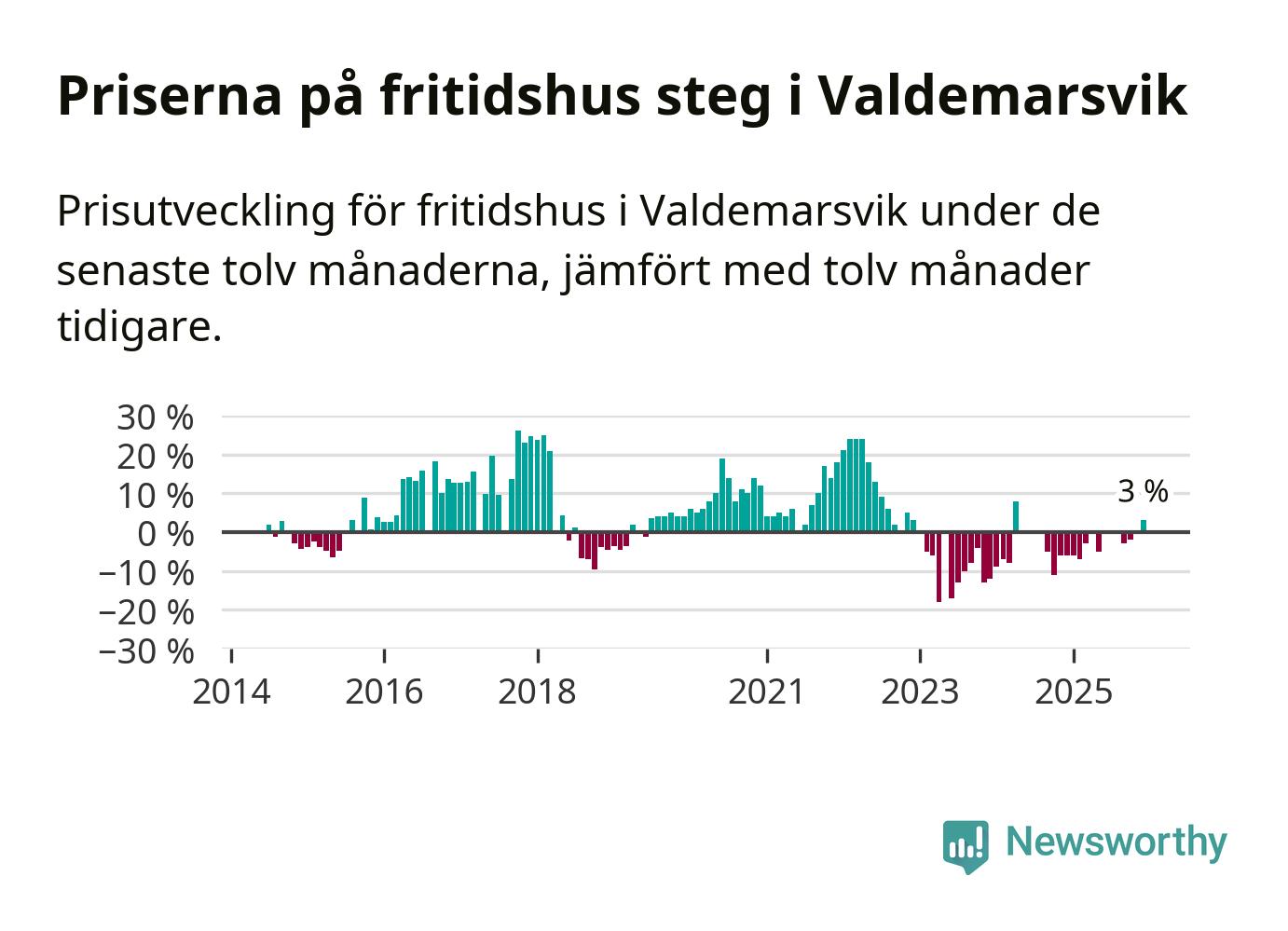 Priserna på fritidshus har gått upp i Valdemarsviks kommun. Medelpriset på försäljningarna under de senaste tolv månaderna visar på en uppgång med 3 procent.