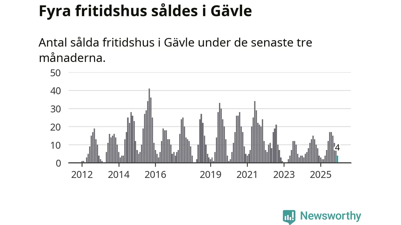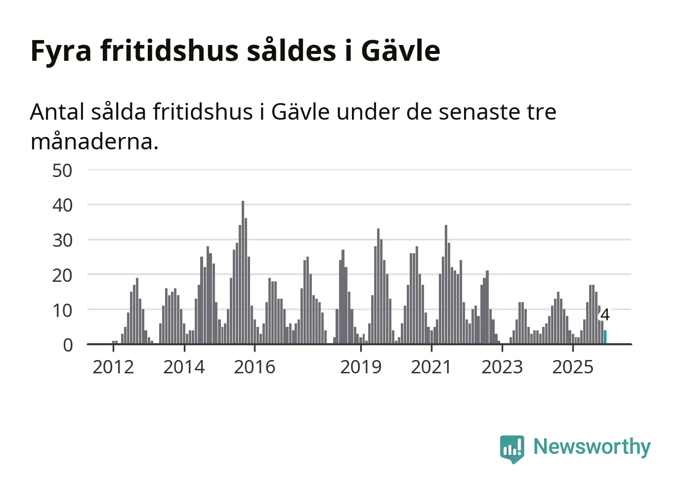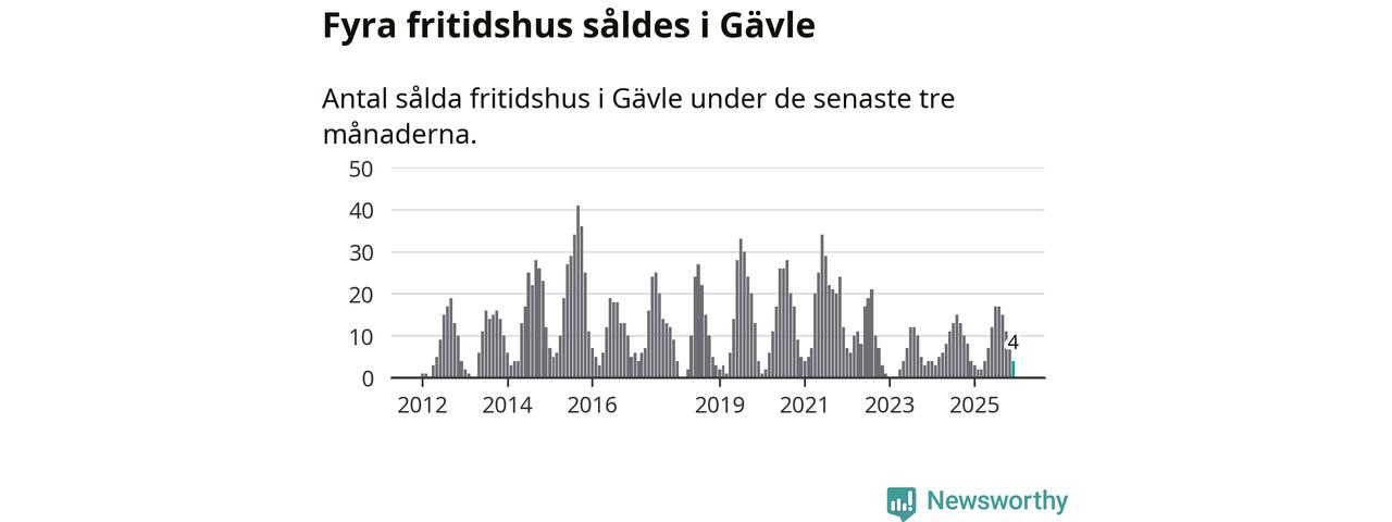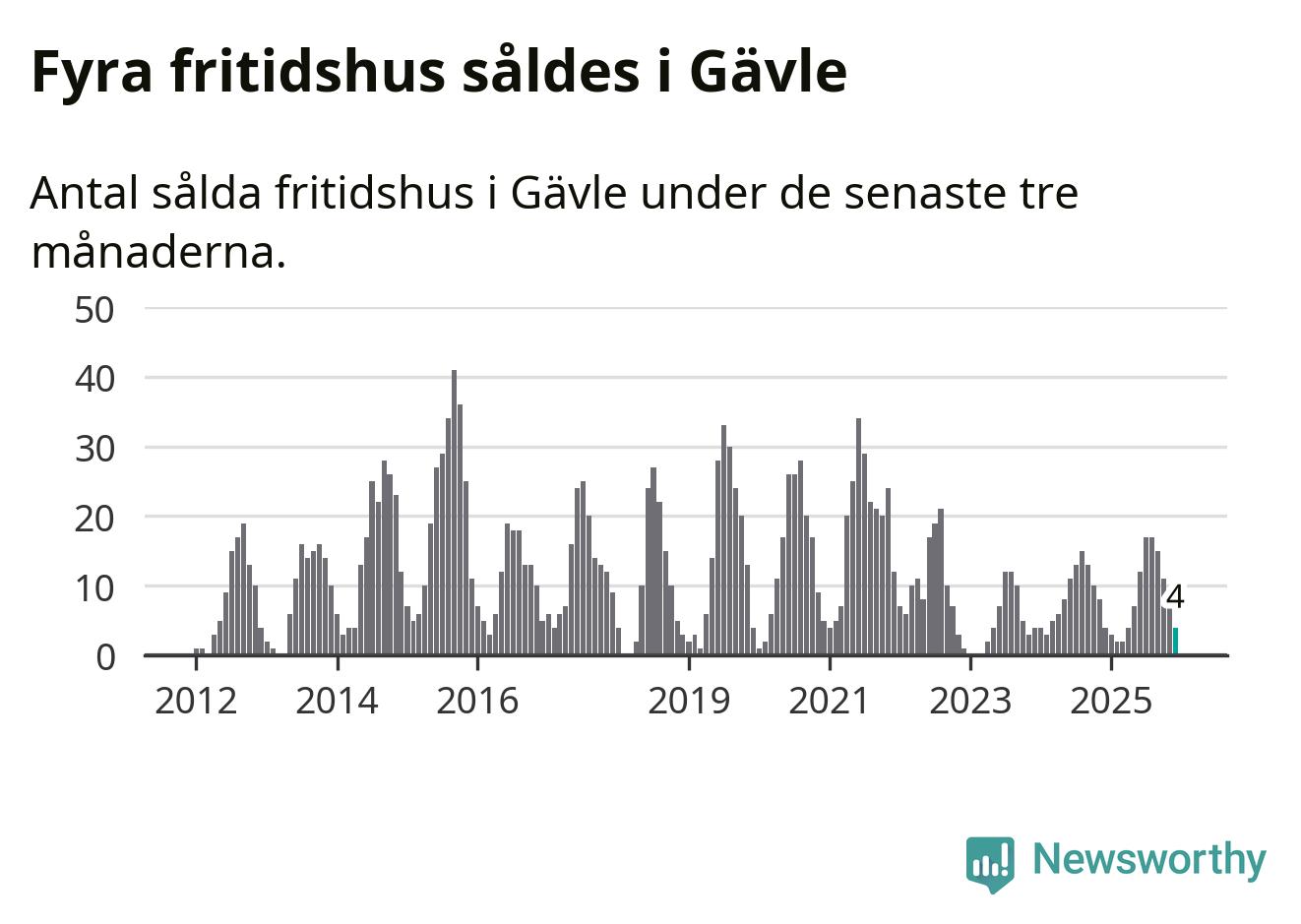Sammanlagt såldes fyra fritidshus i Gävle kommun mellan oktober 2025 och december 2025 till ett genomsnittligt pris på 2,7 miljoner kronor. I fjol gjordes fyra affärer vid den här tiden på året.