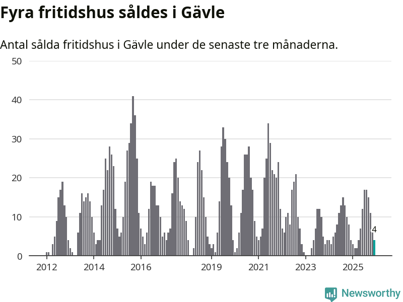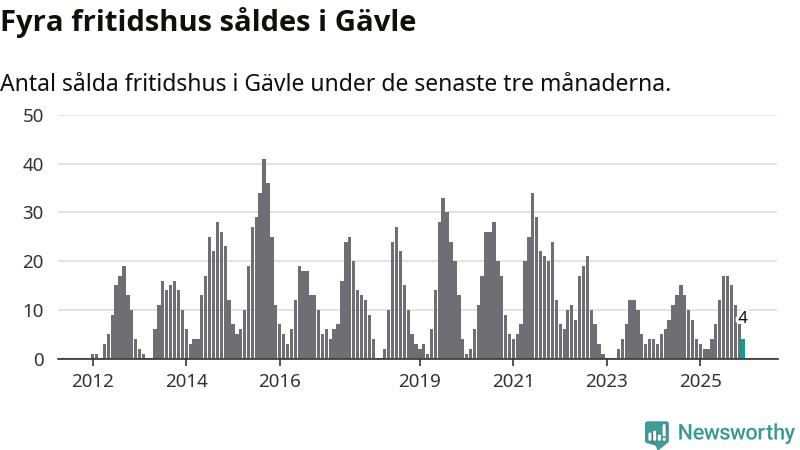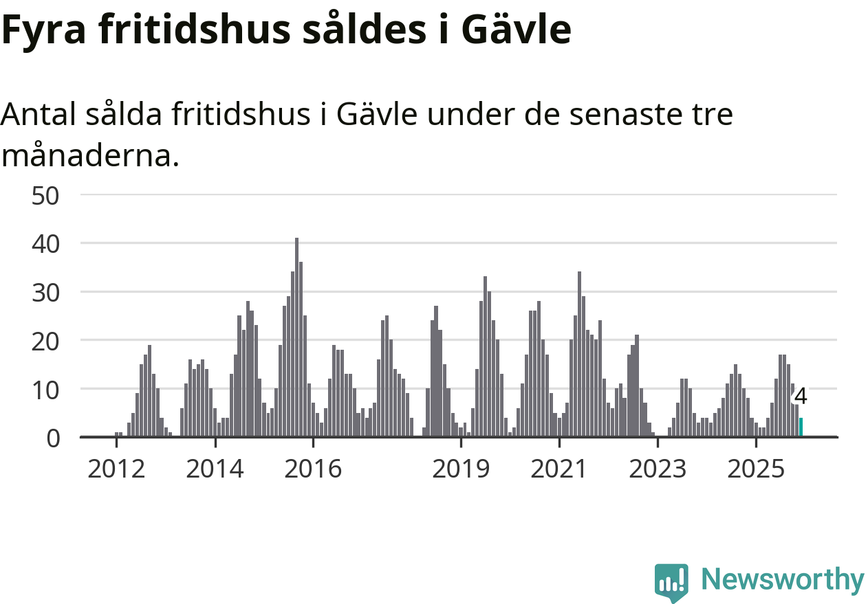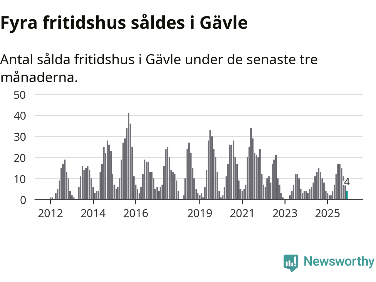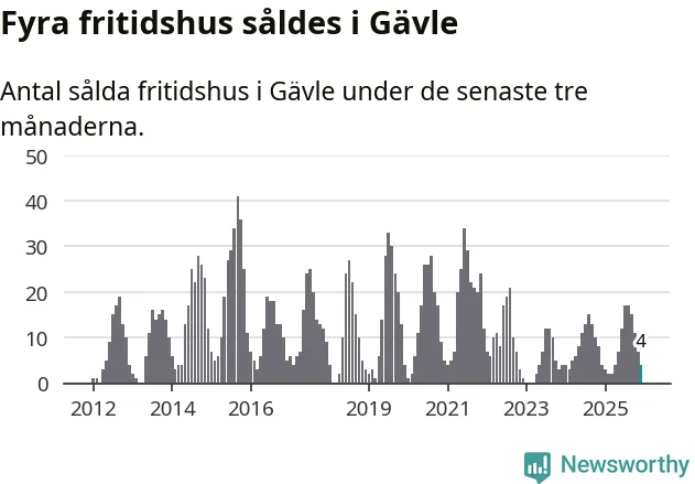 Sammanlagt såldes fyra fritidshus i Gävle kommun mellan oktober 2025 och december 2025 till ett genomsnittligt pris på 2,7 miljoner kronor. I fjol gjordes fyra affärer vid den här tiden på året.