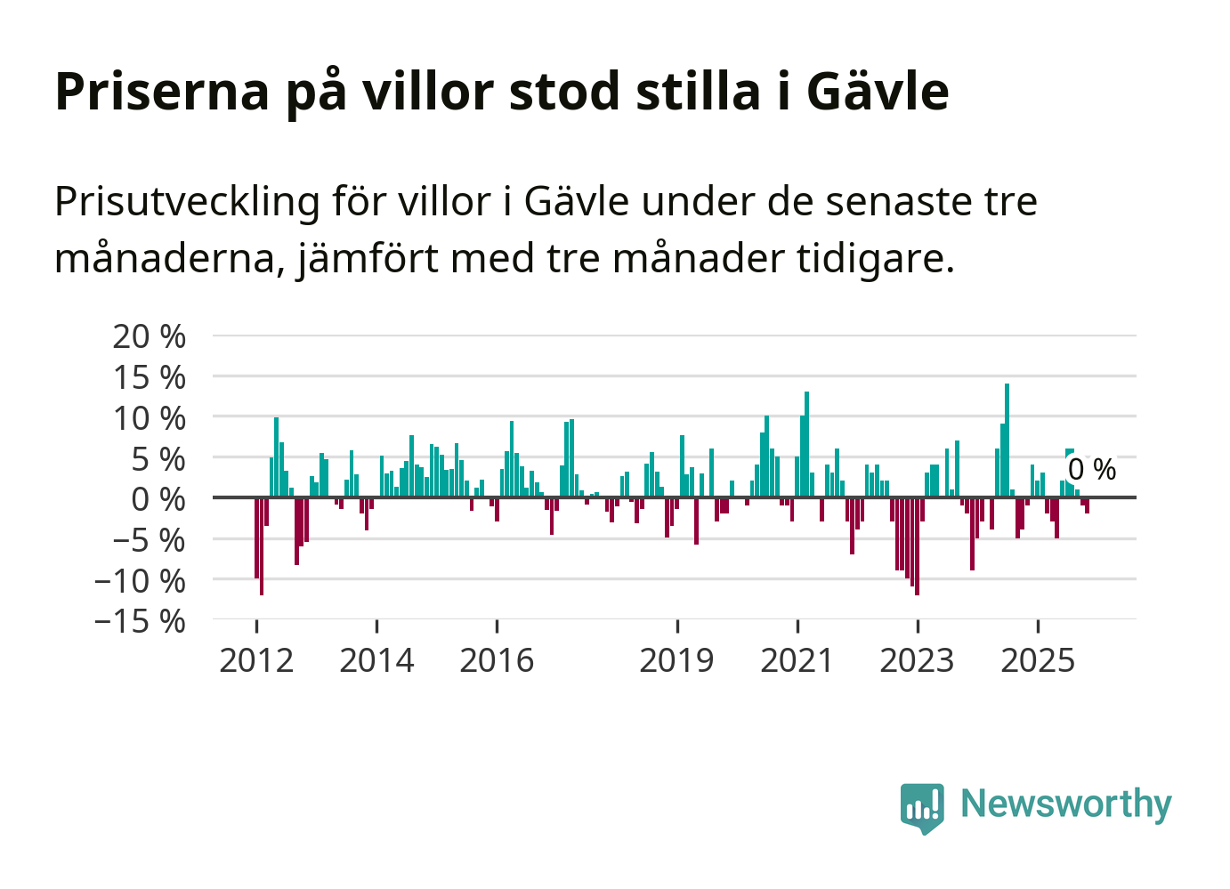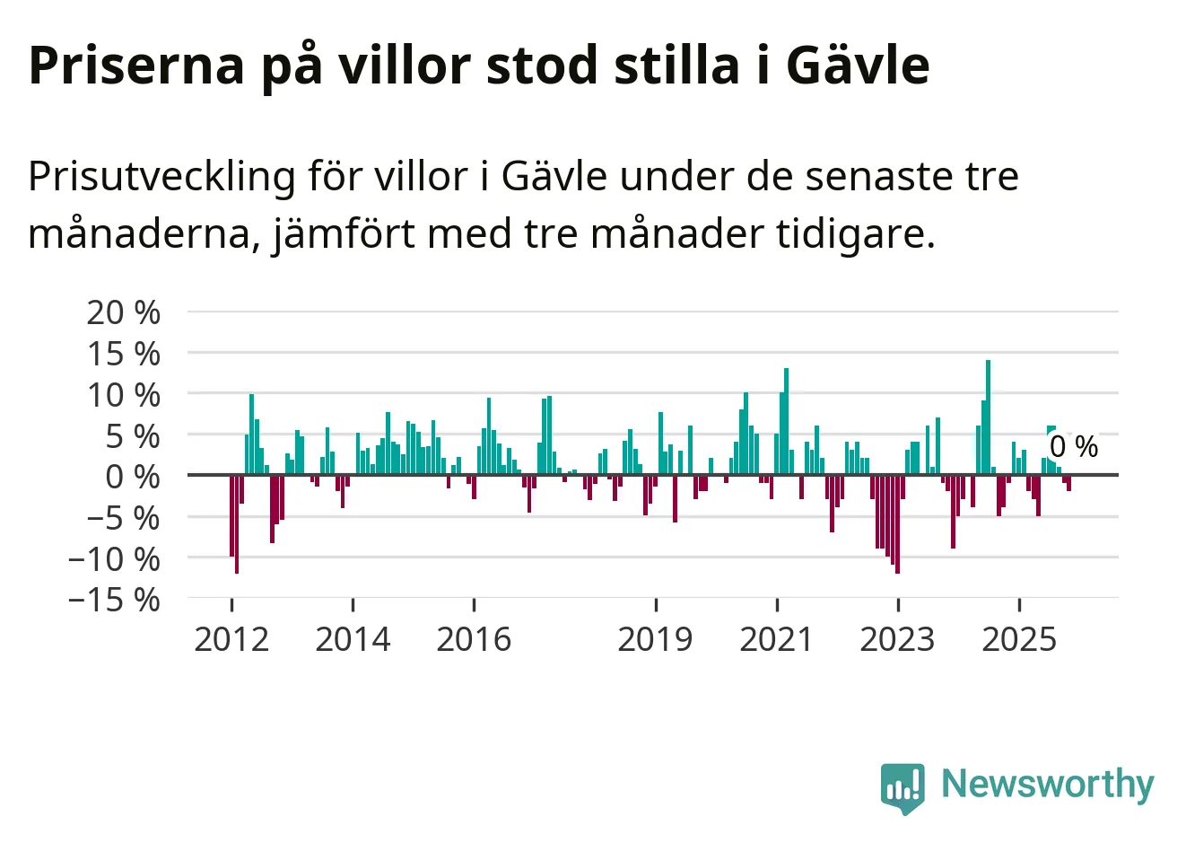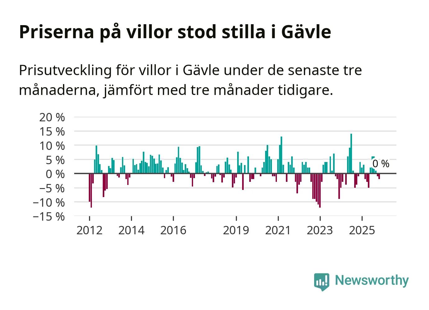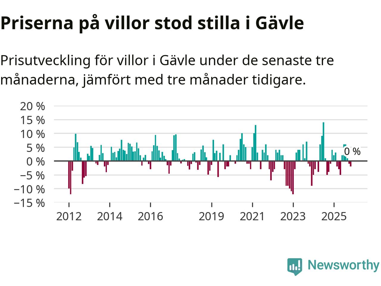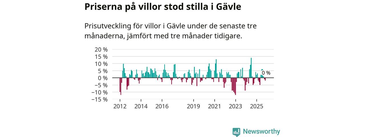 Villapriserna står i stort sett stilla i Gävle kommun. Medelpriset på de på försäljningarna under de senaste tre månaderna låg på samma nivå som för tre månader sedan.