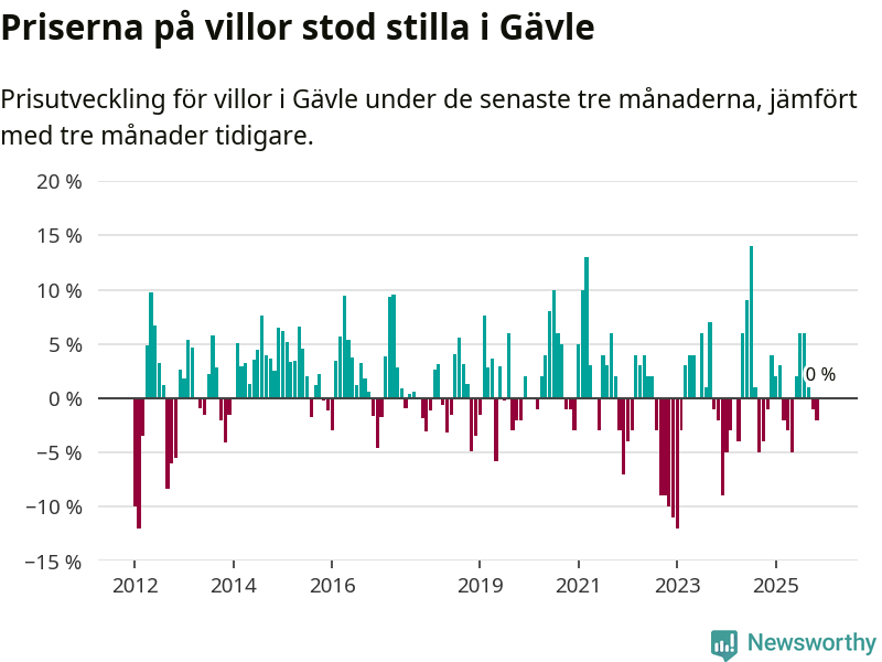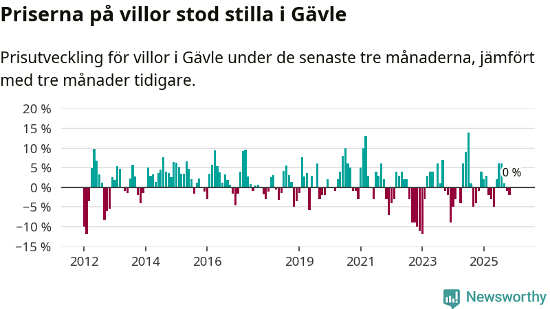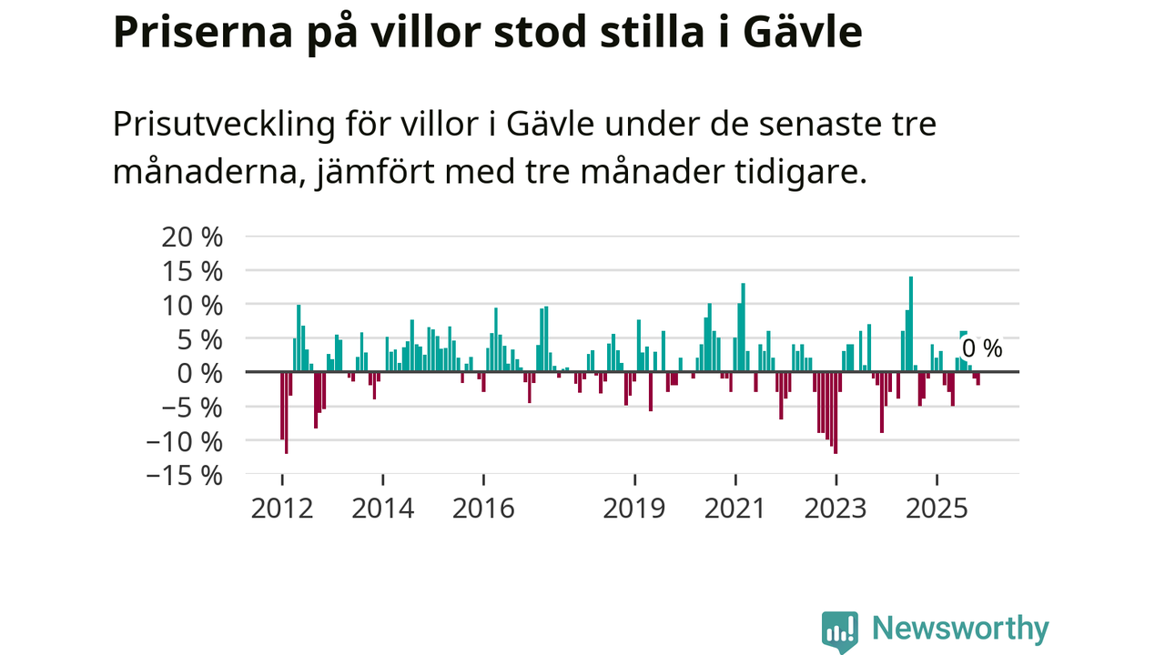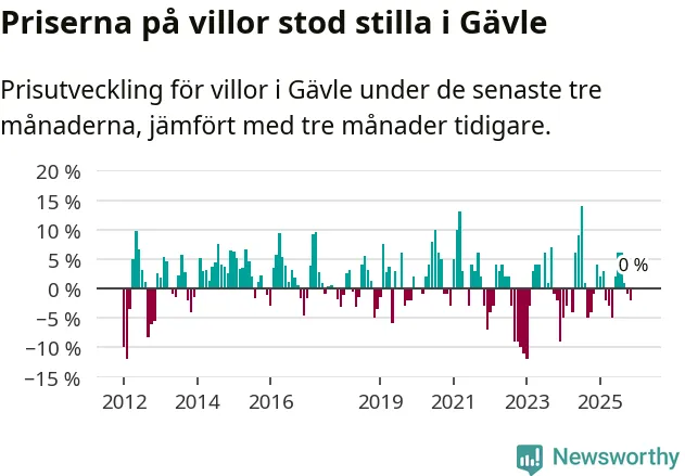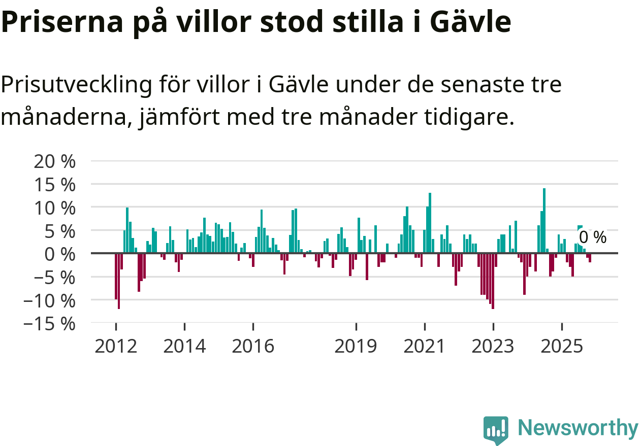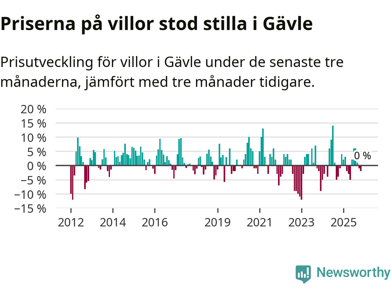 Villapriserna står i stort sett stilla i Gävle kommun. Medelpriset på de på försäljningarna under de senaste tre månaderna låg på samma nivå som för tre månader sedan.