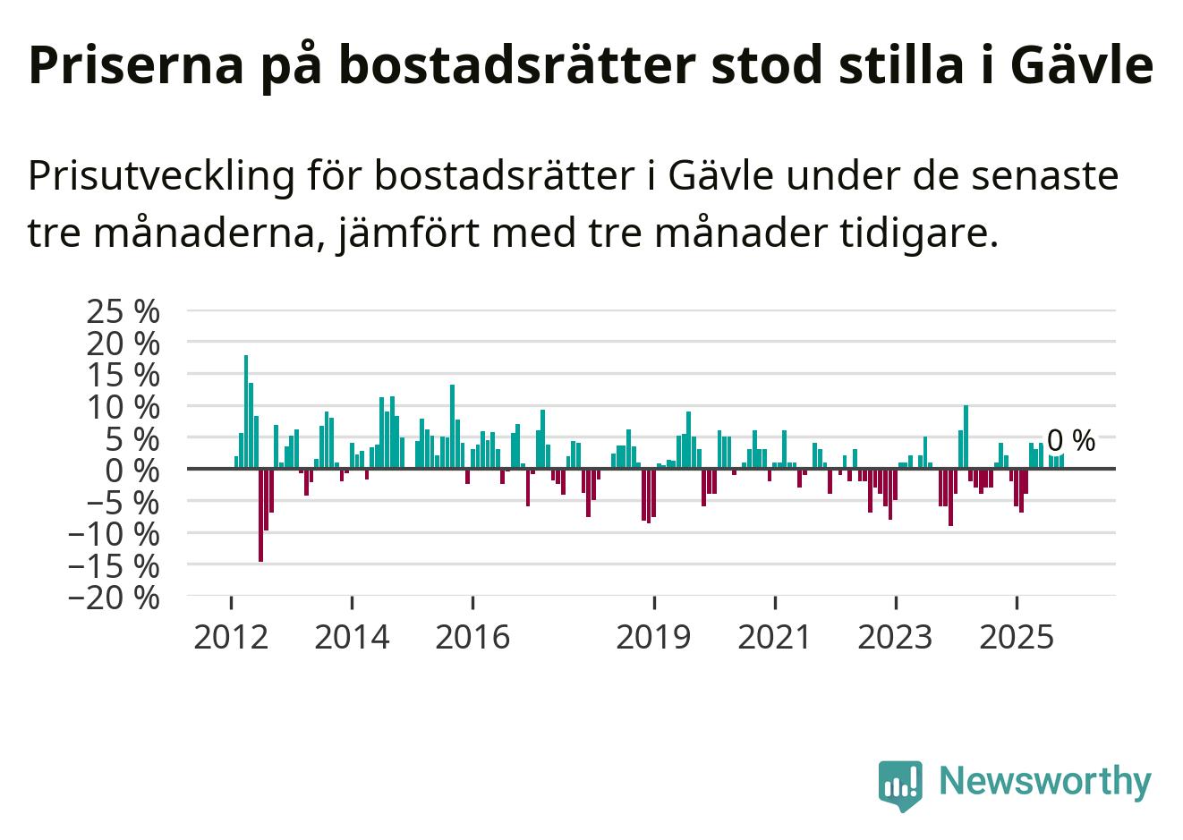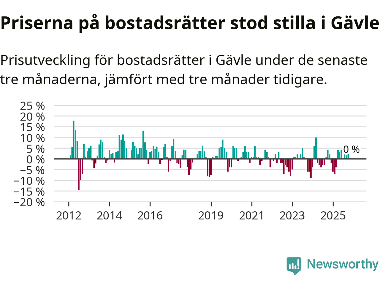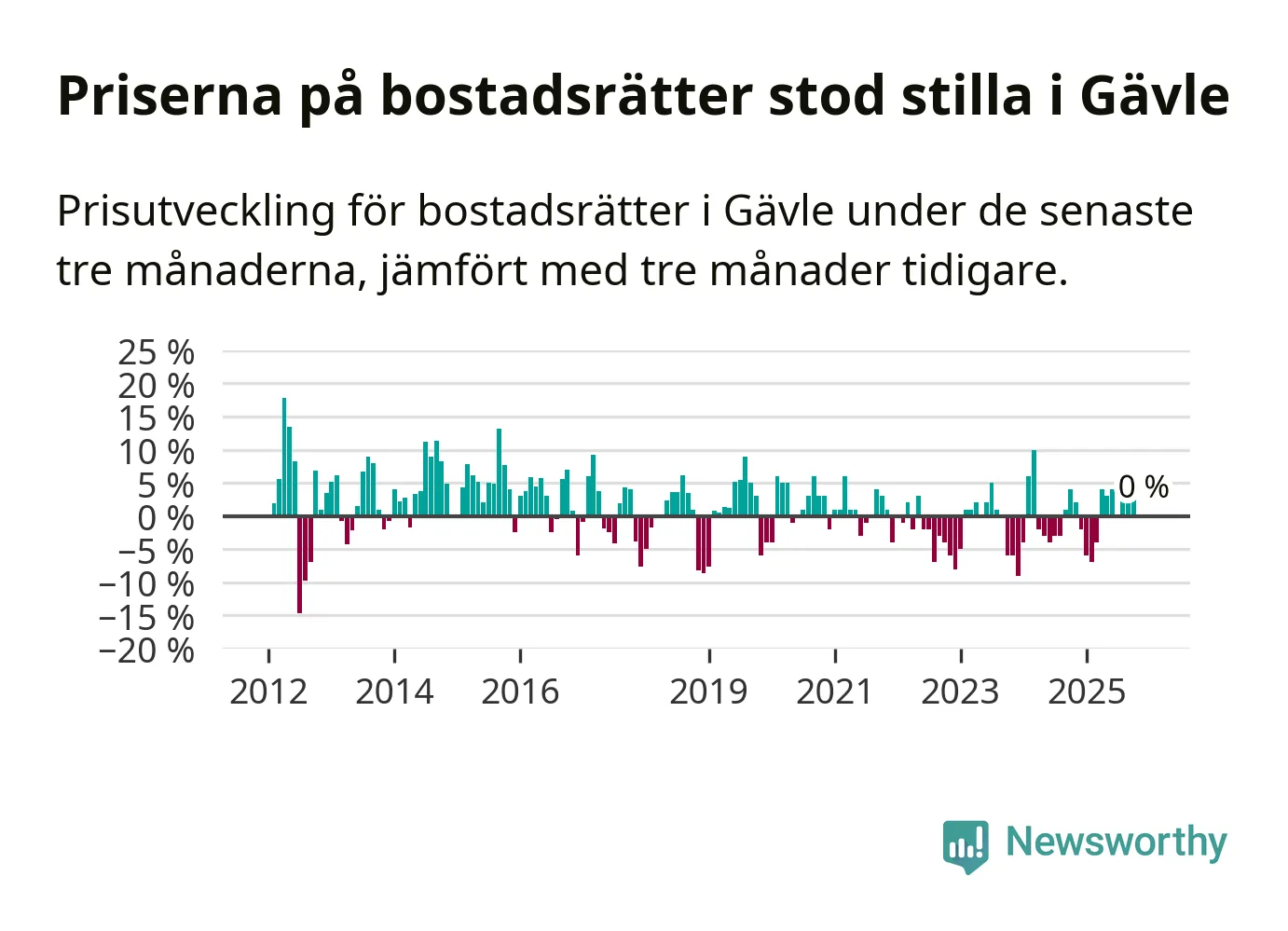 Priserna på bostadsrätter står i stort sett stilla i Gävle kommun. Medelpriset på de på försäljningarna under de senaste tre månaderna låg på samma nivå som för tre månader sedan.