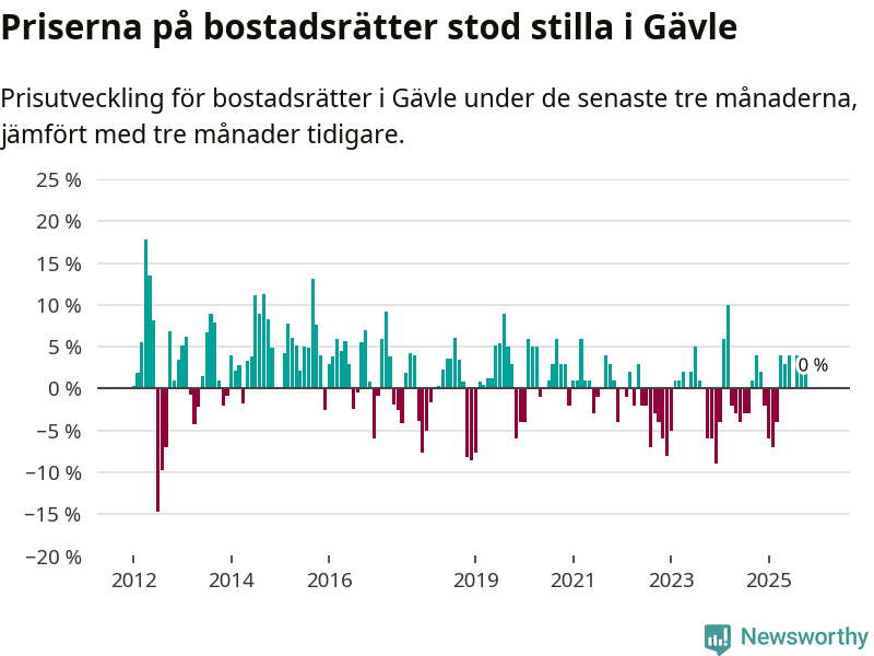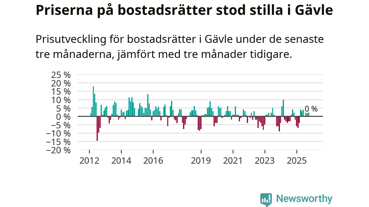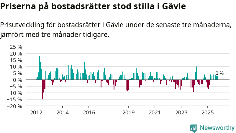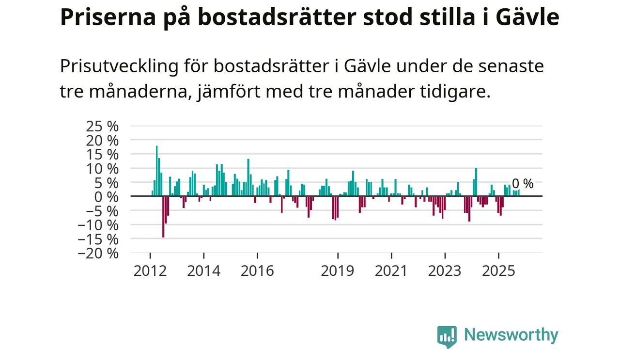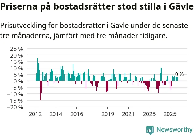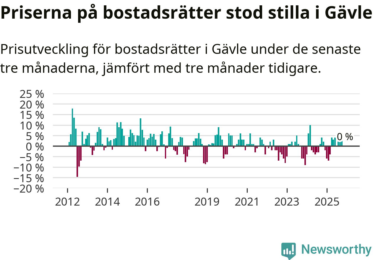 Priserna på bostadsrätter står i stort sett stilla i Gävle kommun. Medelpriset på de på försäljningarna under de senaste tre månaderna låg på samma nivå som för tre månader sedan.