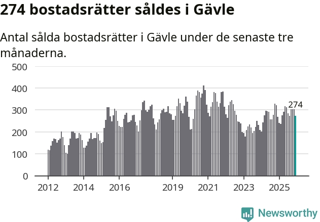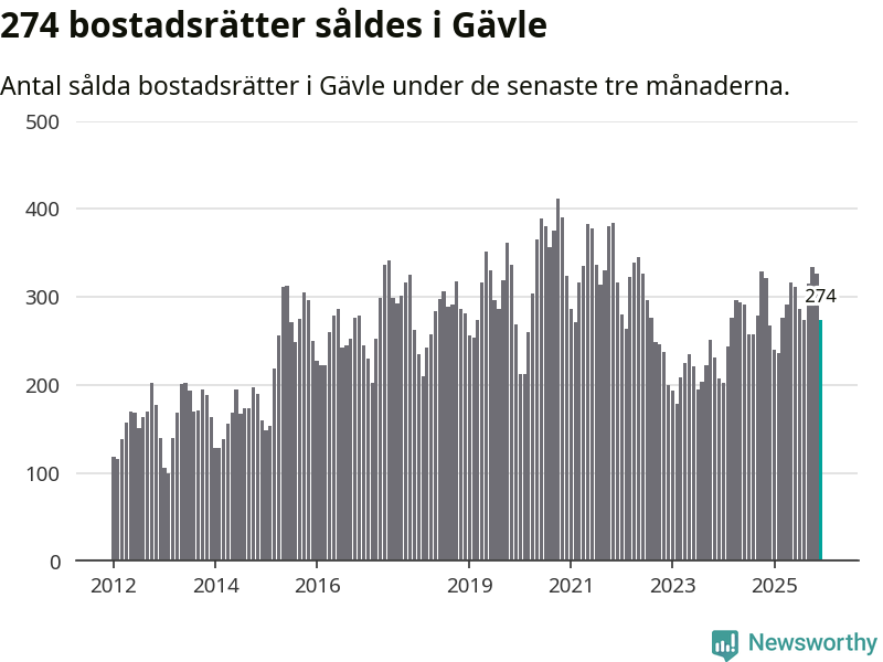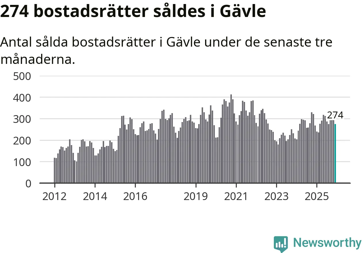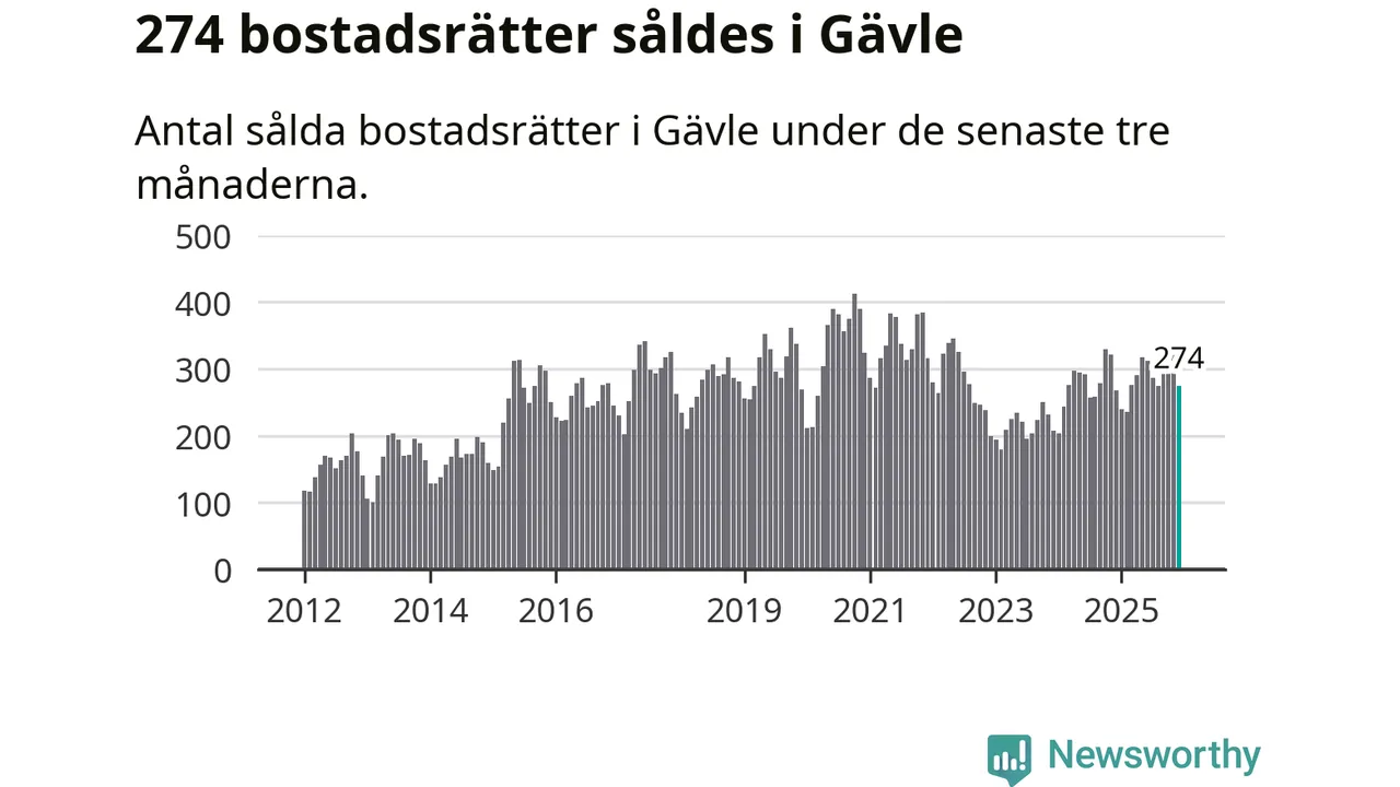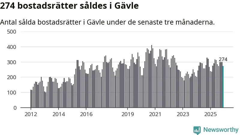 Sammanlagt såldes 274 bostadsrätter i Gävle kommun mellan oktober och december till ett genomsnittligt pris på 1,7 miljoner kronor. I fjol gjordes 268 affärer vid den här tiden på året.