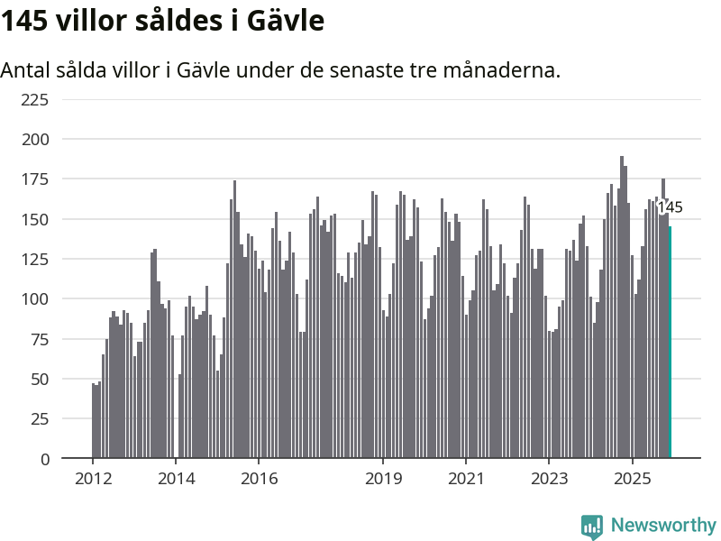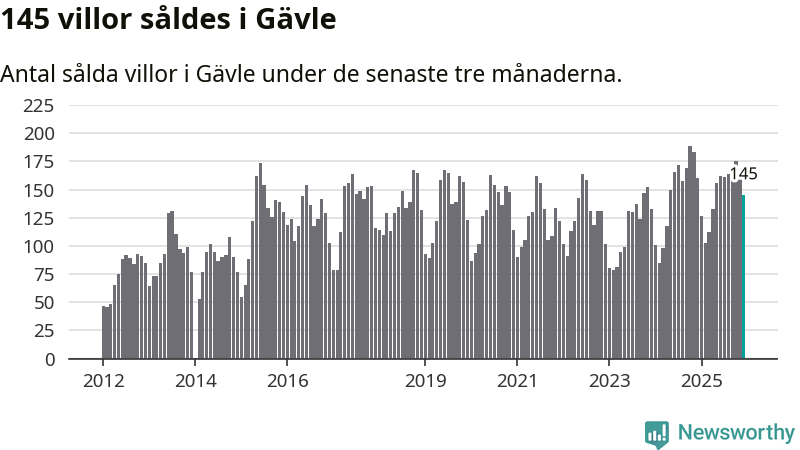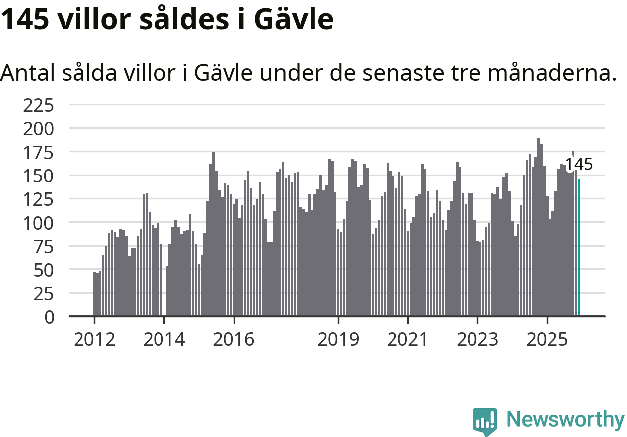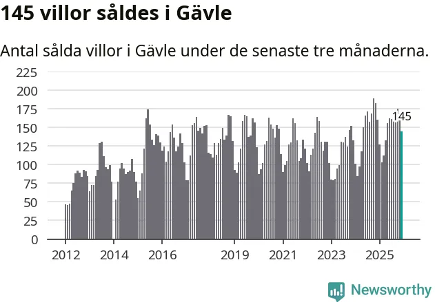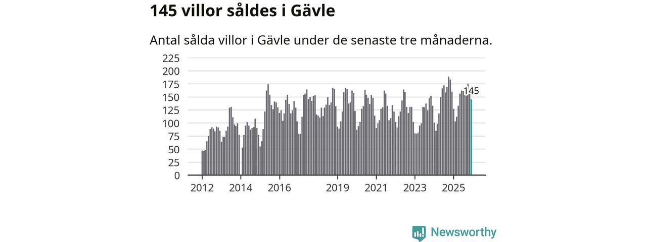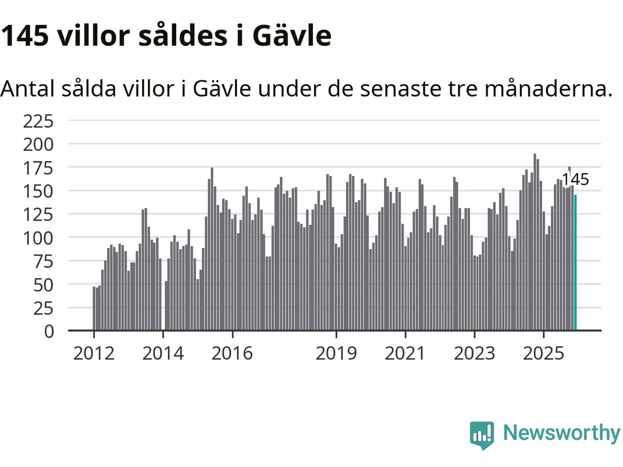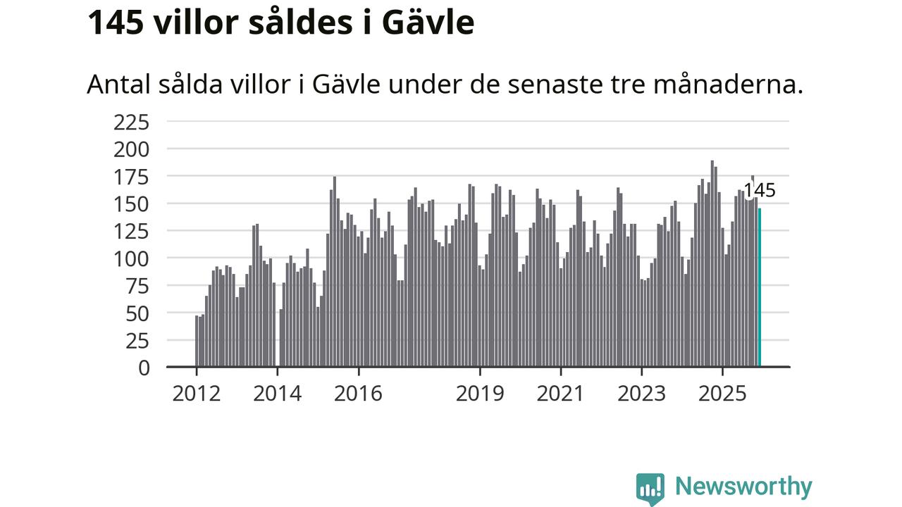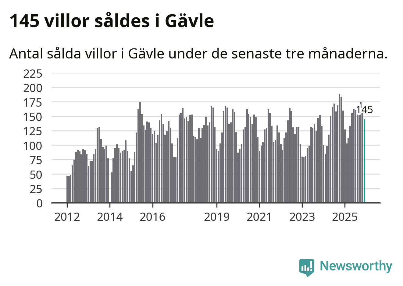 Sammanlagt såldes 145 villor i Gävle kommun mellan oktober och december till ett genomsnittligt pris på 3,3 miljoner kronor. I fjol gjordes 160 affärer vid den här tiden på året.