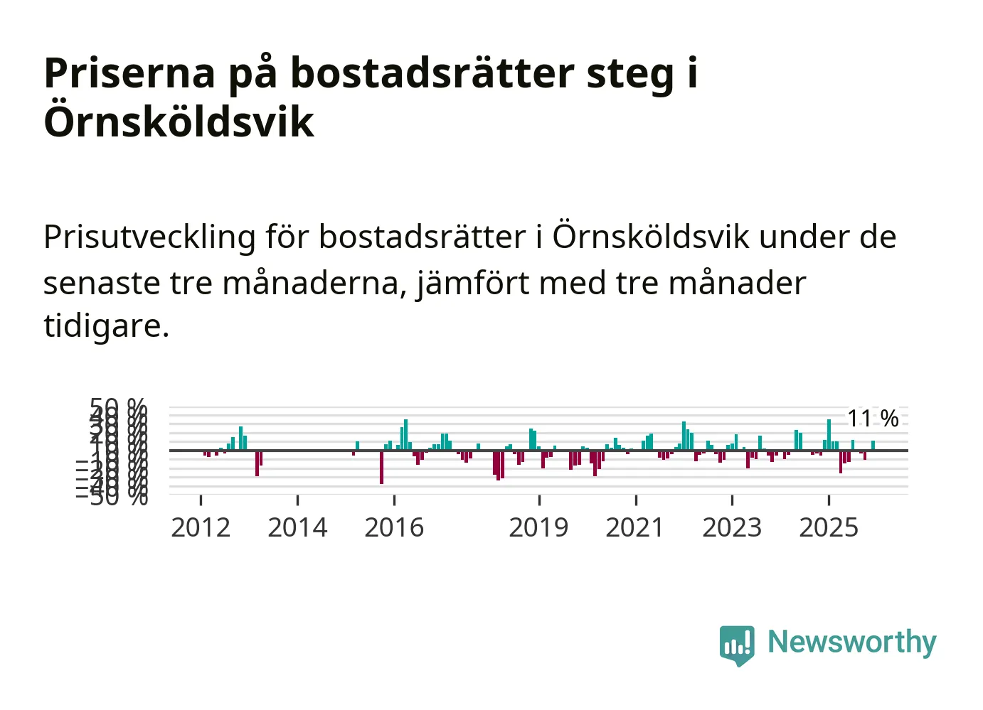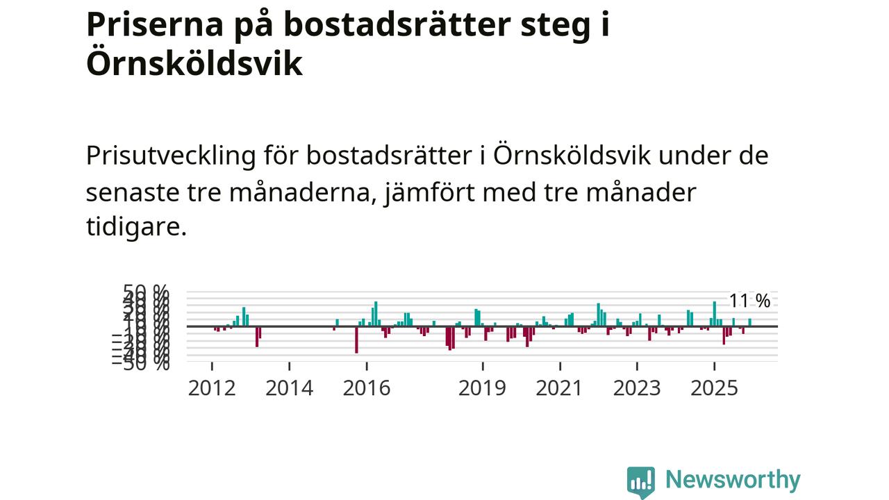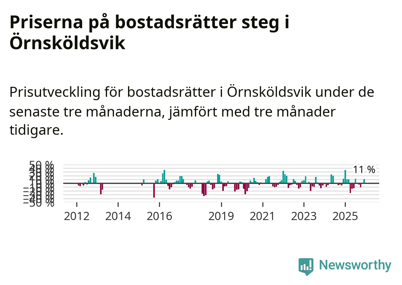 Priserna på bostadsrätter har gått upp i Örnsköldsviks kommun. Medelpriset på försäljningarna under de senaste tre månaderna visar på en uppgång med 11 procent.