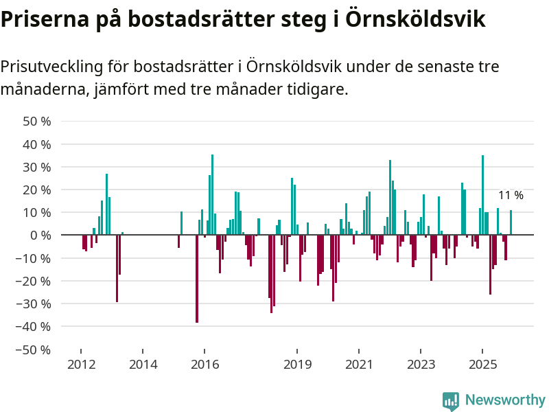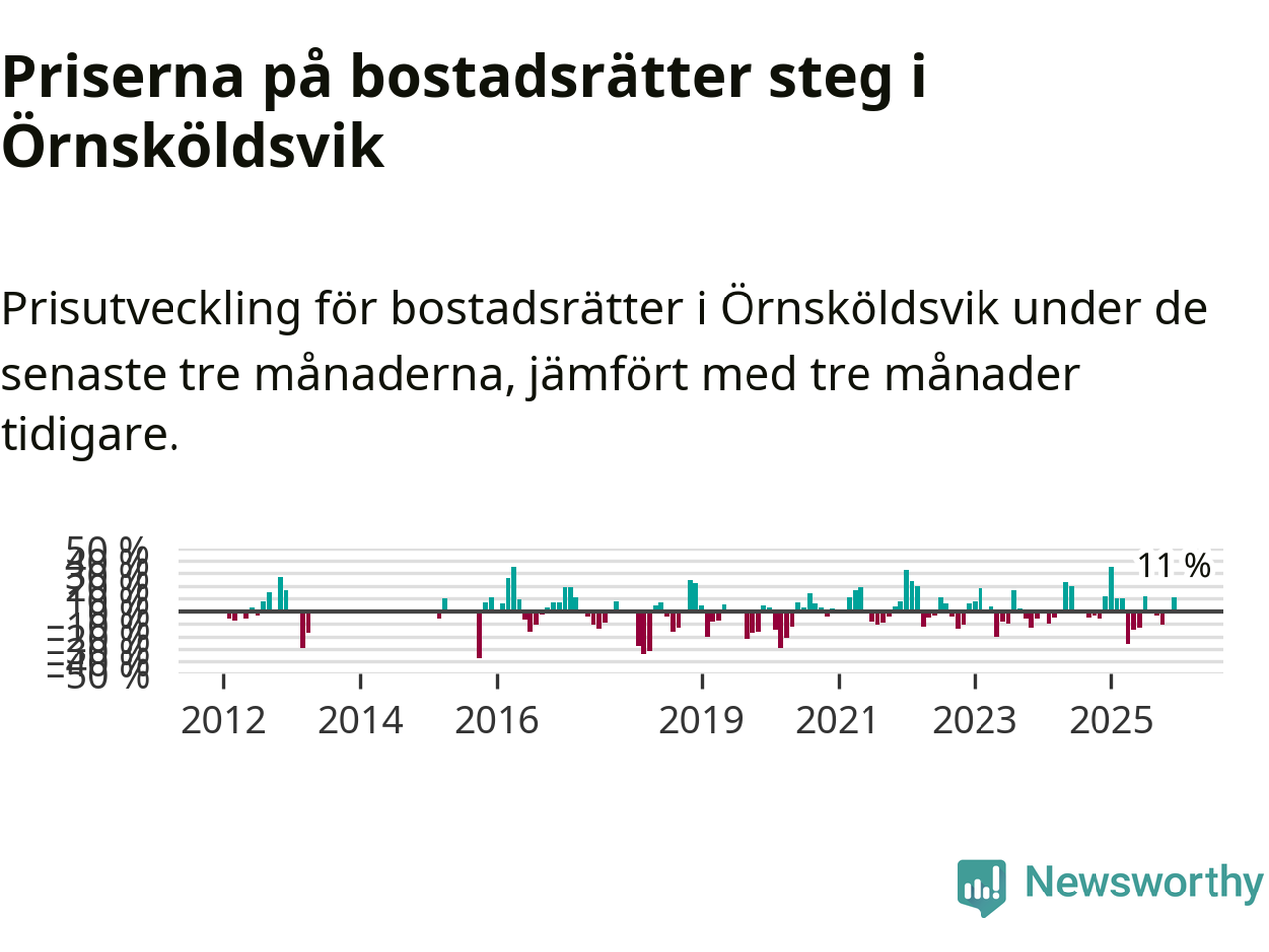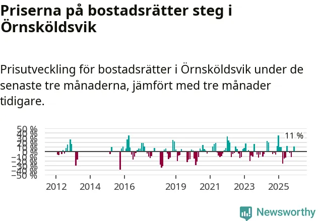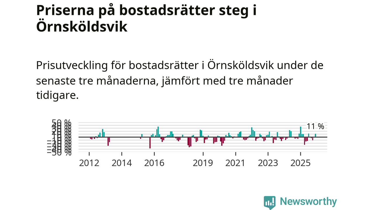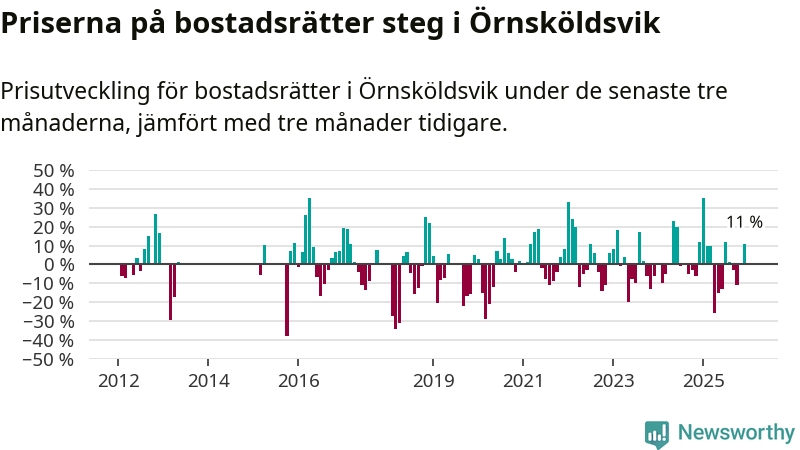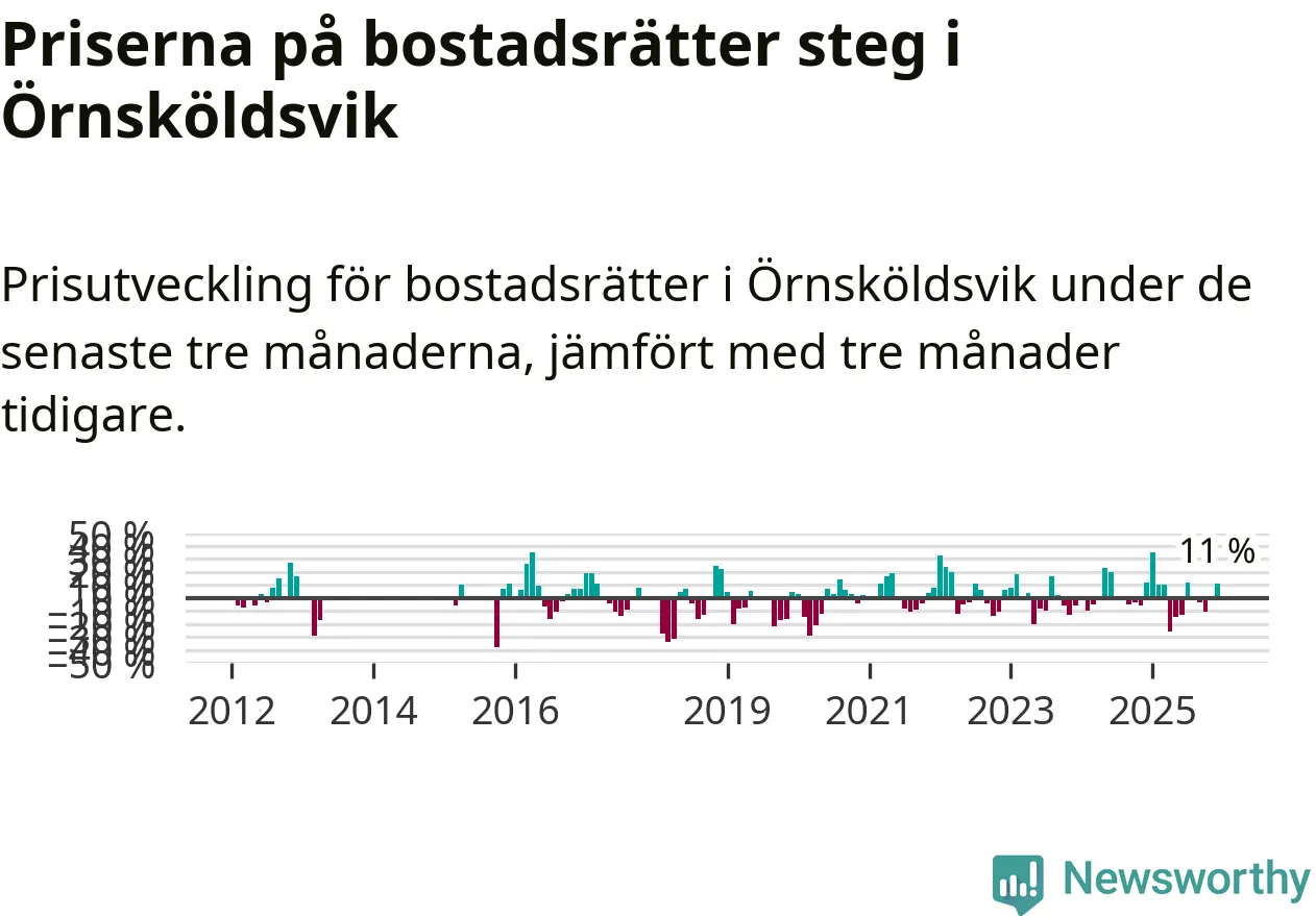 Priserna på bostadsrätter har gått upp i Örnsköldsviks kommun. Medelpriset på försäljningarna under de senaste tre månaderna visar på en uppgång med 11 procent.