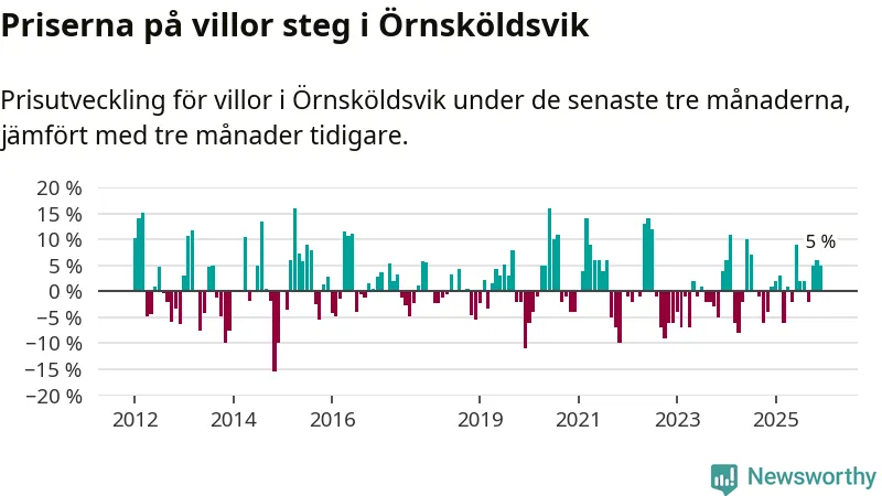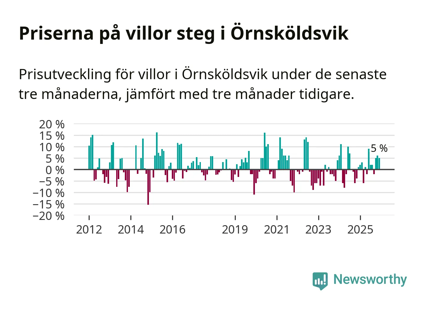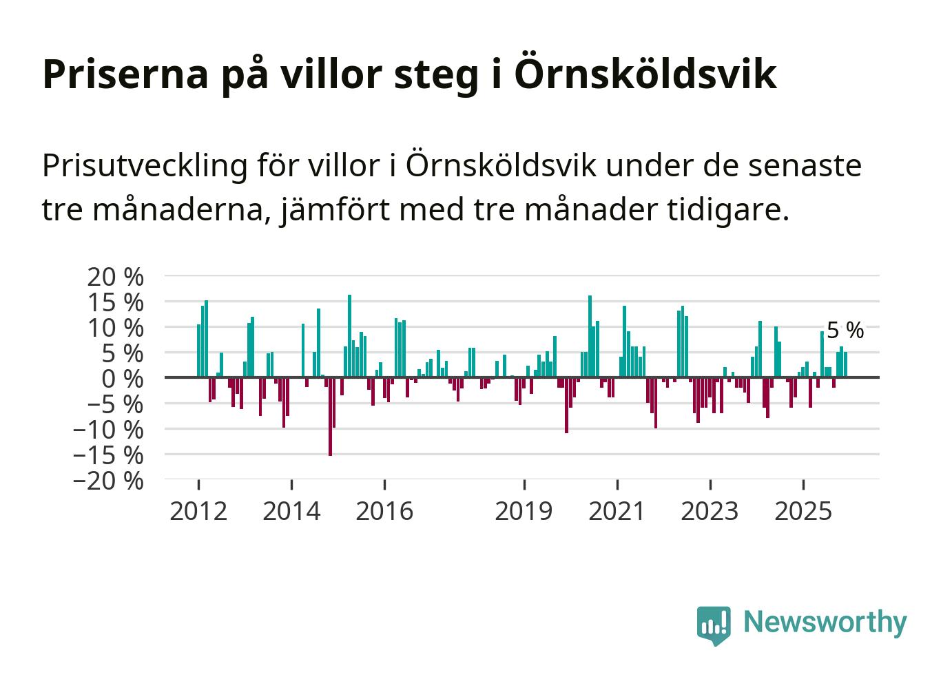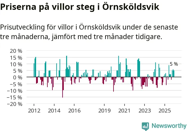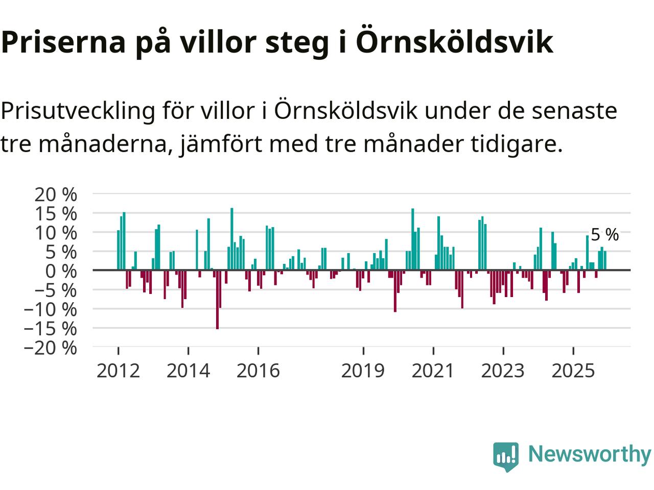 Villapriserna har gått upp i Örnsköldsviks kommun. Medelpriset på försäljningarna under de senaste tre månaderna visar på en uppgång med 5 procent.