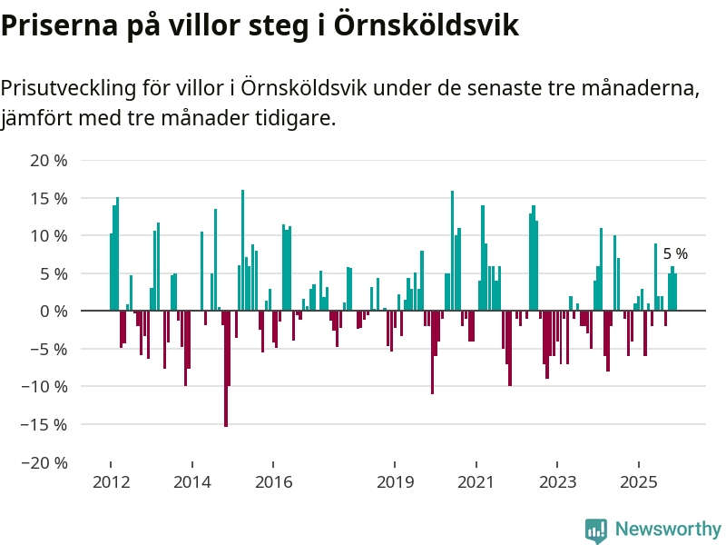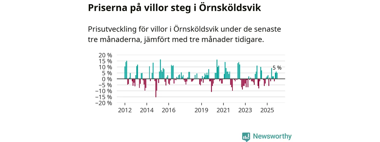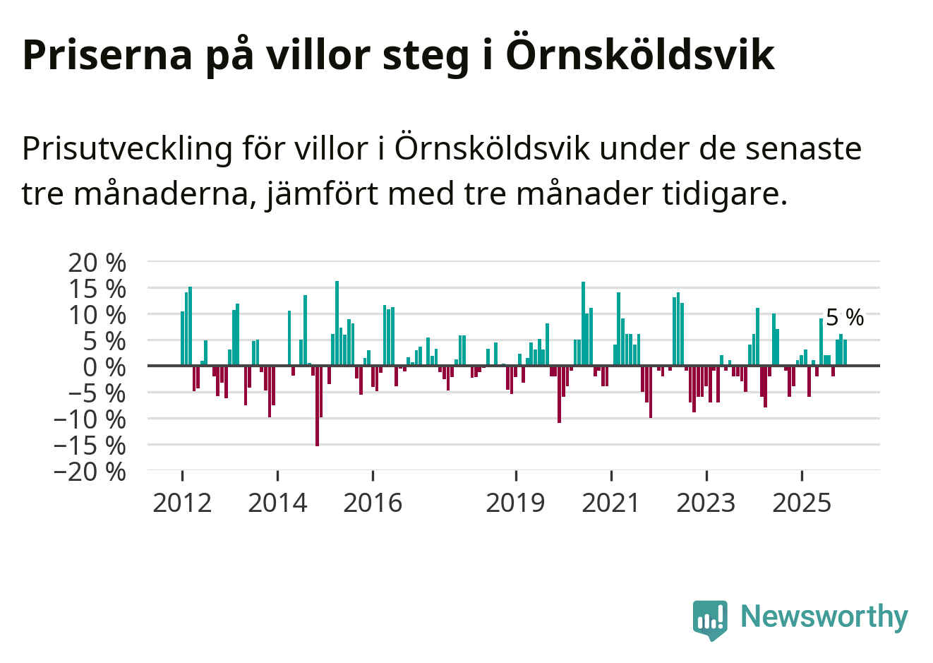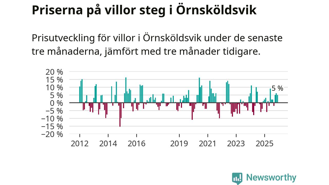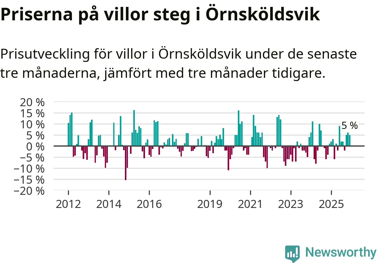 Villapriserna har gått upp i Örnsköldsviks kommun. Medelpriset på försäljningarna under de senaste tre månaderna visar på en uppgång med 5 procent.