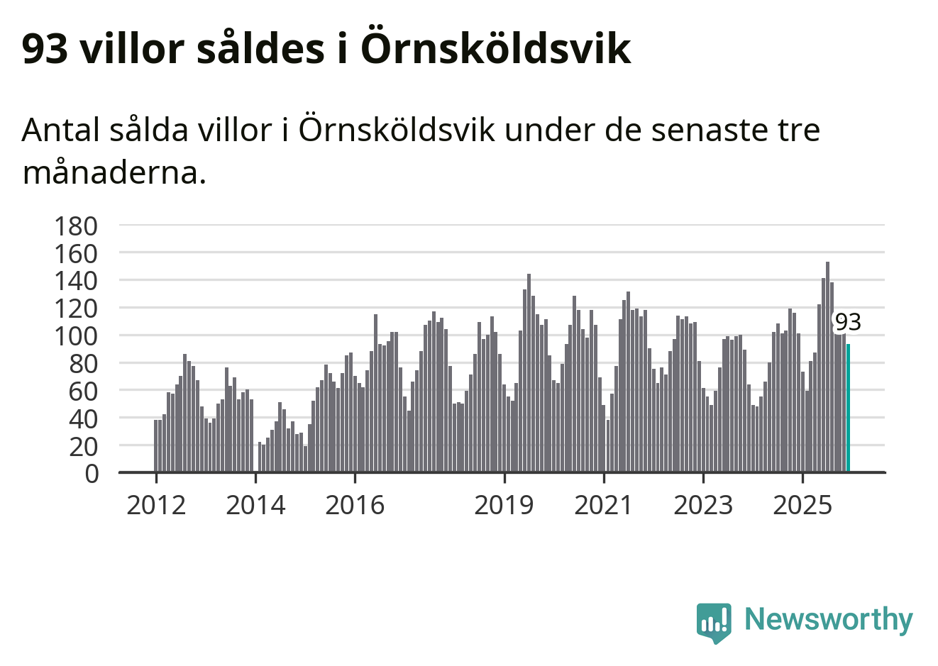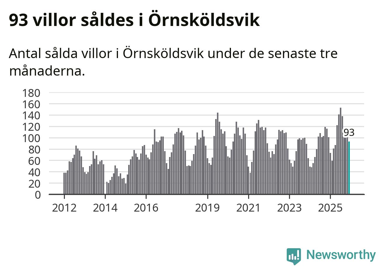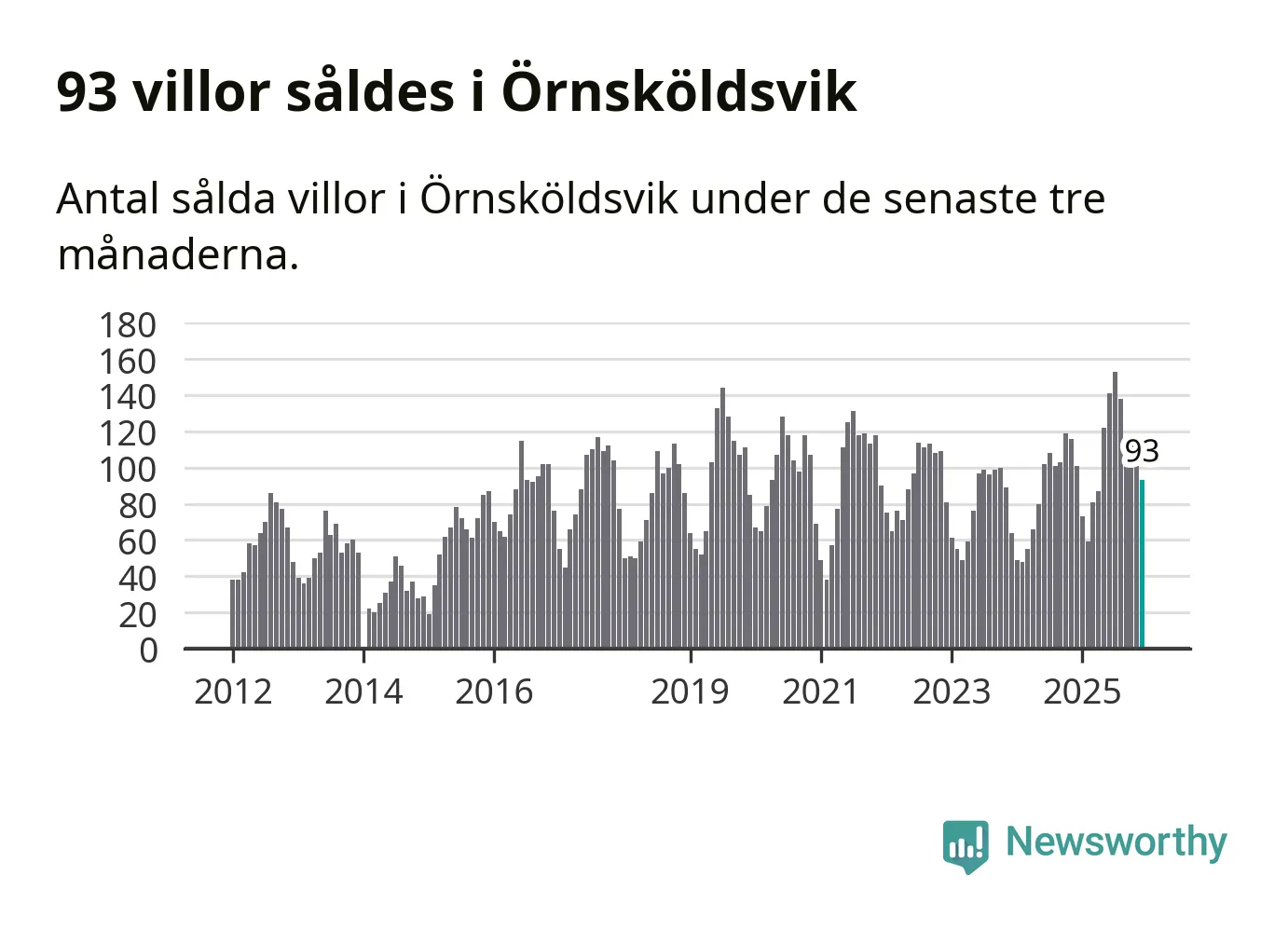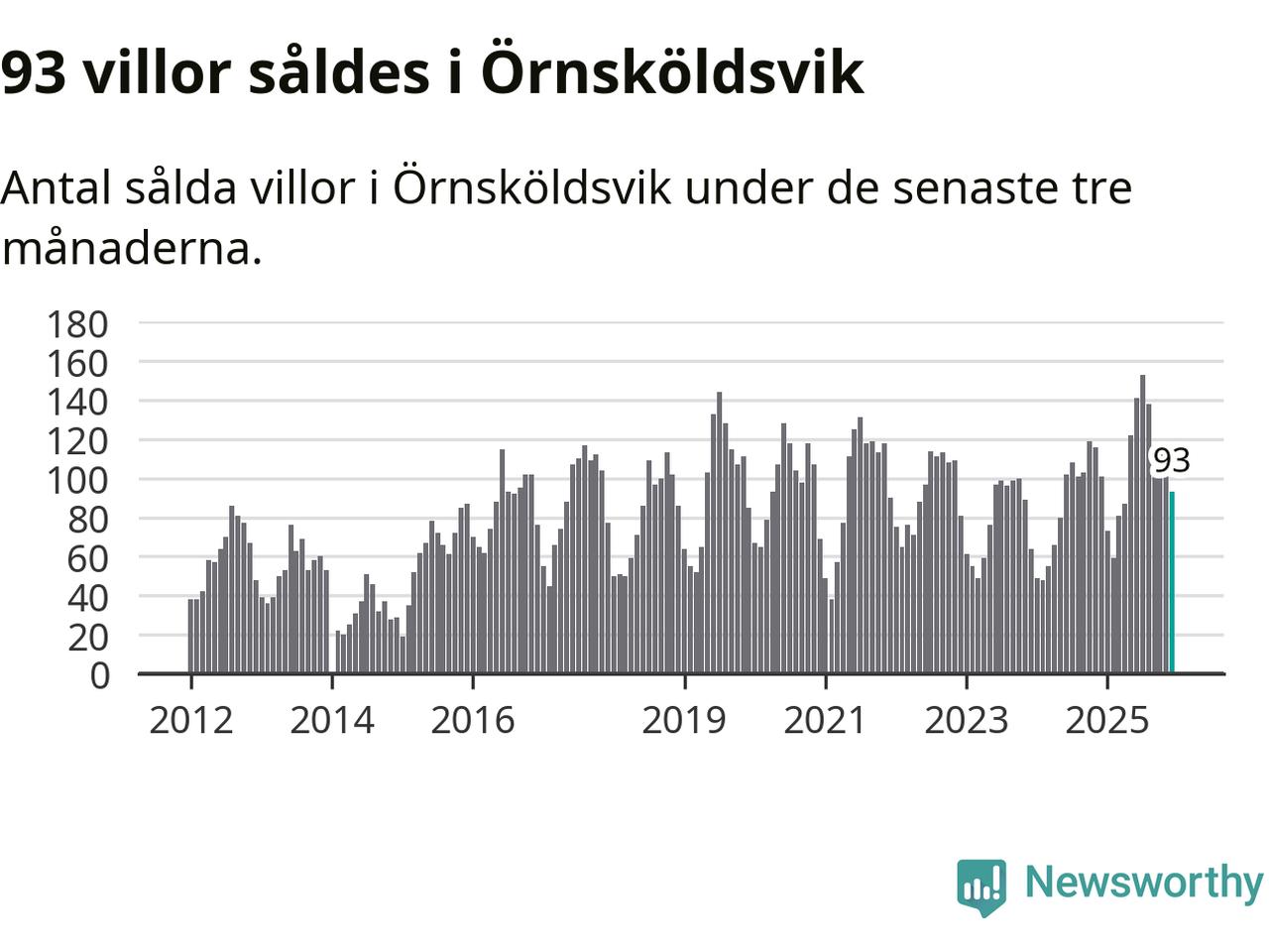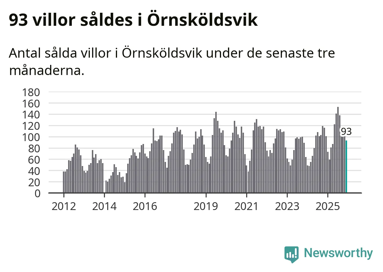Sammanlagt såldes 93 villor i Örnsköldsviks kommun mellan oktober och december till ett genomsnittligt pris på 1,5 miljoner kronor. I fjol gjordes 101 affärer vid den här tiden på året.