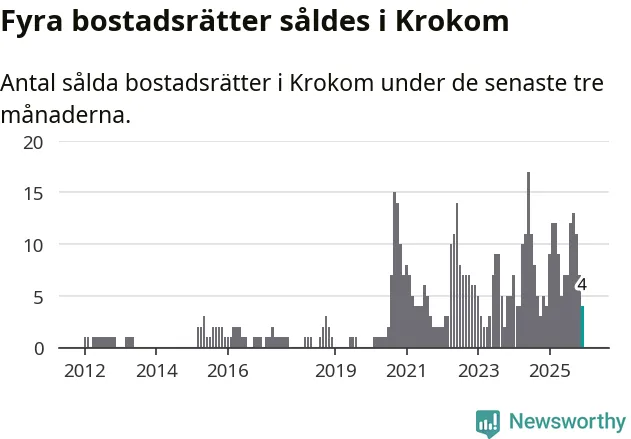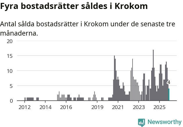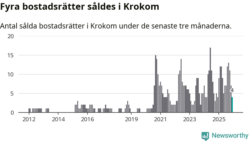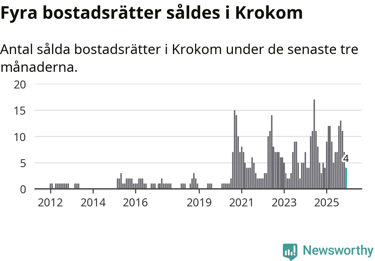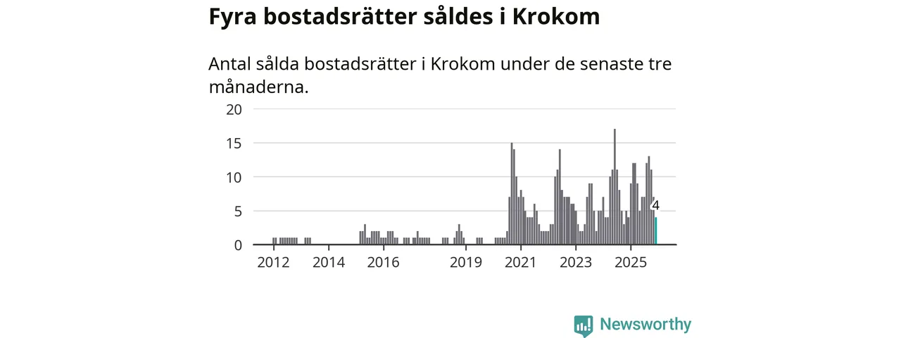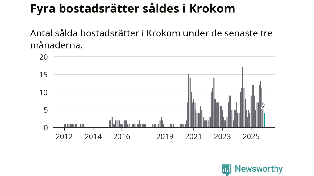 Mellan oktober och december gjordes sammanlagt fyra affärer med bostadsrätter i Krokoms kommun. Det är lika många affärer som vid motsvarande tid i fjol.