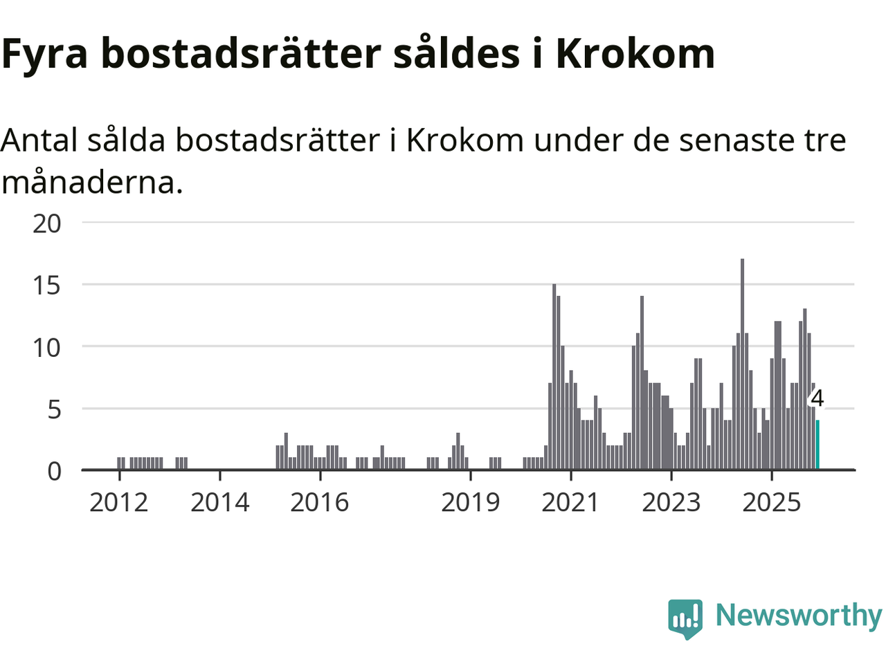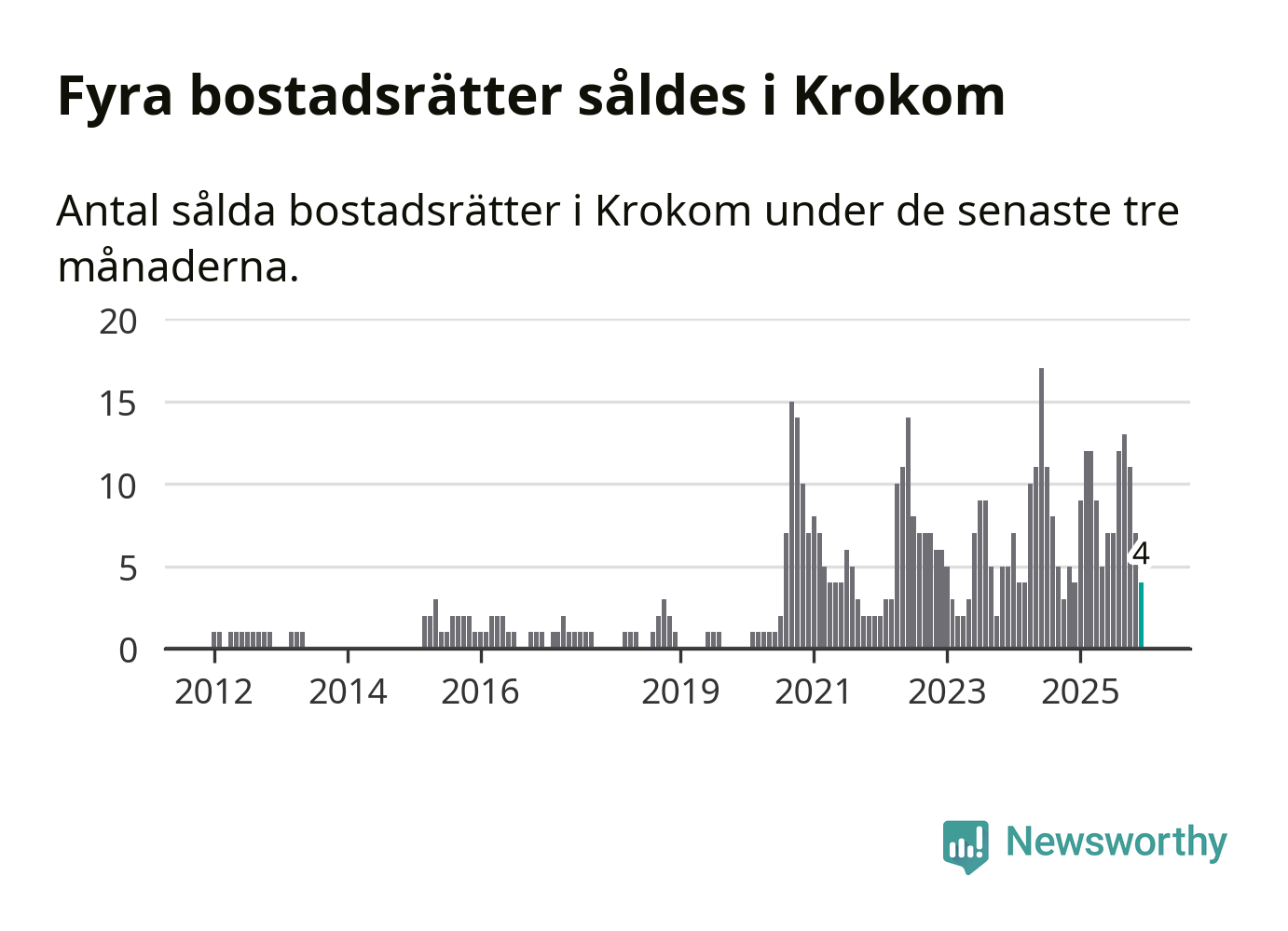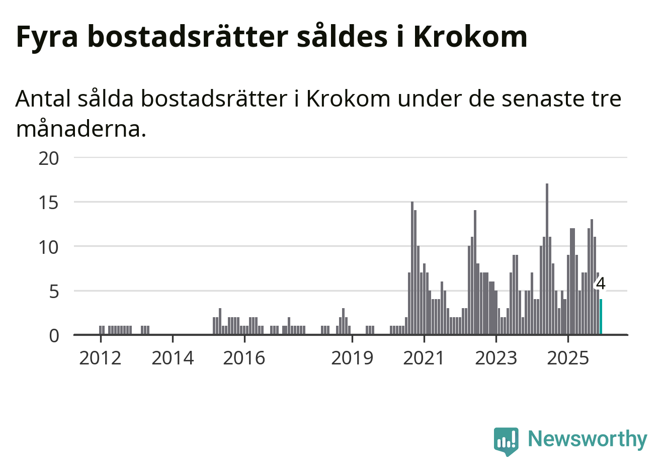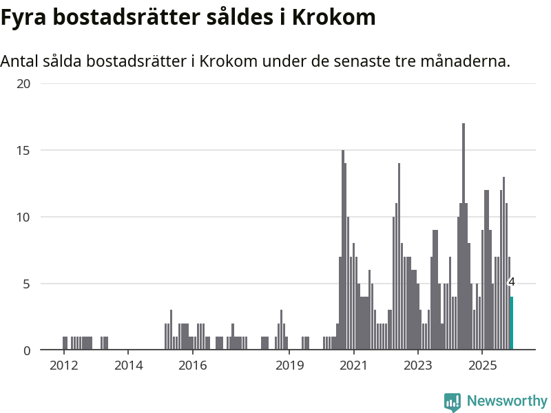 Mellan oktober och december gjordes sammanlagt fyra affärer med bostadsrätter i Krokoms kommun. Det är lika många affärer som vid motsvarande tid i fjol.