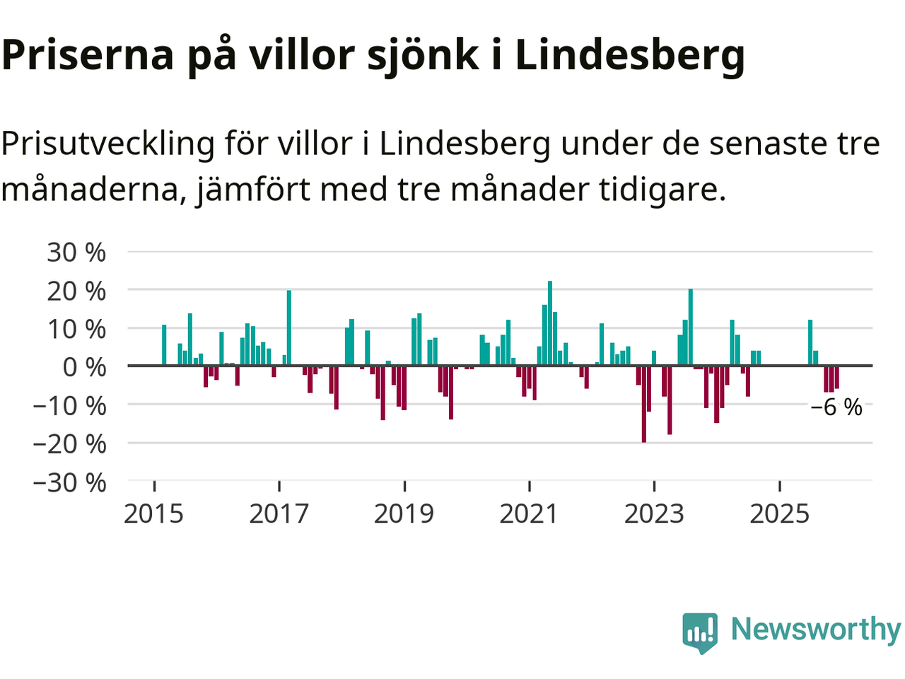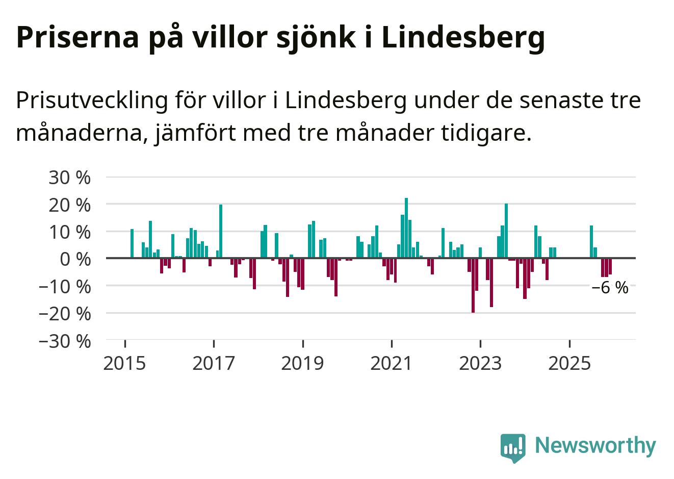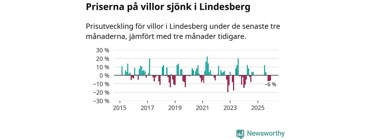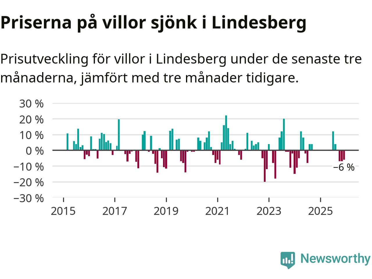 Villapriserna har gått ner i Lindesbergs kommun. Medelpriset på försäljningarna under de senaste tre månaderna visar på en nedgång med 6 procent.