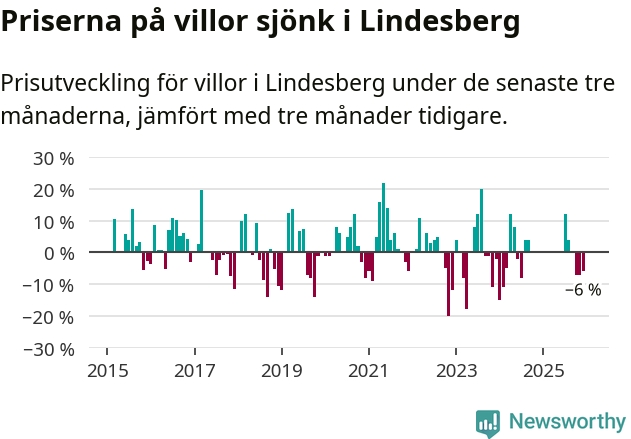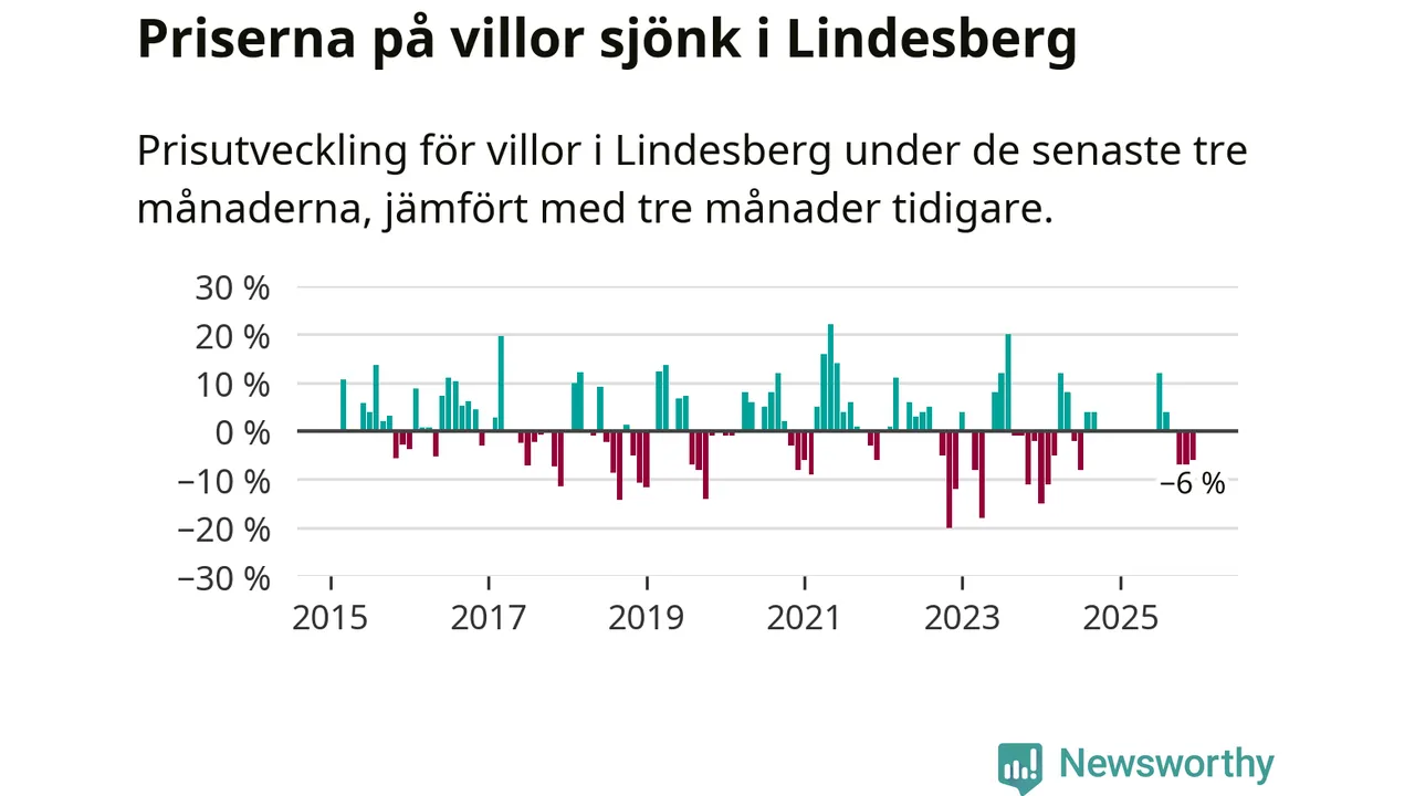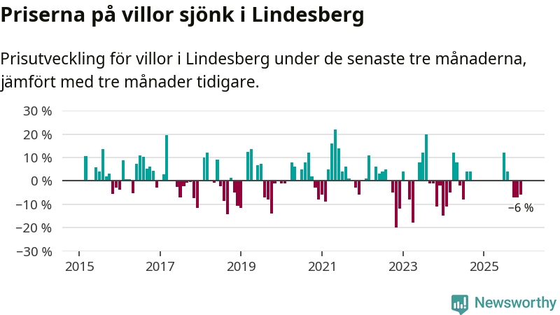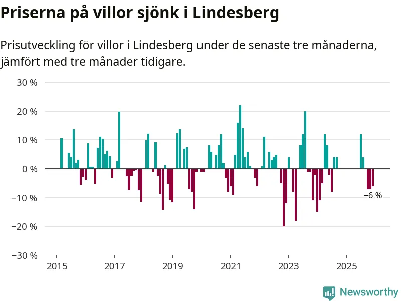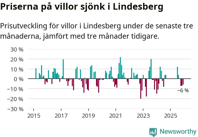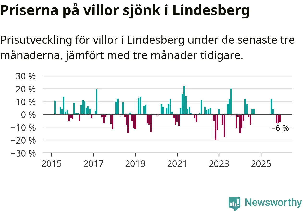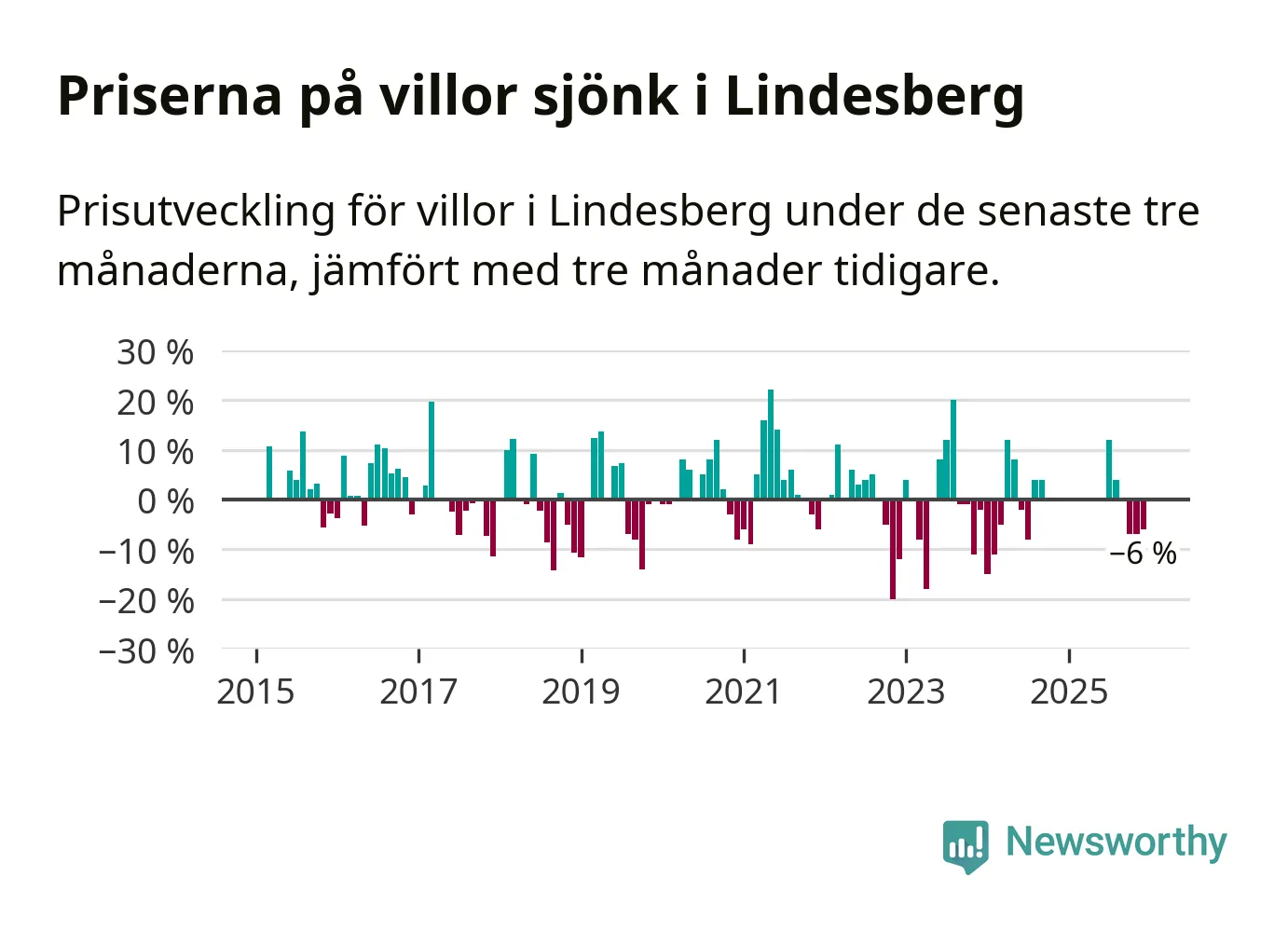 Villapriserna har gått ner i Lindesbergs kommun. Medelpriset på försäljningarna under de senaste tre månaderna visar på en nedgång med 6 procent.