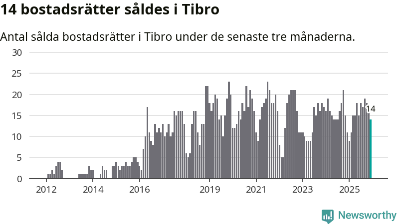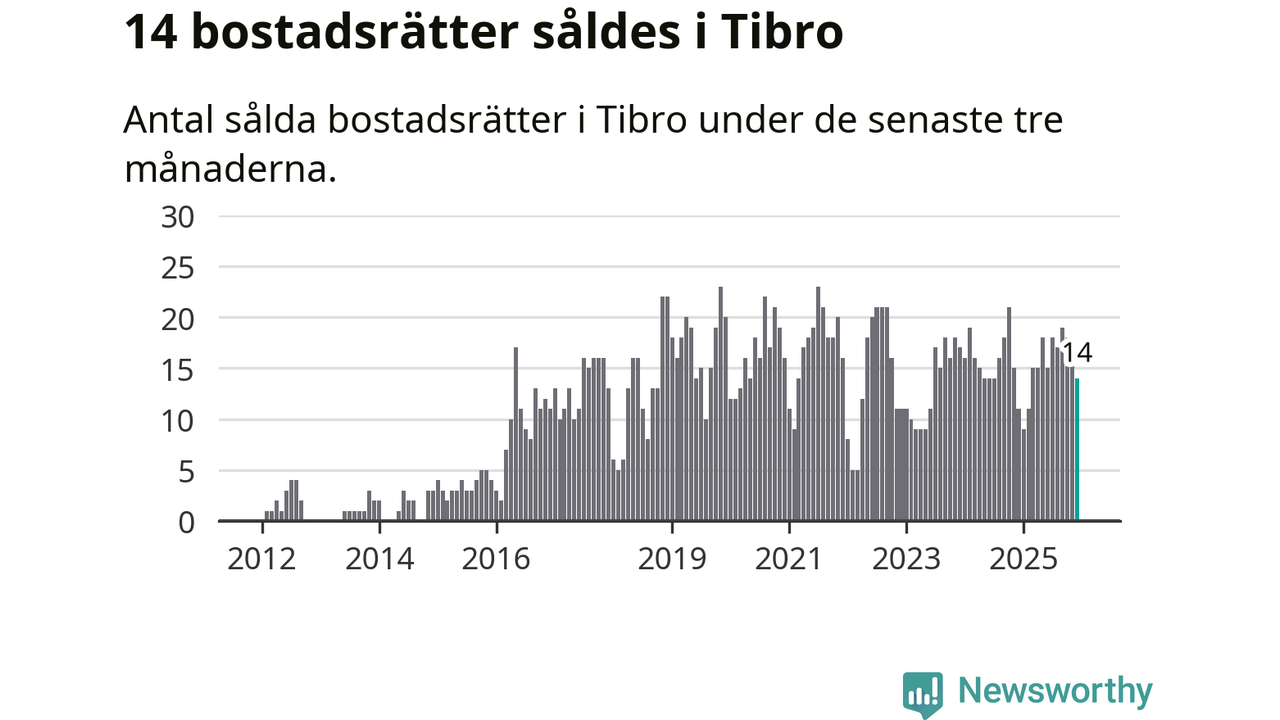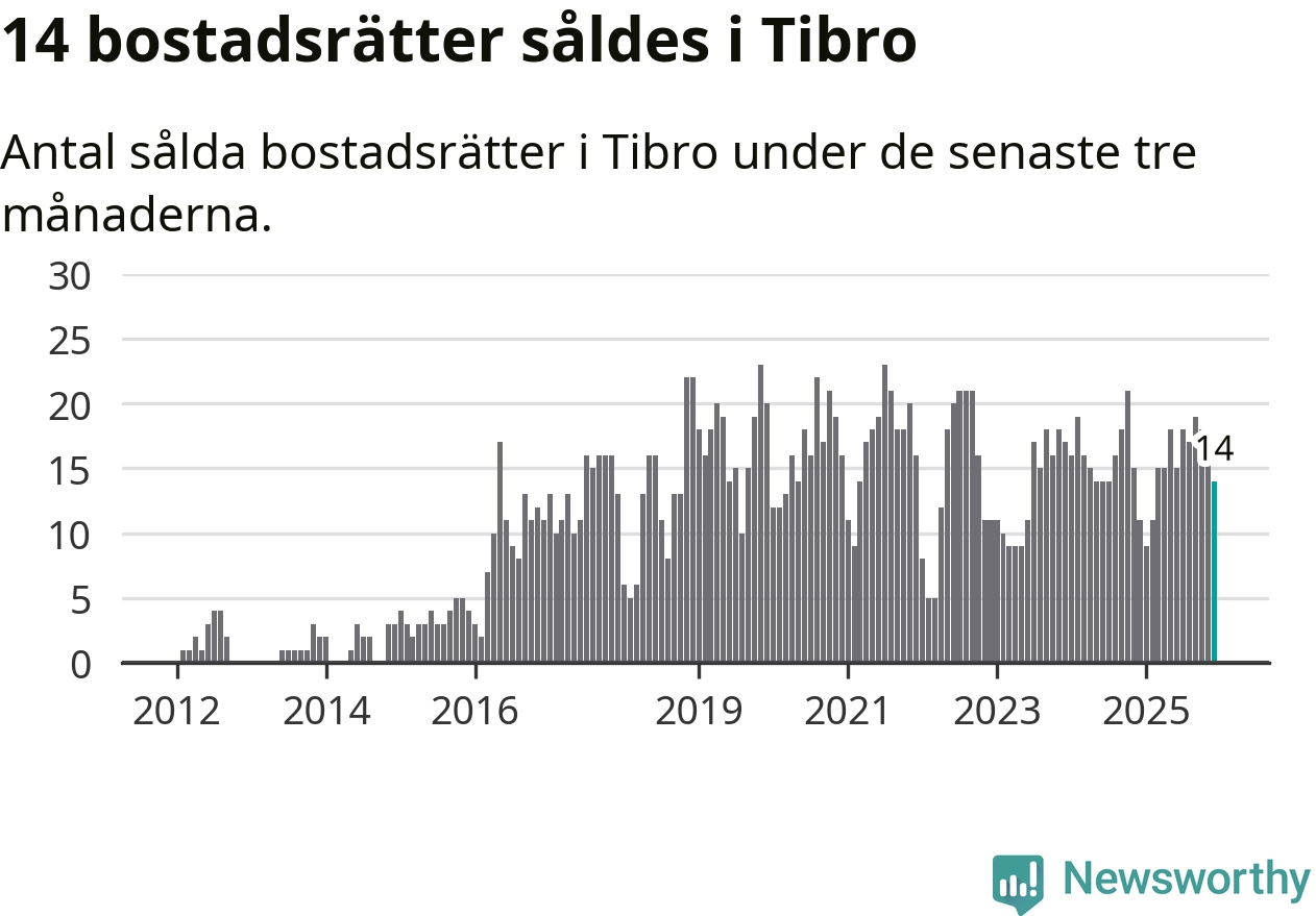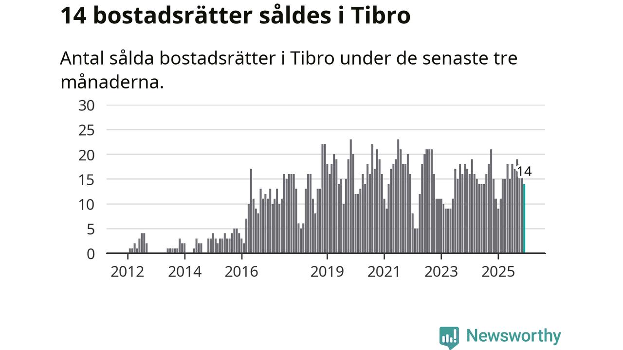 Mellan oktober och december gjordes sammanlagt 14 affärer med bostadsrätter i Tibro kommun. Det kan jämföras med elva vid motsvarande tid i fjol.