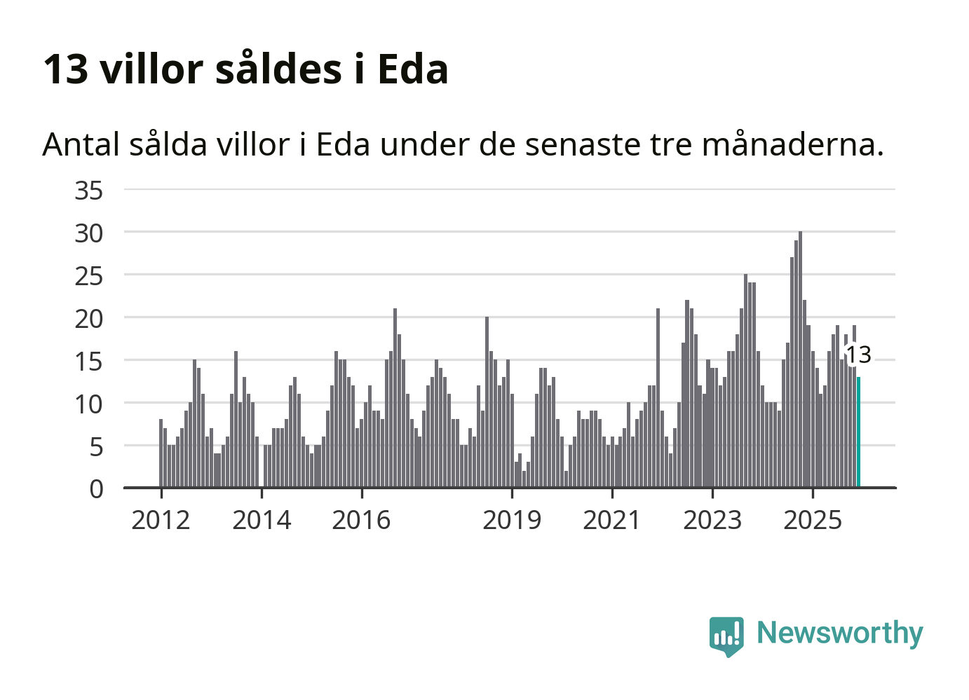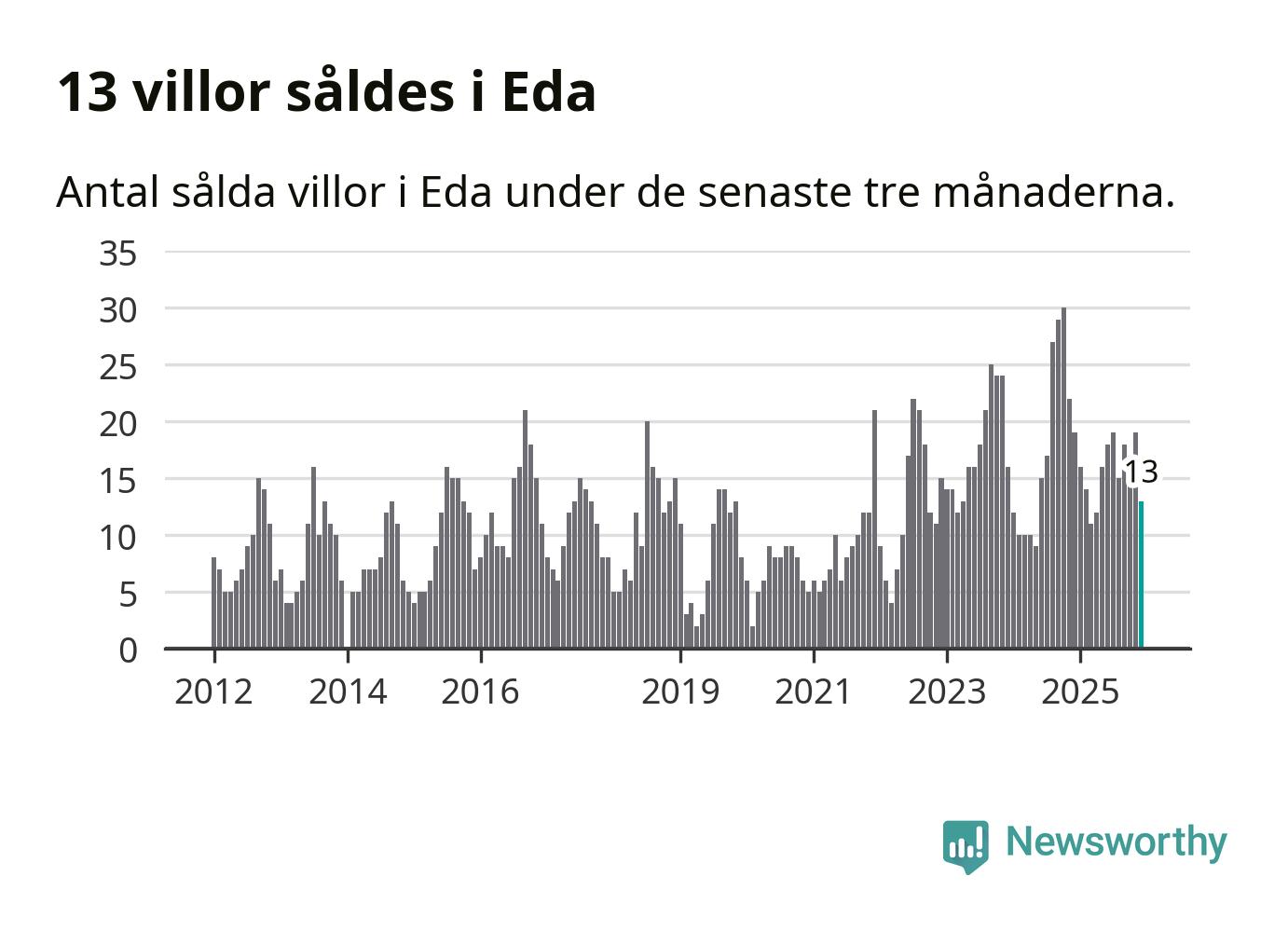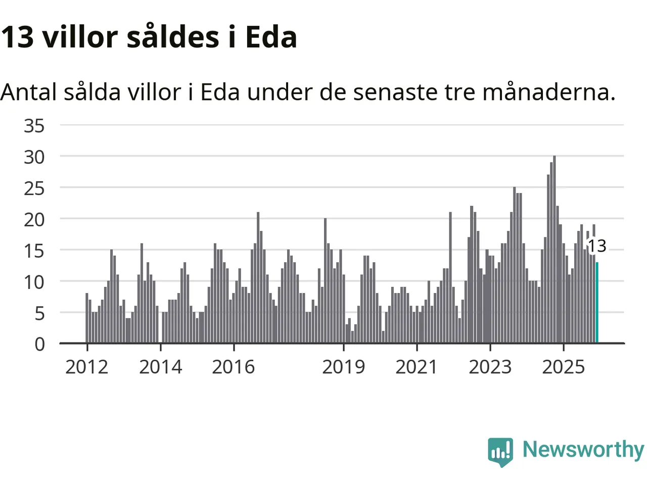 Mellan oktober och december gjordes sammanlagt 13 affärer med villor i Eda kommun. Det kan jämföras med 19 vid motsvarande tid i fjol.