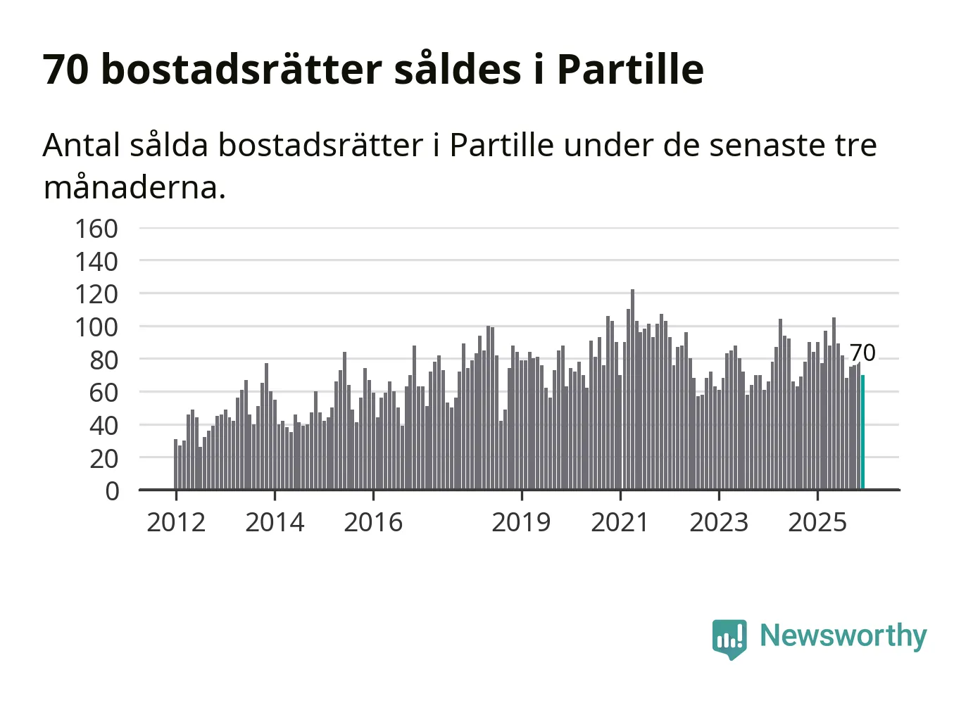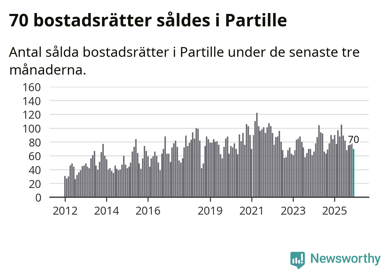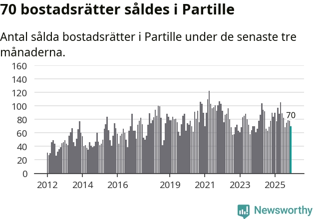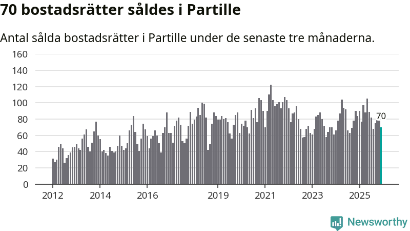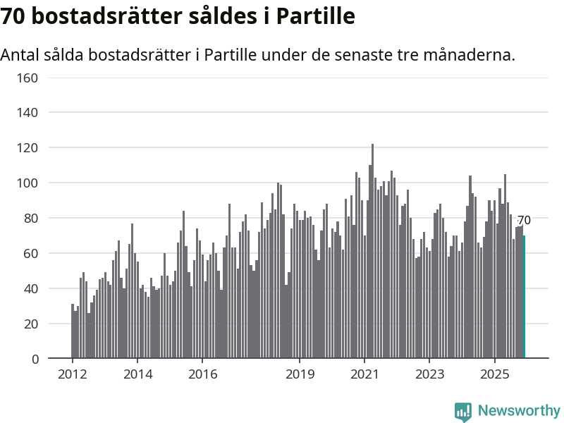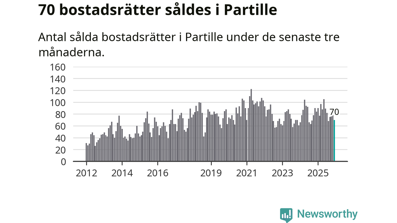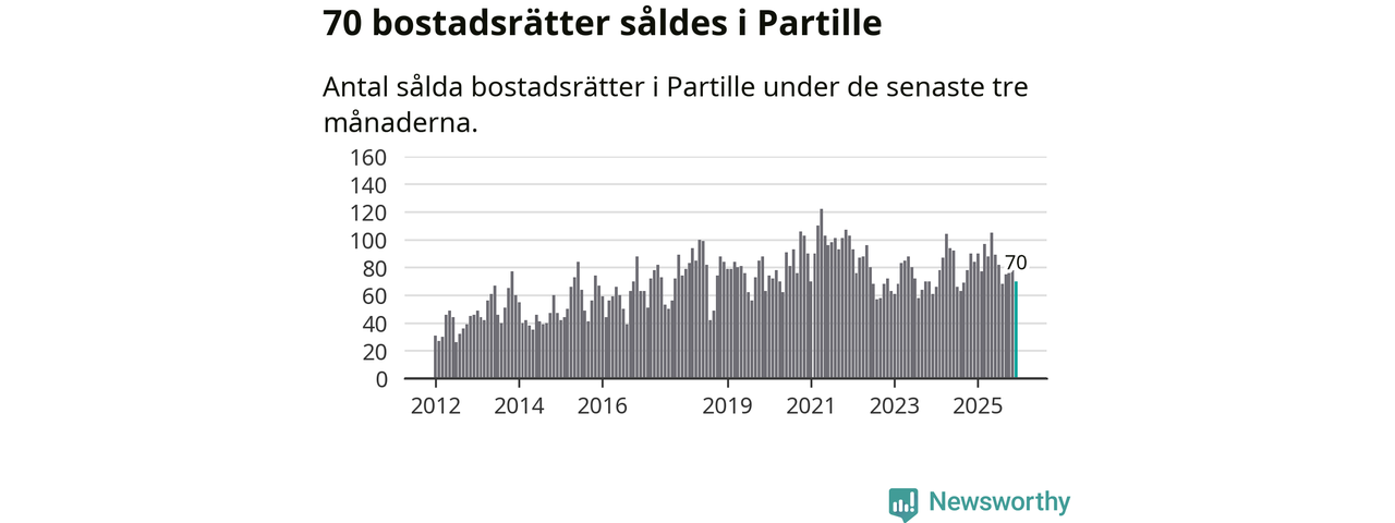 Sammanlagt såldes 70 bostadsrätter i Partille kommun mellan oktober och december till ett genomsnittligt pris på 2,8 miljoner kronor. I fjol gjordes 84 affärer vid den här tiden på året.