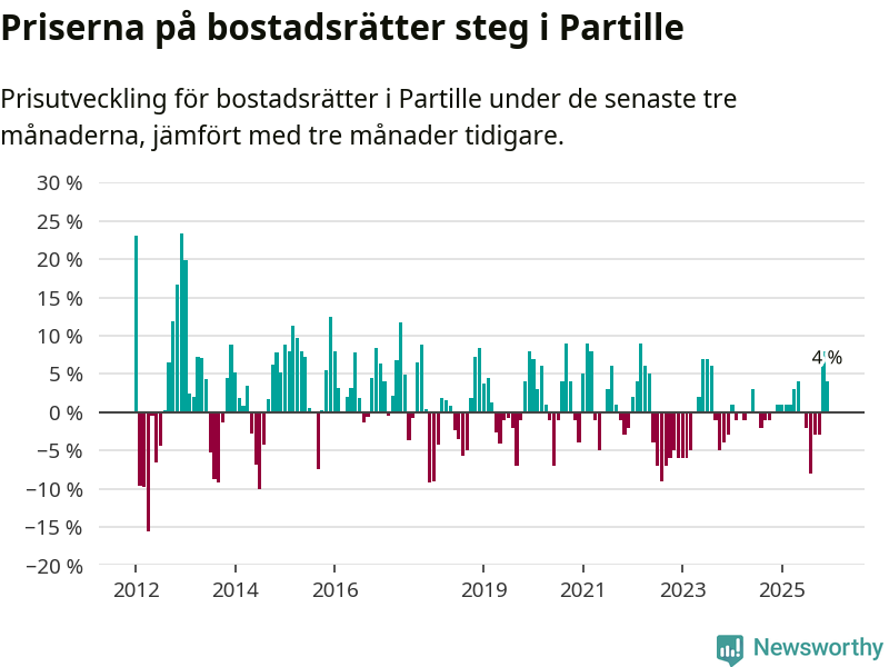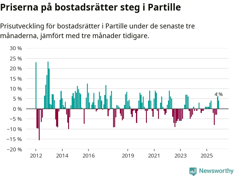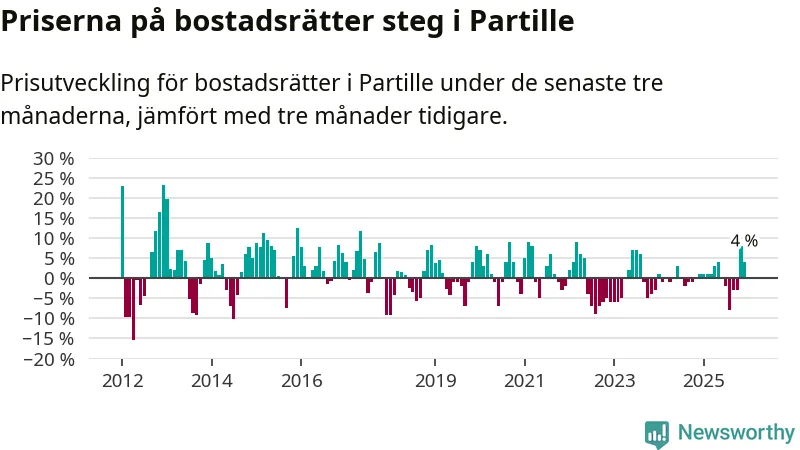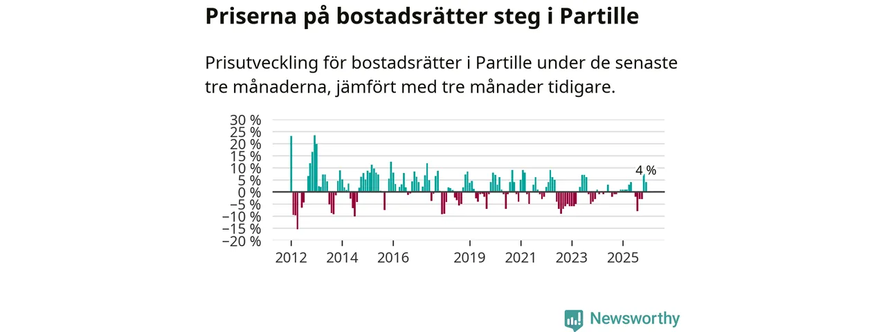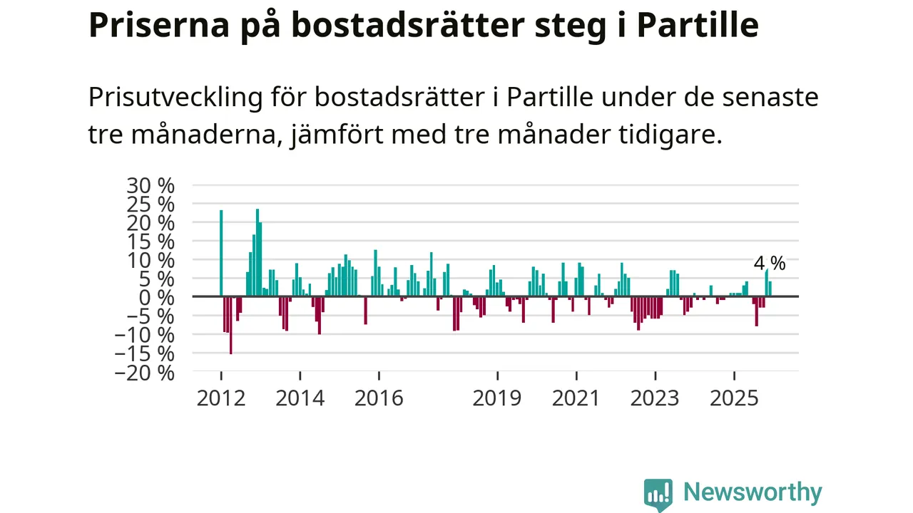 Priserna på bostadsrätter har gått upp i Partille kommun. Medelpriset på försäljningarna under de senaste tre månaderna visar på en uppgång med 4 procent.