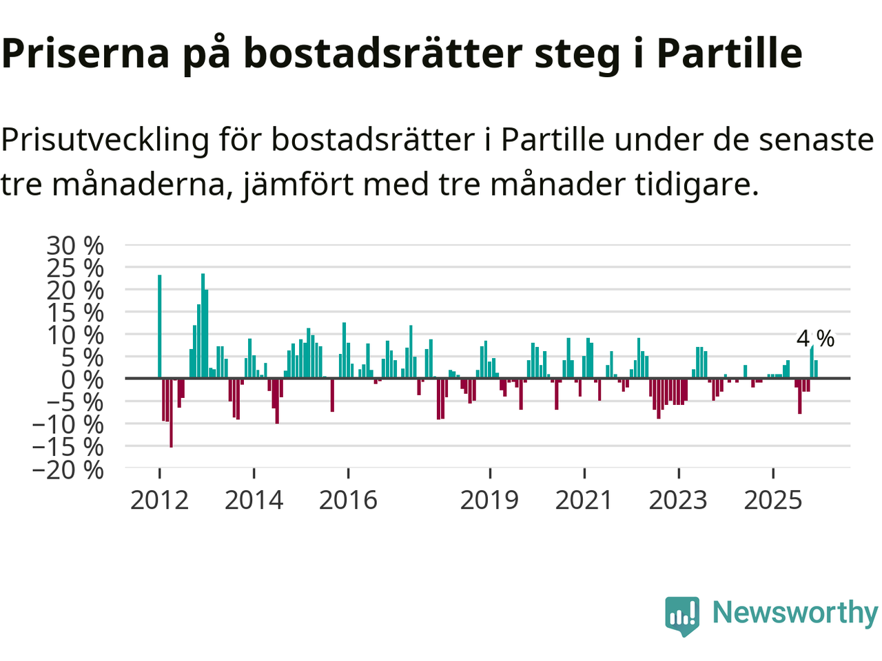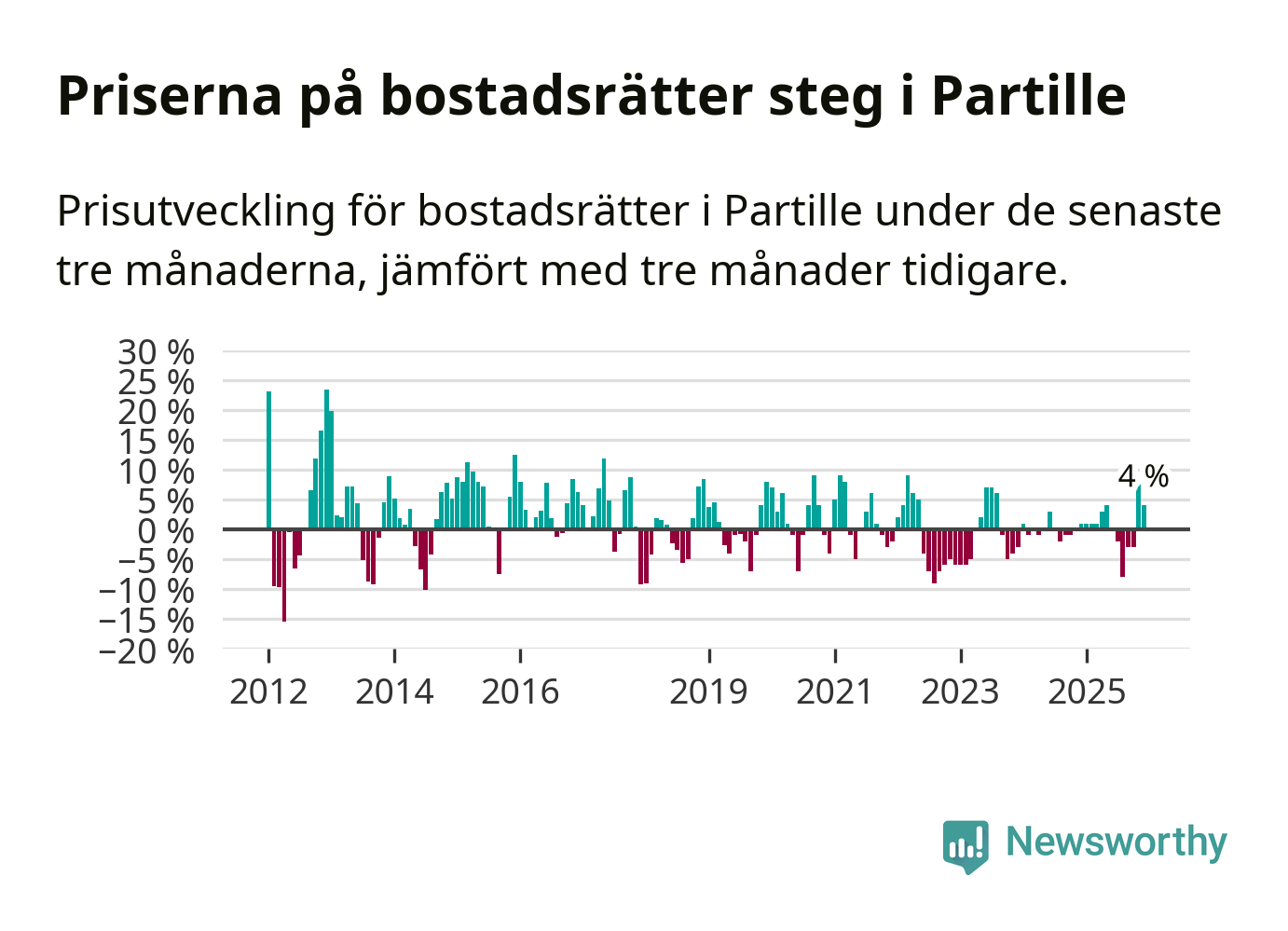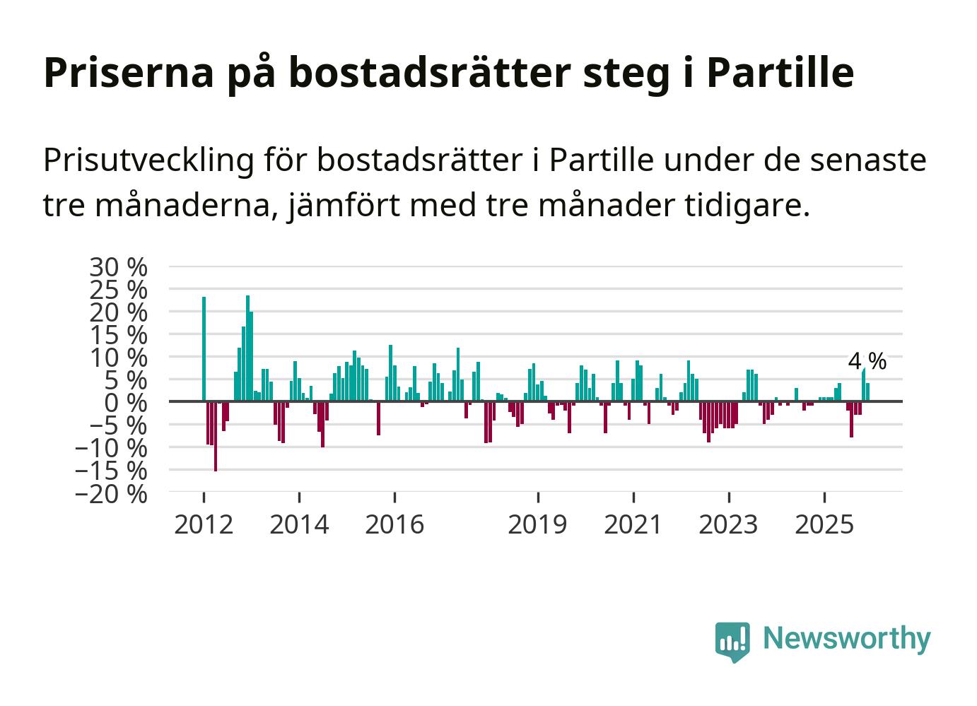 Priserna på bostadsrätter har gått upp i Partille kommun. Medelpriset på försäljningarna under de senaste tre månaderna visar på en uppgång med 4 procent.