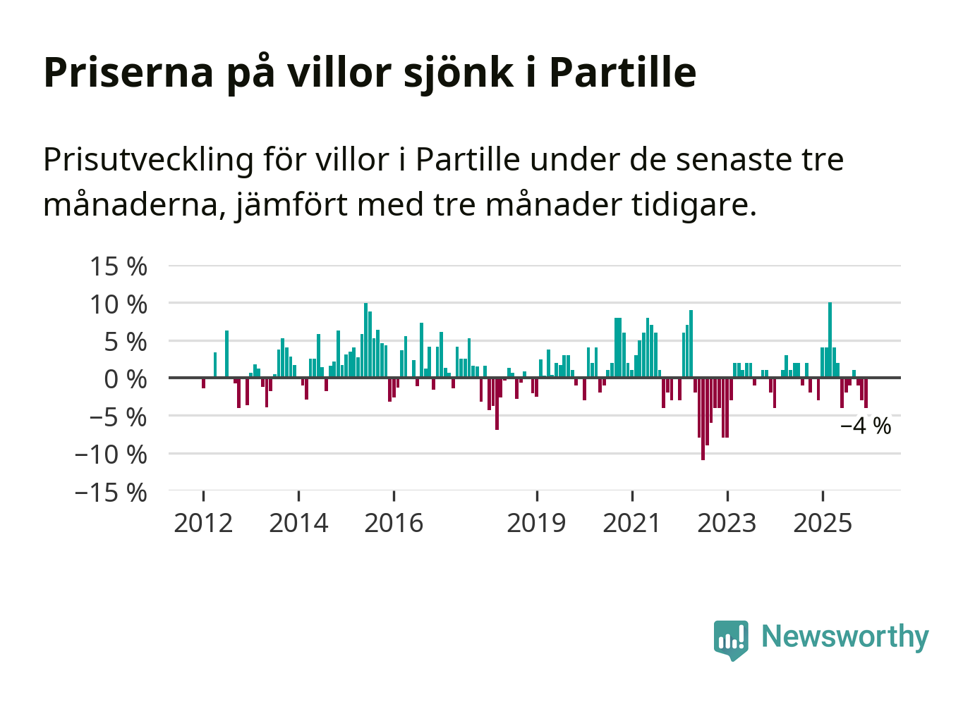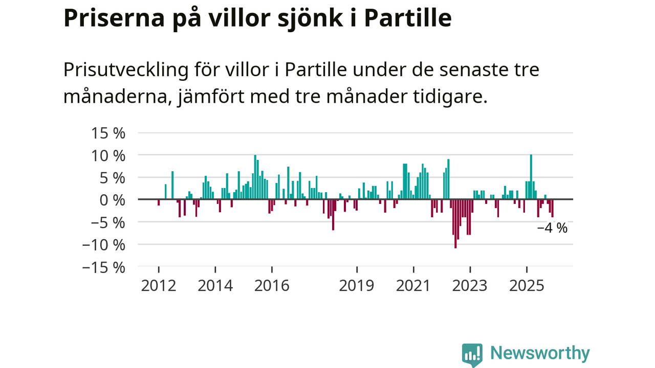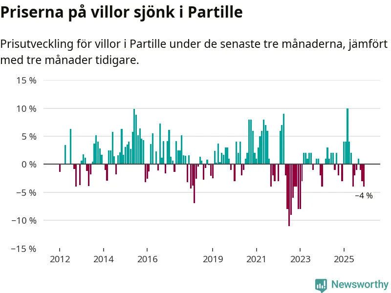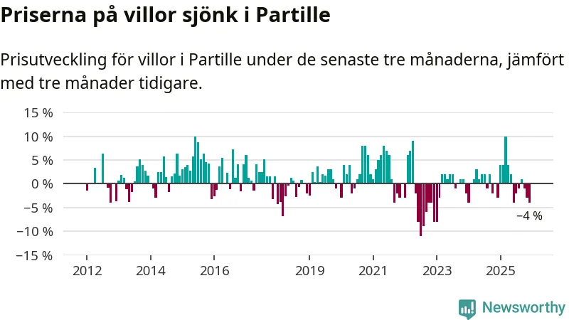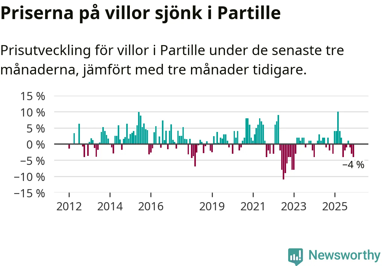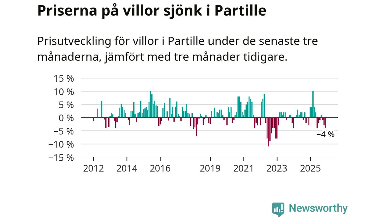 Villapriserna har gått ner i Partille kommun. Medelpriset på försäljningarna under de senaste tre månaderna visar på en nedgång med 4 procent.