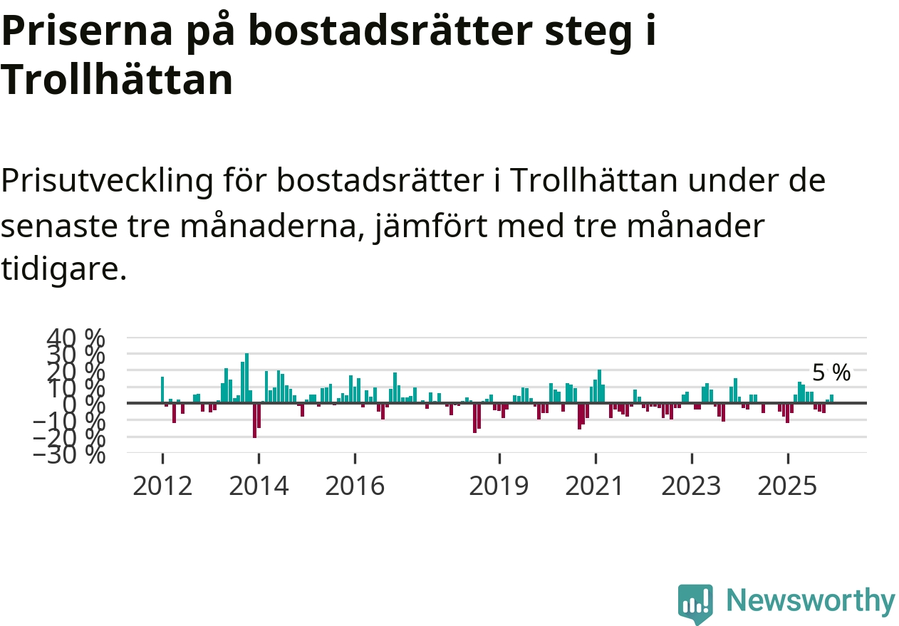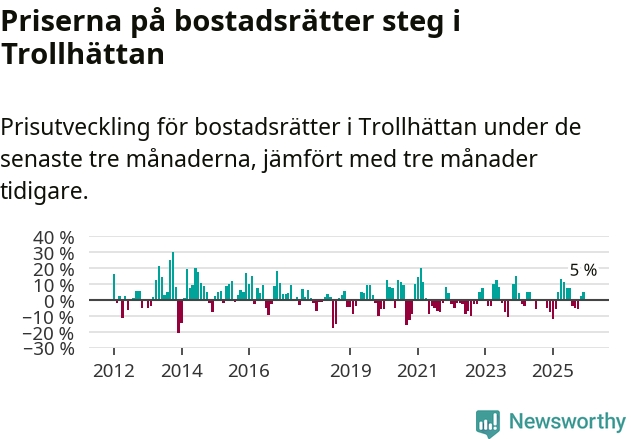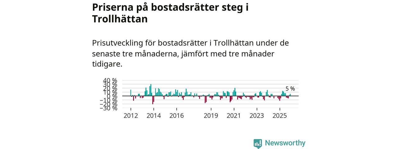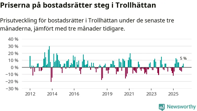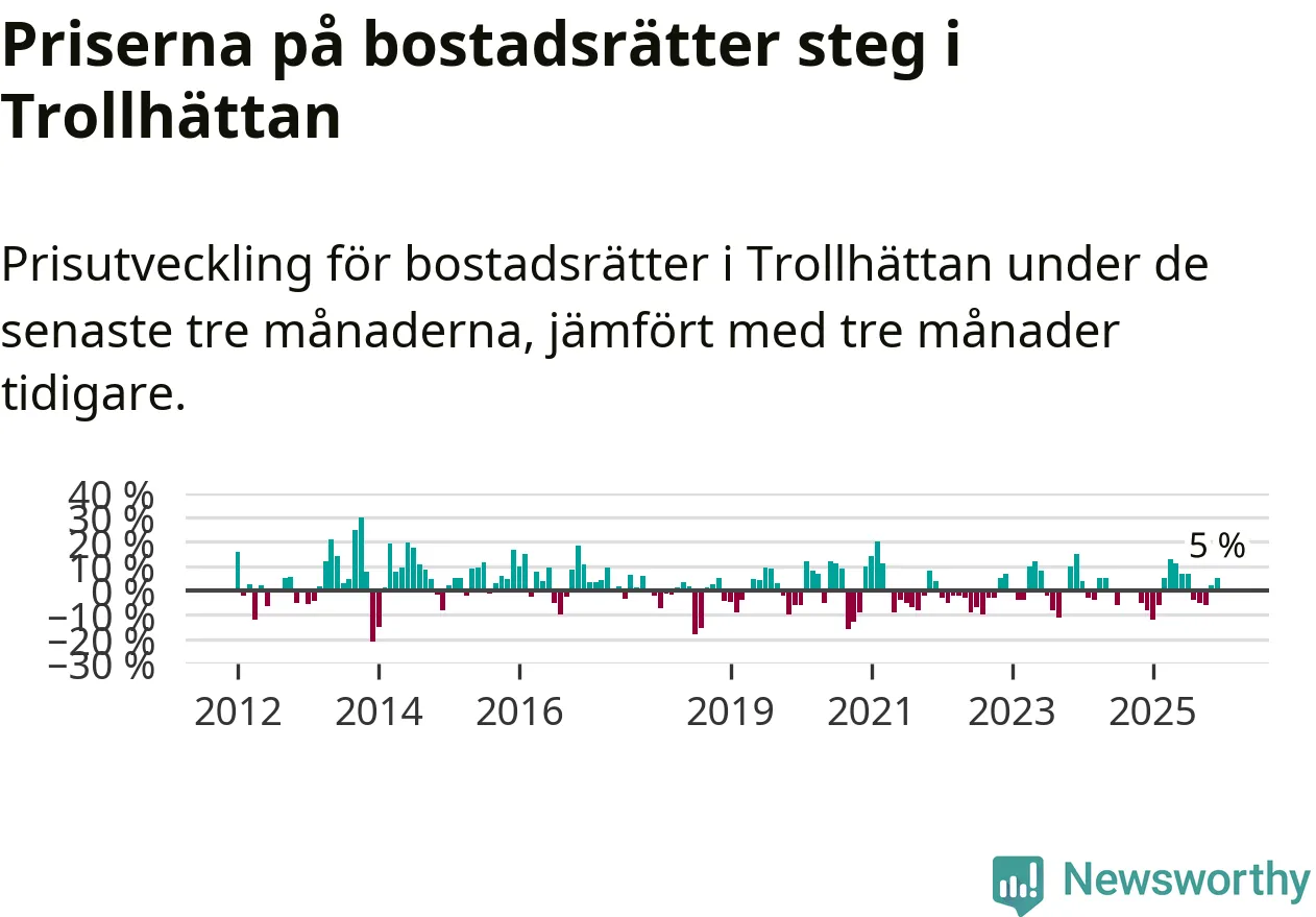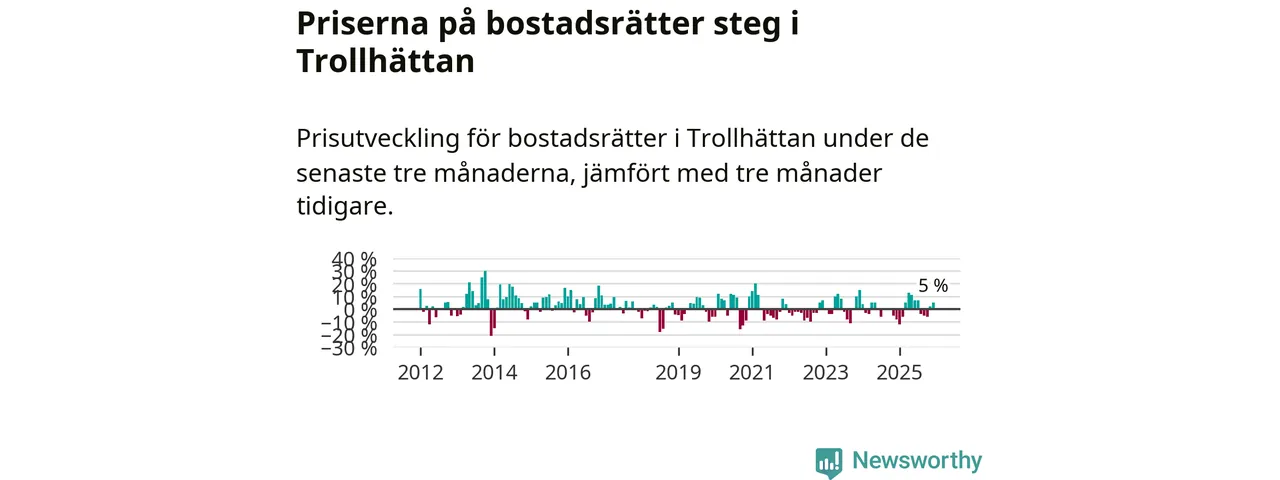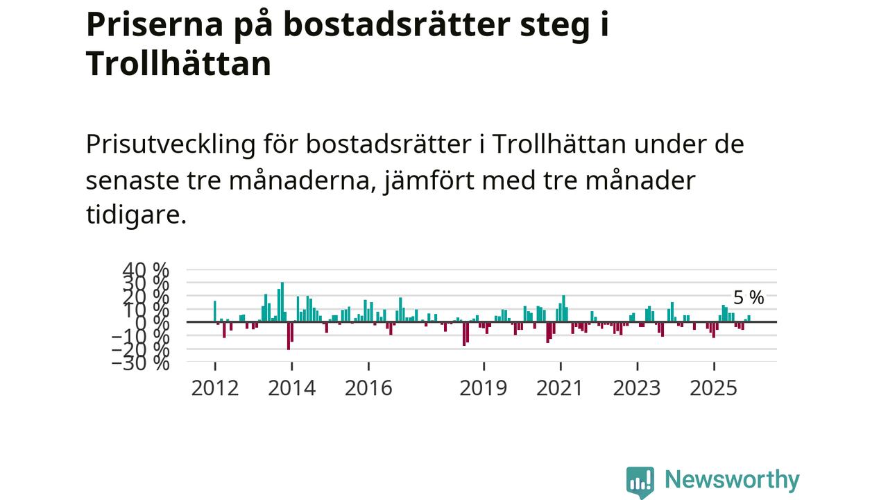 Priserna på bostadsrätter har gått upp i Trollhättans kommun. Medelpriset på försäljningarna under de senaste tre månaderna visar på en uppgång med 5 procent.