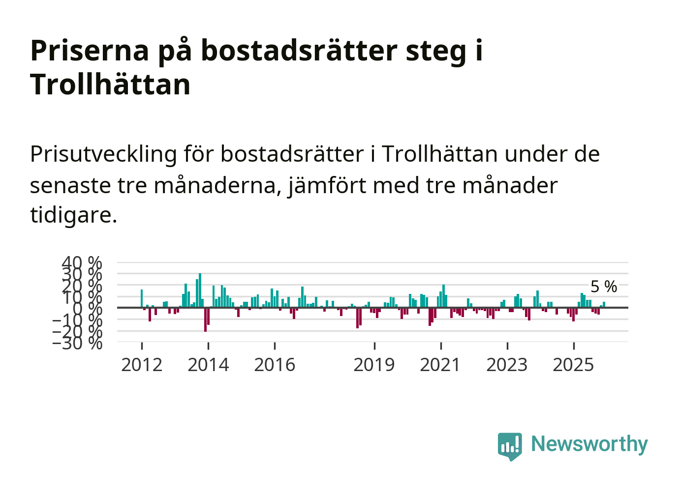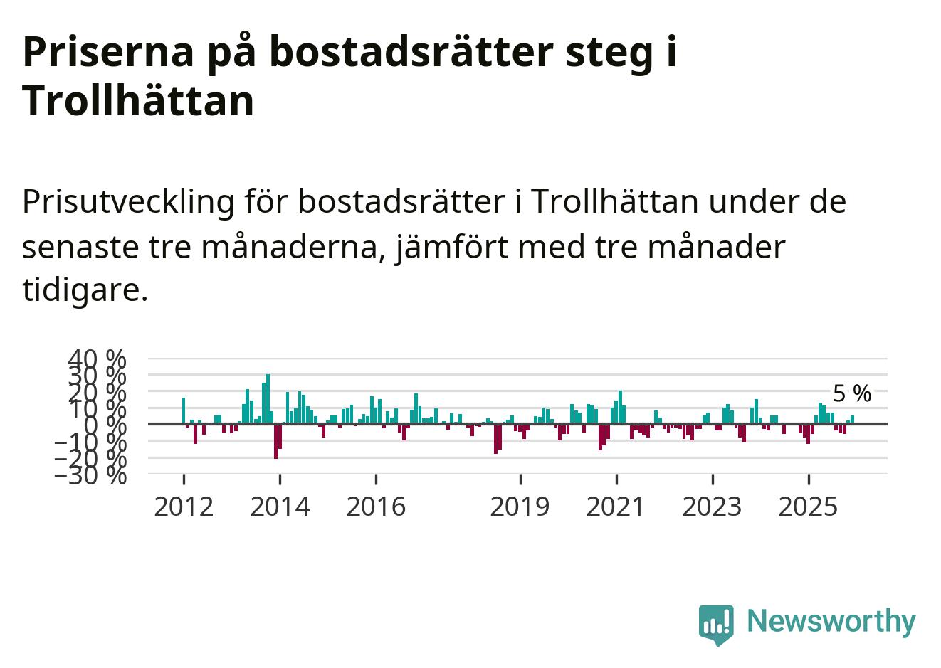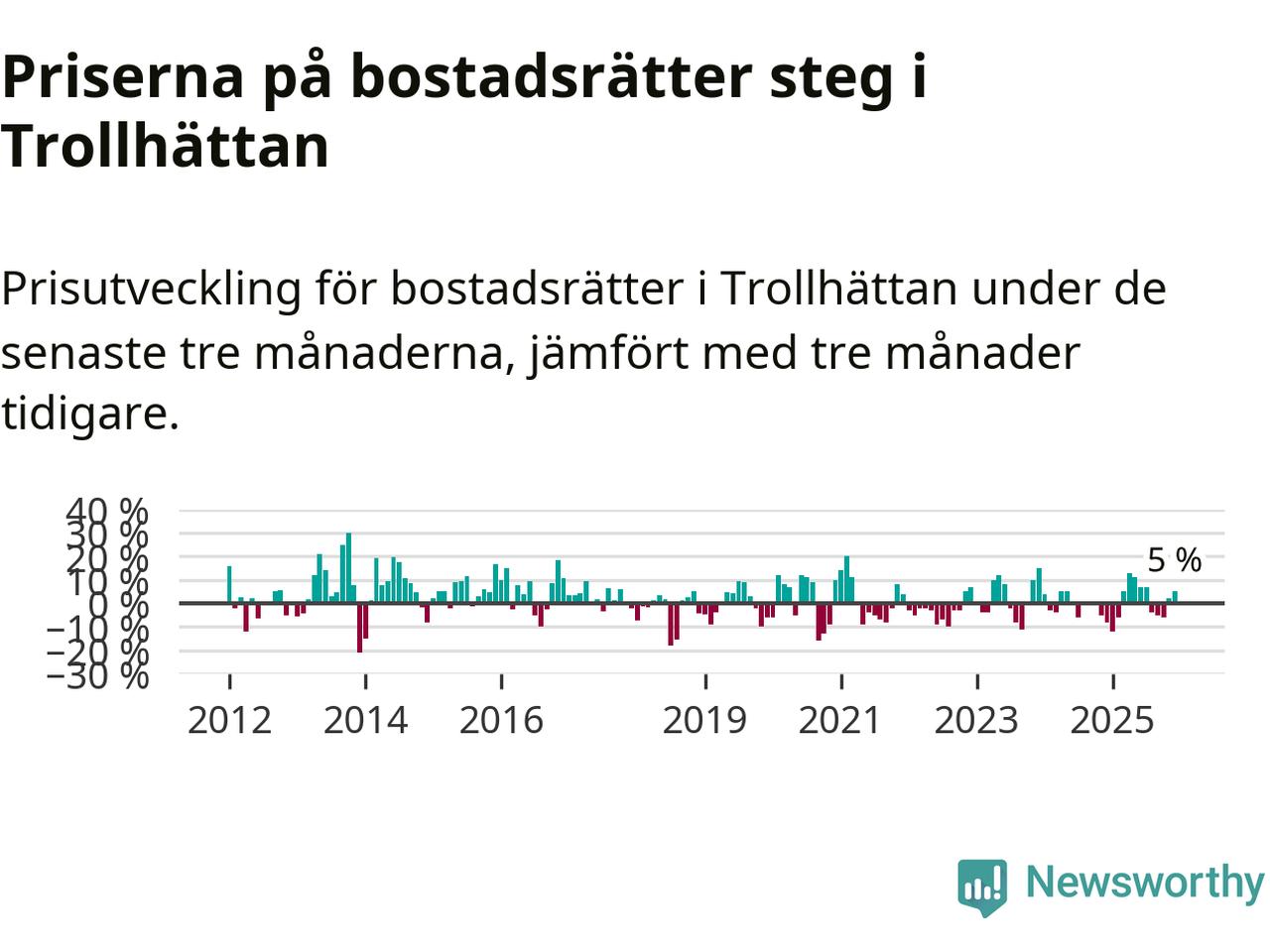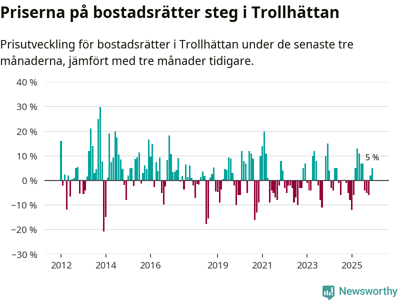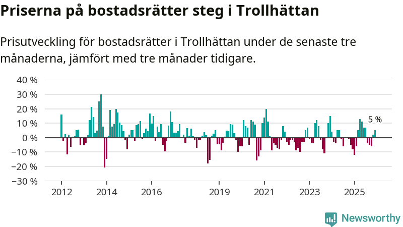 Priserna på bostadsrätter har gått upp i Trollhättans kommun. Medelpriset på försäljningarna under de senaste tre månaderna visar på en uppgång med 5 procent.