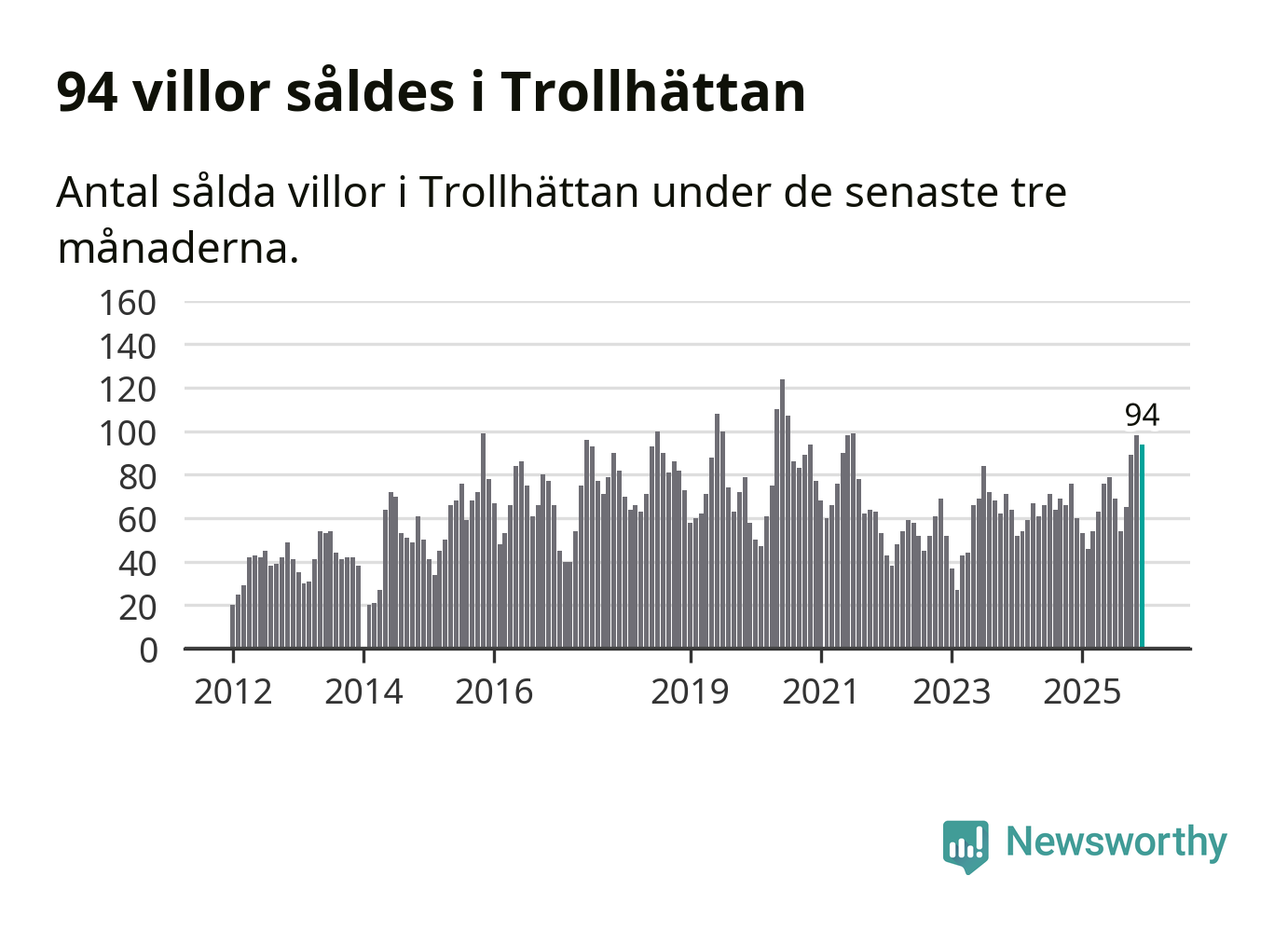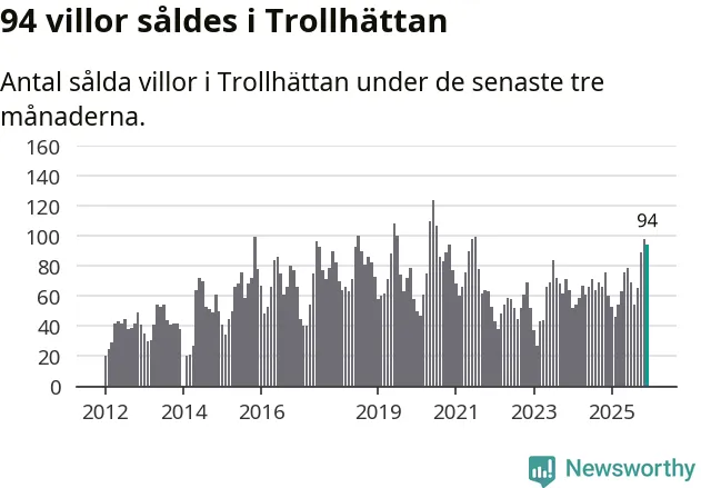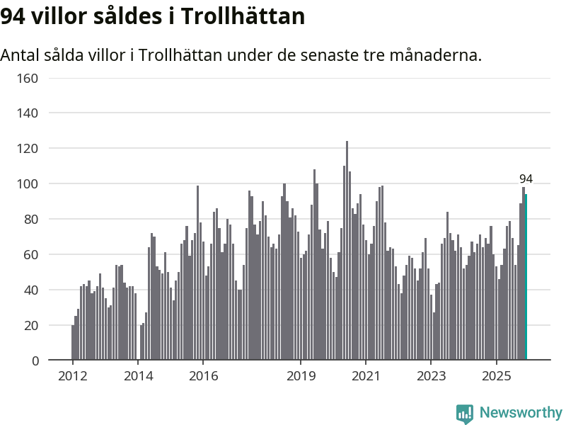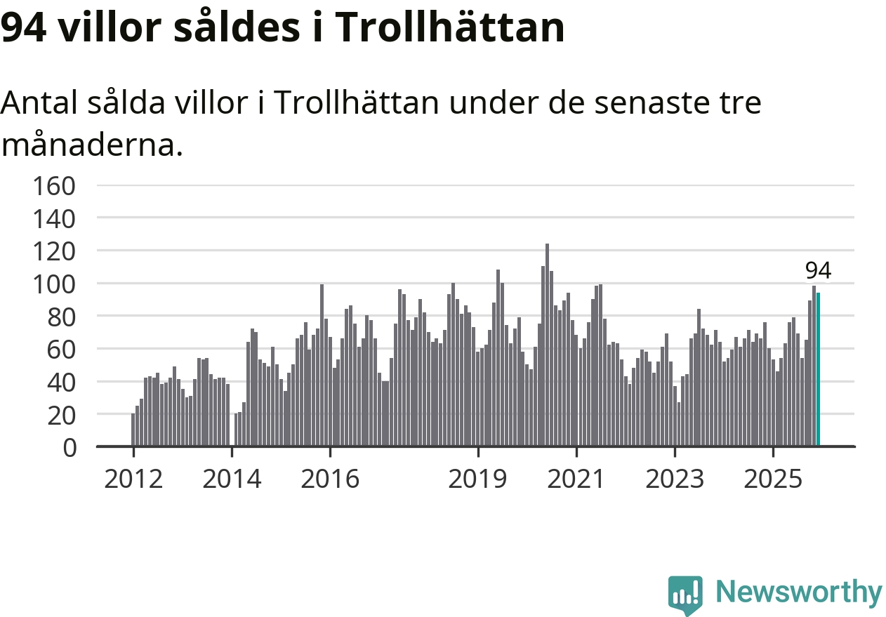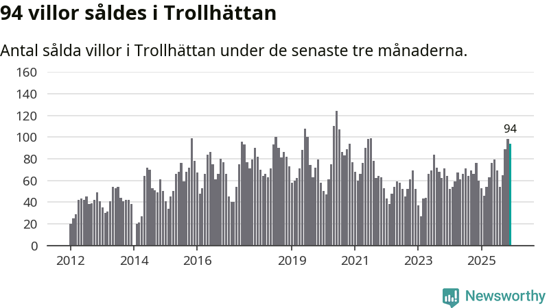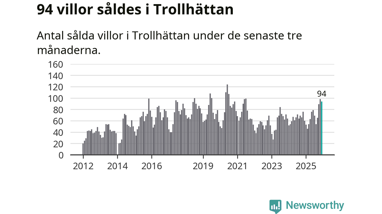 Mellan oktober och december såldes 94 villor i Trollhättans kommun. Det är relativt många sett till aktiviteten på bostadsmarknaden i kommunen under de senaste tolv månaderna, samt det historiska snittet för den här tiden på året.