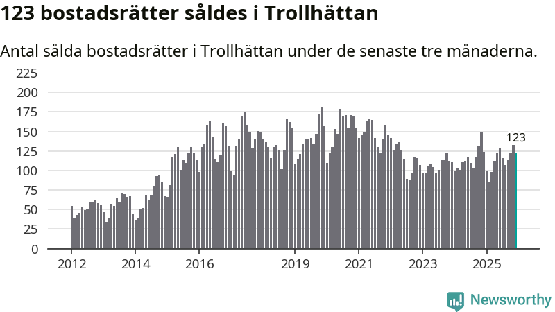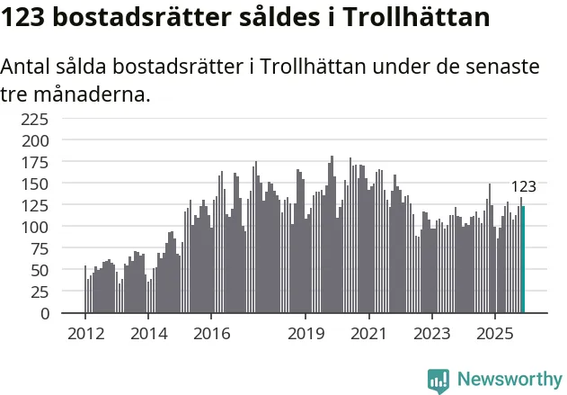 Sammanlagt såldes 123 bostadsrätter i Trollhättans kommun mellan oktober och december till ett genomsnittligt pris på 1,4 miljoner kronor. I fjol gjordes 124 affärer vid den här tiden på året.
