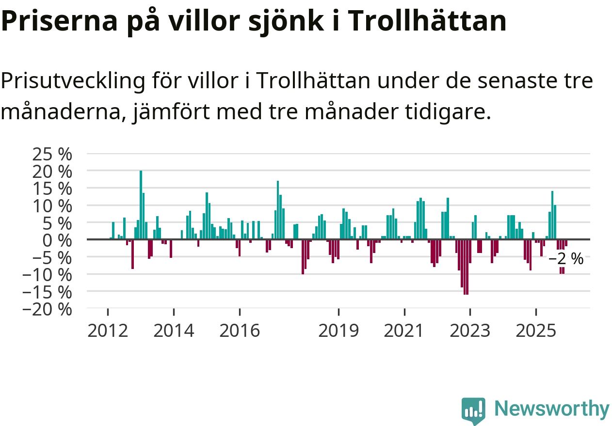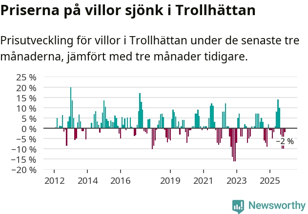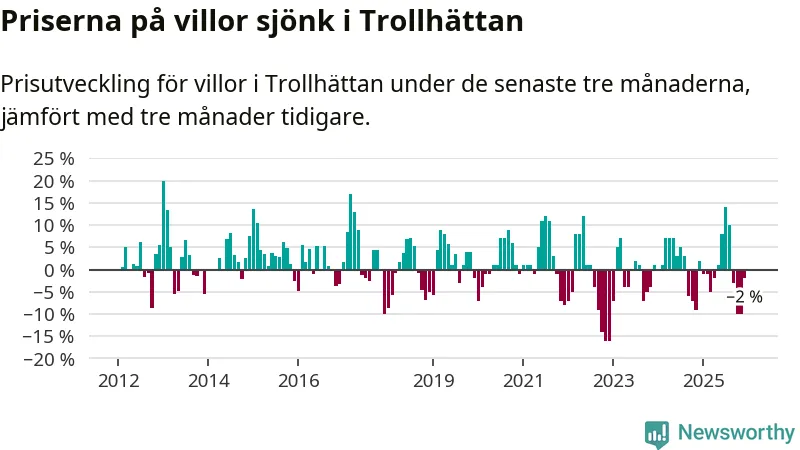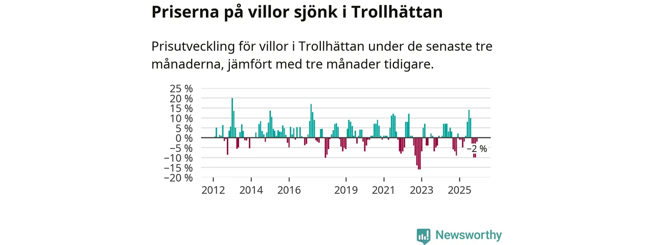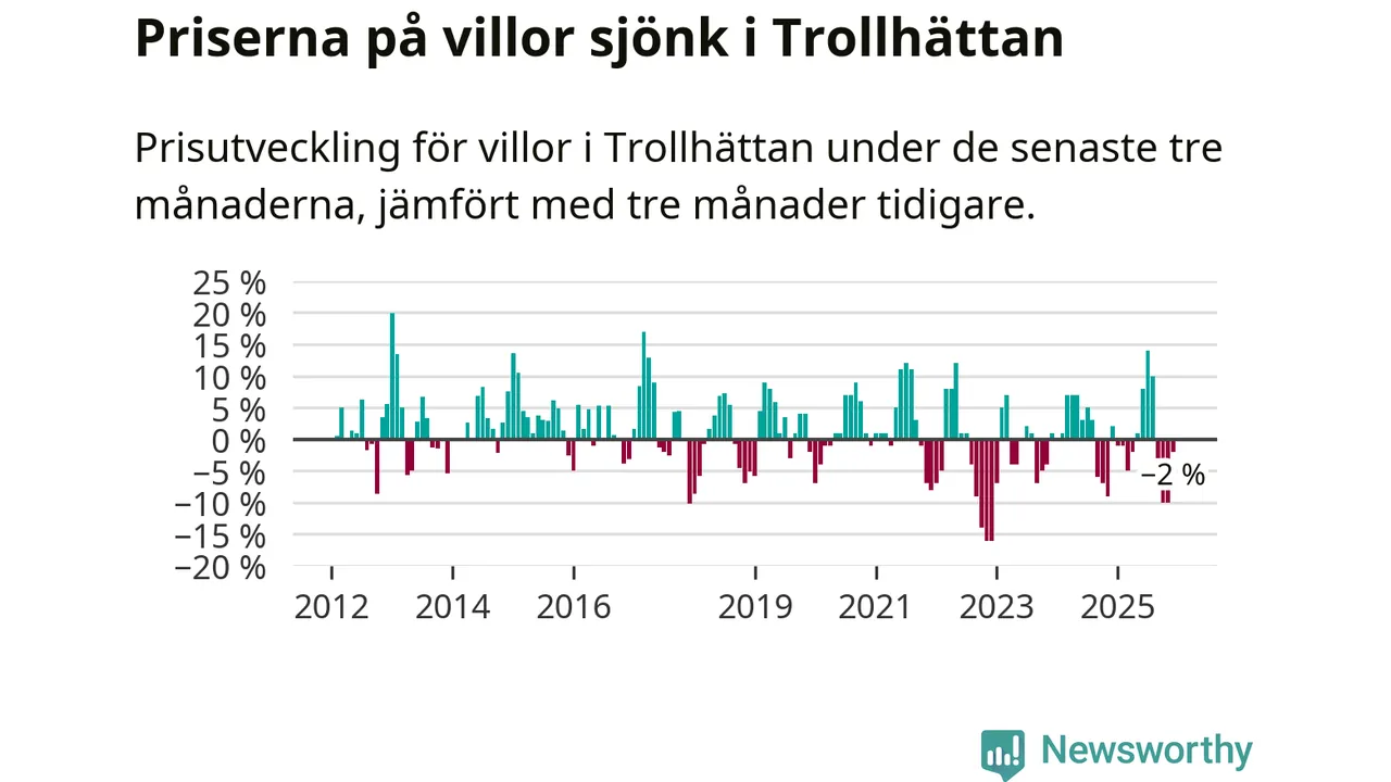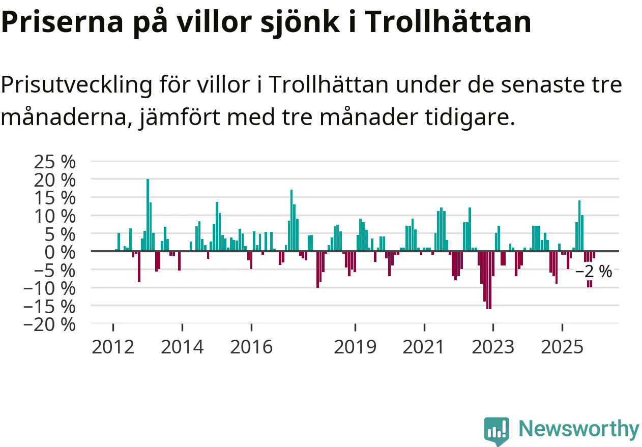 Statistiken visar även på en prisnedgång i Trollhättans kommun. Medelpriset på försäljningarna av villor i kommunen var 2 procent lägre än för tre månader sedan. Även i hela Västra Götaland sjunker villapriserna. I hela länet noterades en prisnedgång på 3 procent.