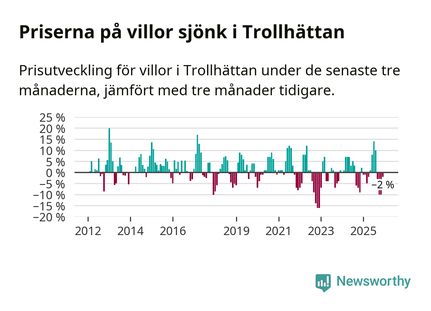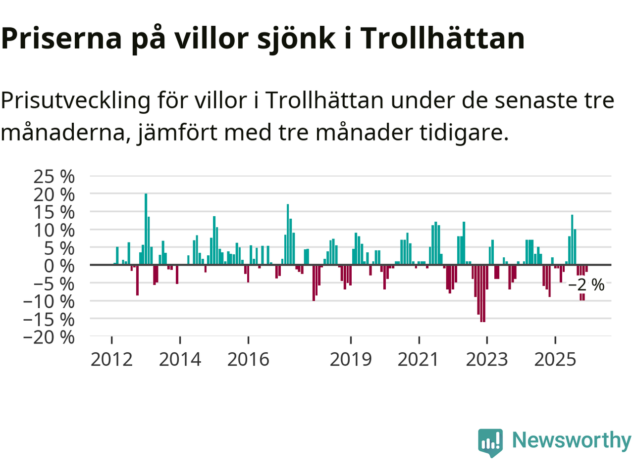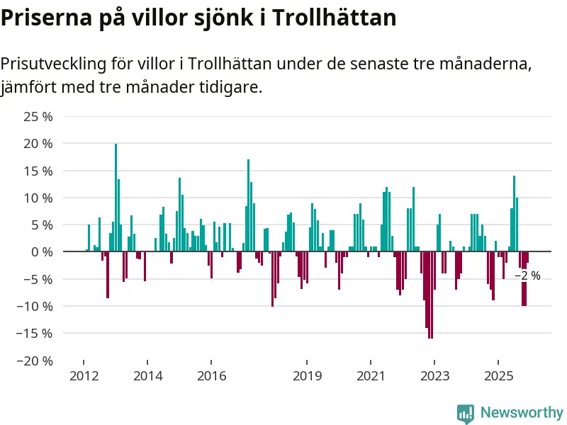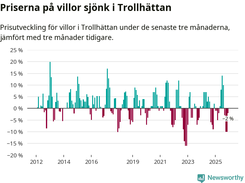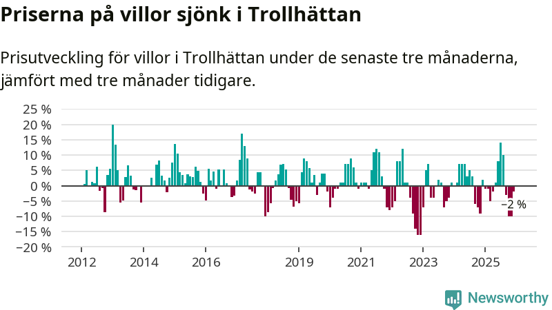 Statistiken visar även på en prisnedgång i Trollhättans kommun. Medelpriset på försäljningarna av villor i kommunen var 2 procent lägre än för tre månader sedan. Även i hela Västra Götaland sjunker villapriserna. I hela länet noterades en prisnedgång på 3 procent.