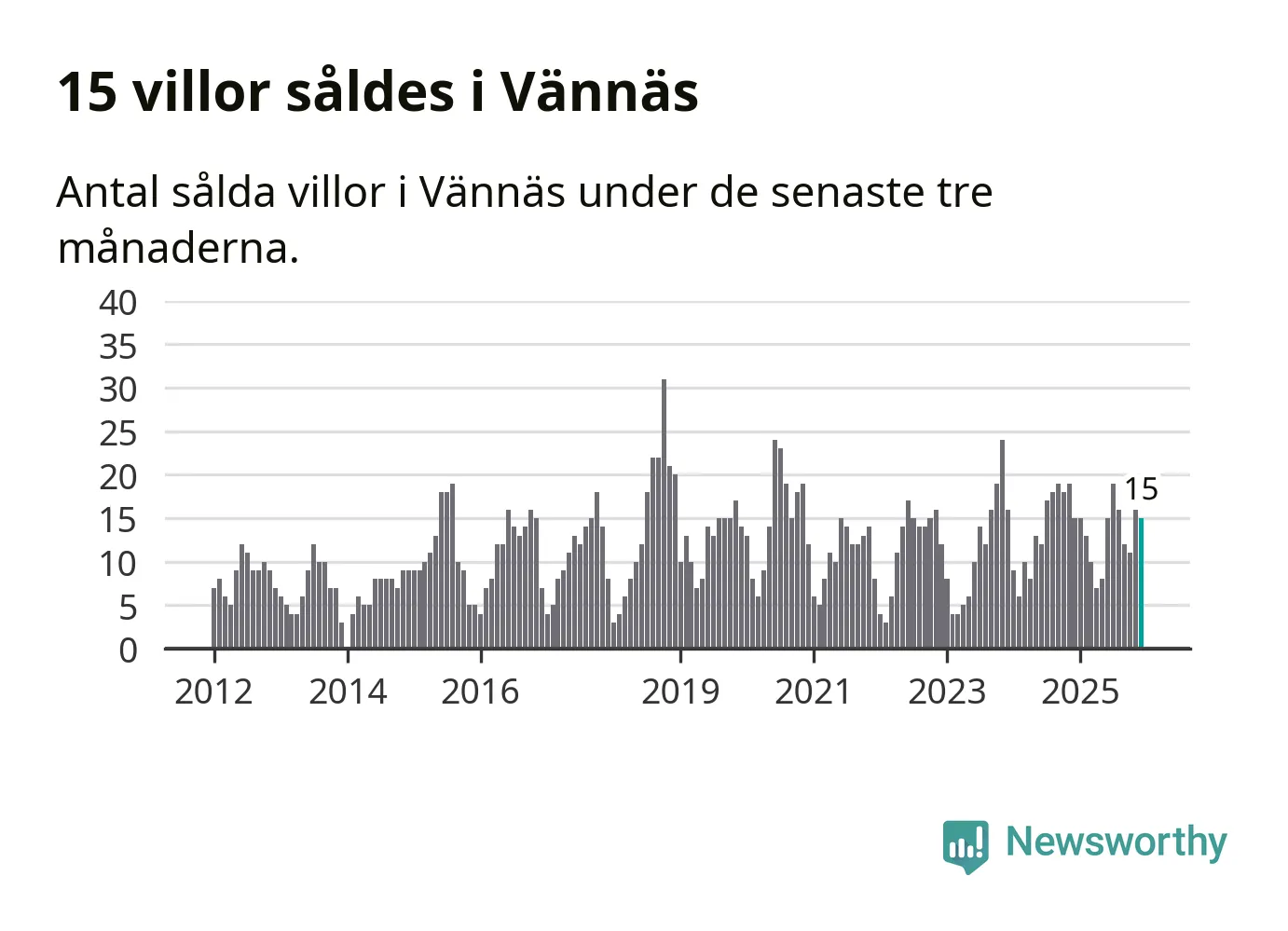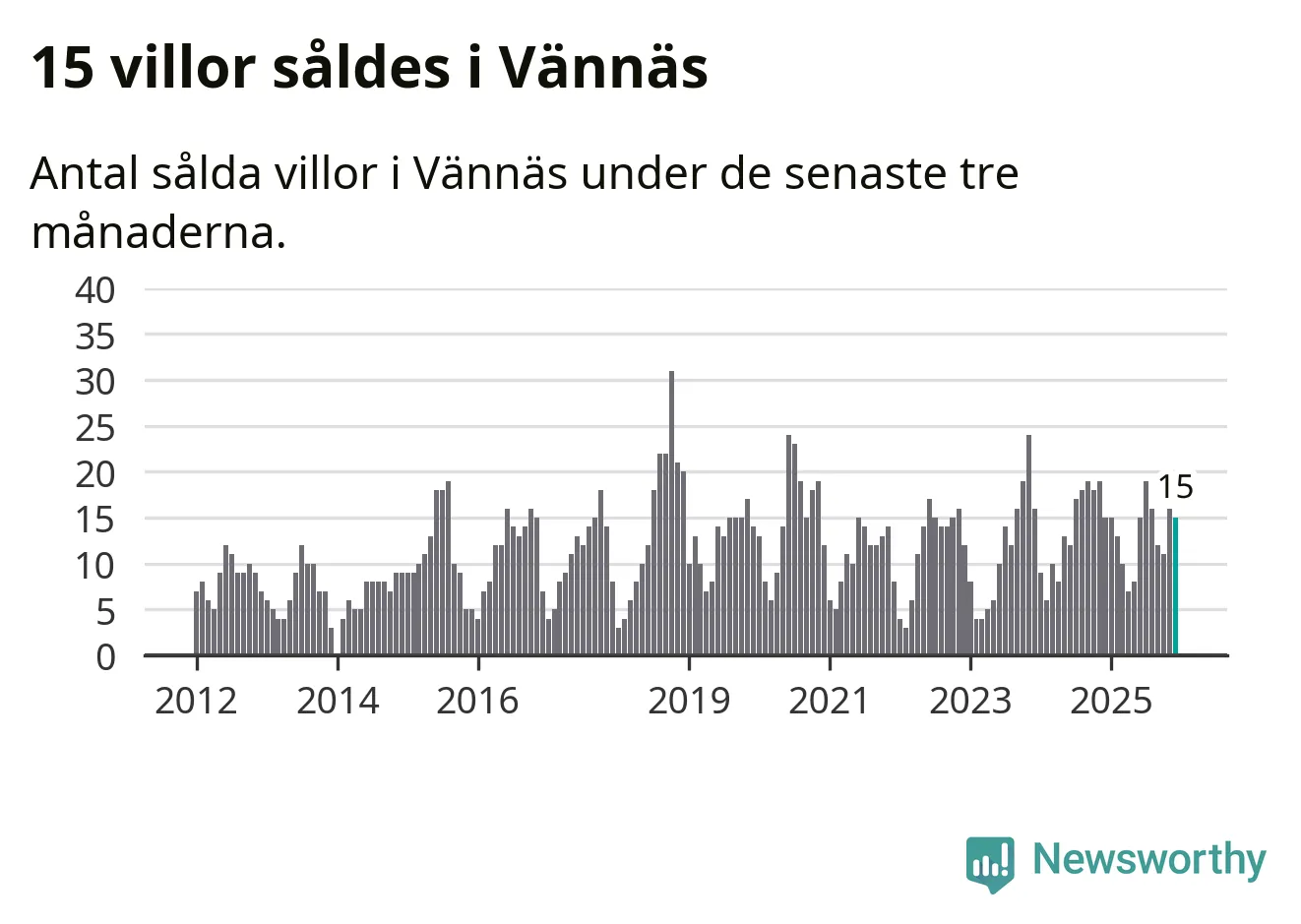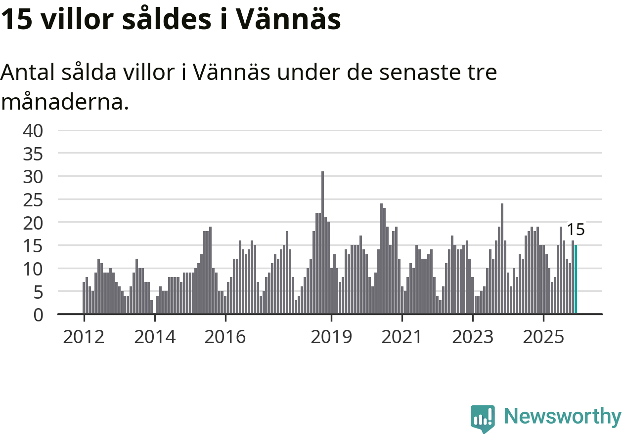 Mellan oktober och december gjordes sammanlagt 15 affärer med villor i Vännäs kommun. Det är lika många affärer som vid motsvarande tid i fjol.
