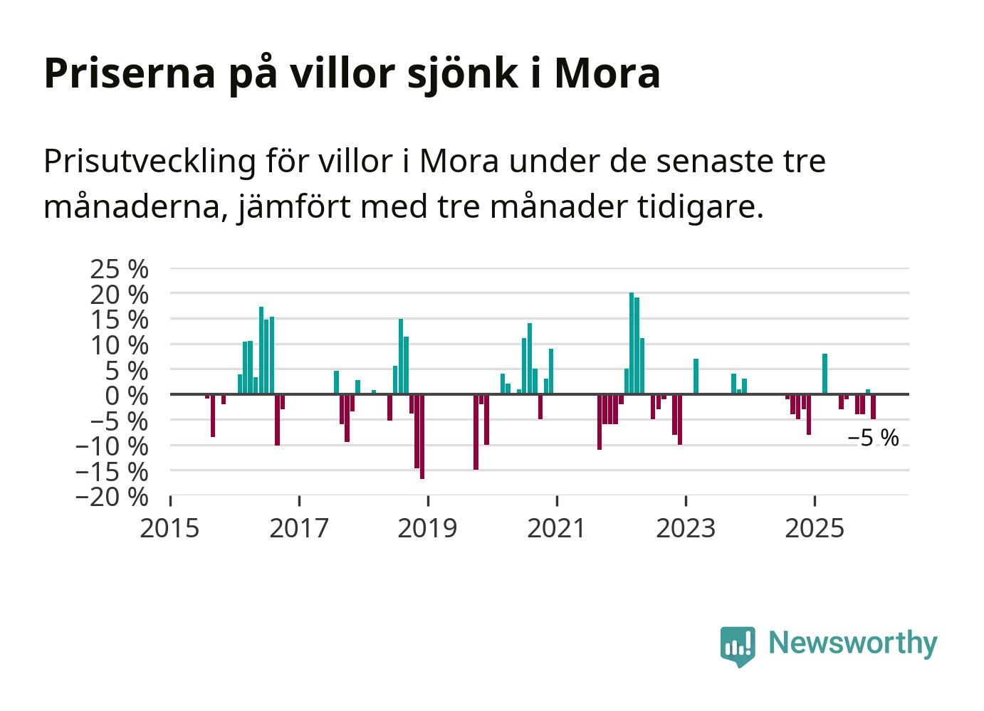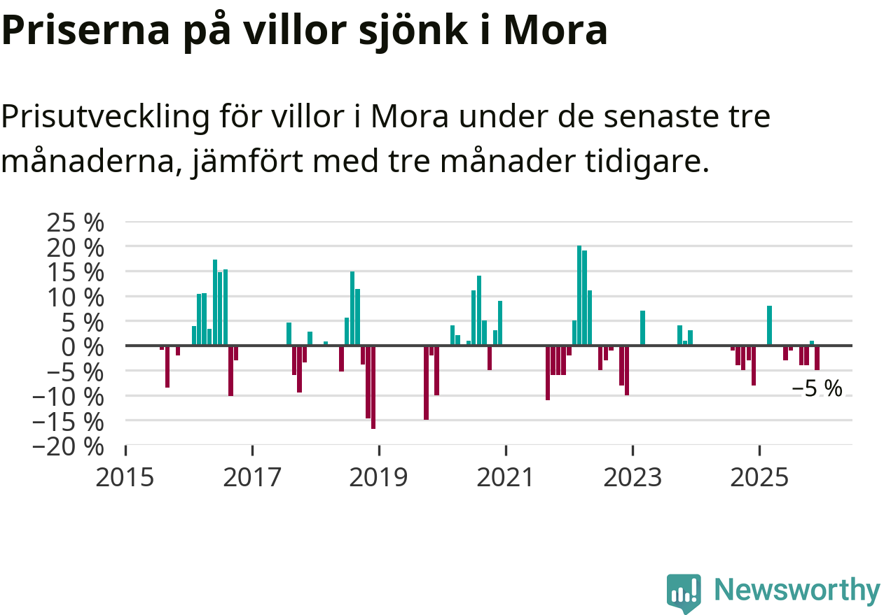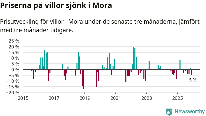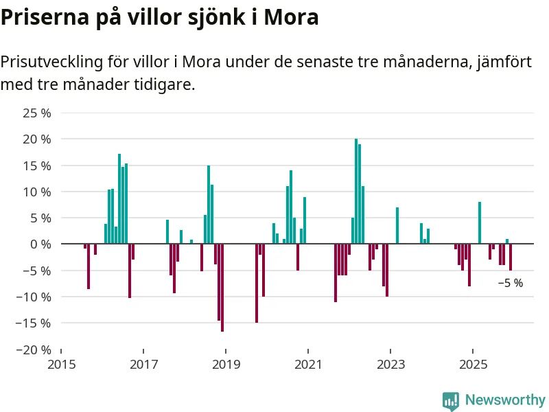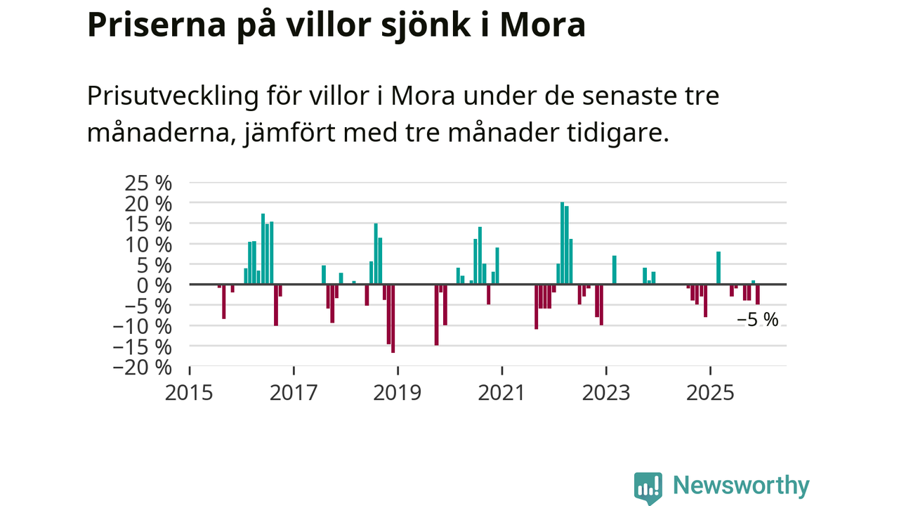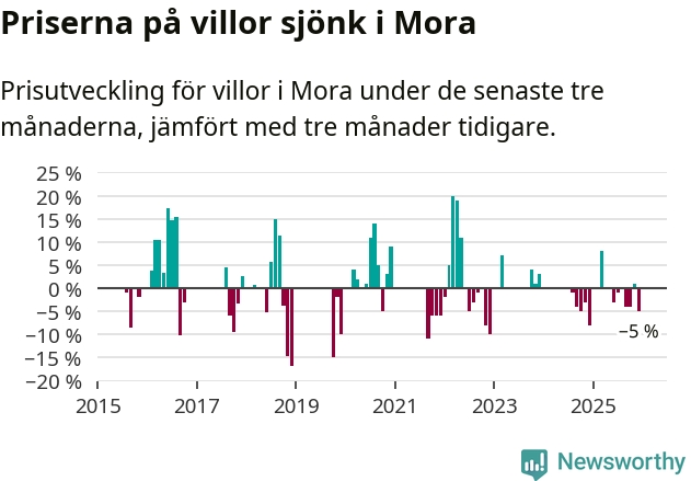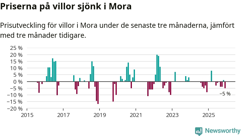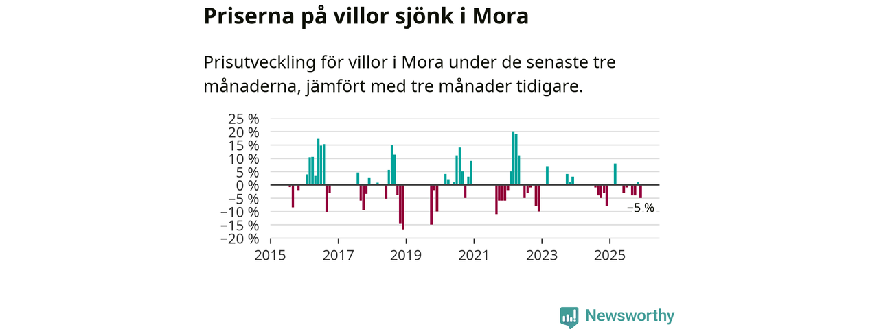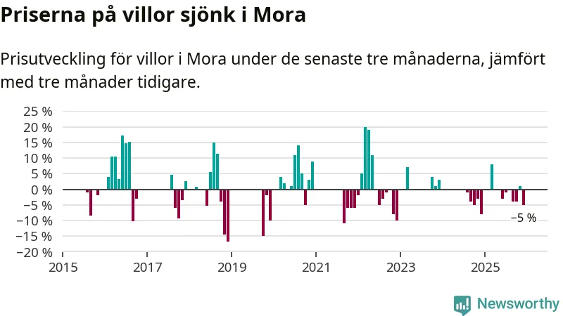 Statistiken visar även på en kännbar prisnedgång i Mora kommun. Medelpriset på försäljningarna av villor i kommunen var 5 procent lägre än för tre månader sedan. Även i hela Dalarna sjunker villapriserna. I hela länet noterades en prisnedgång på 3 procent.