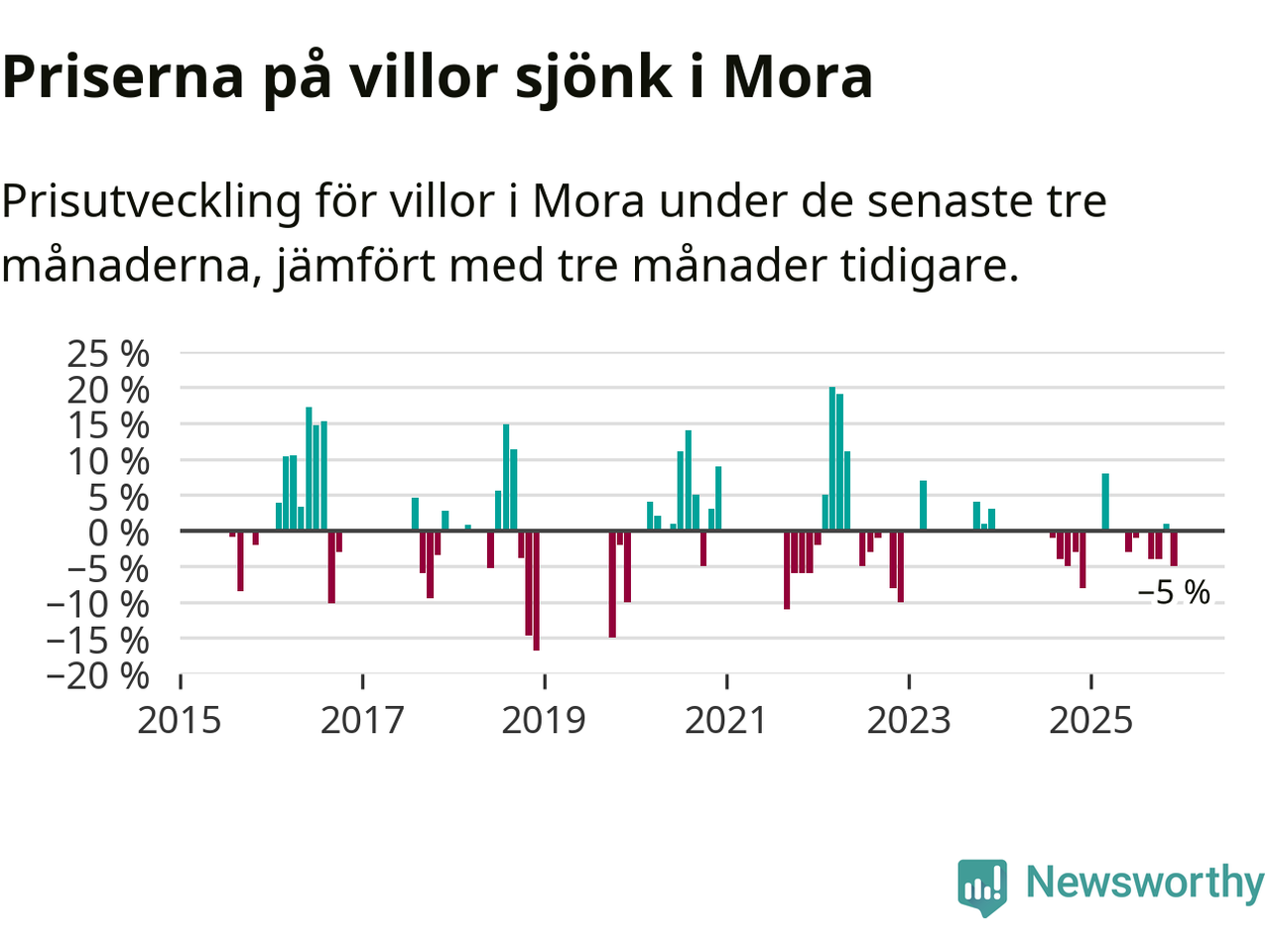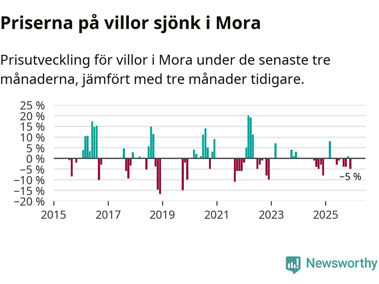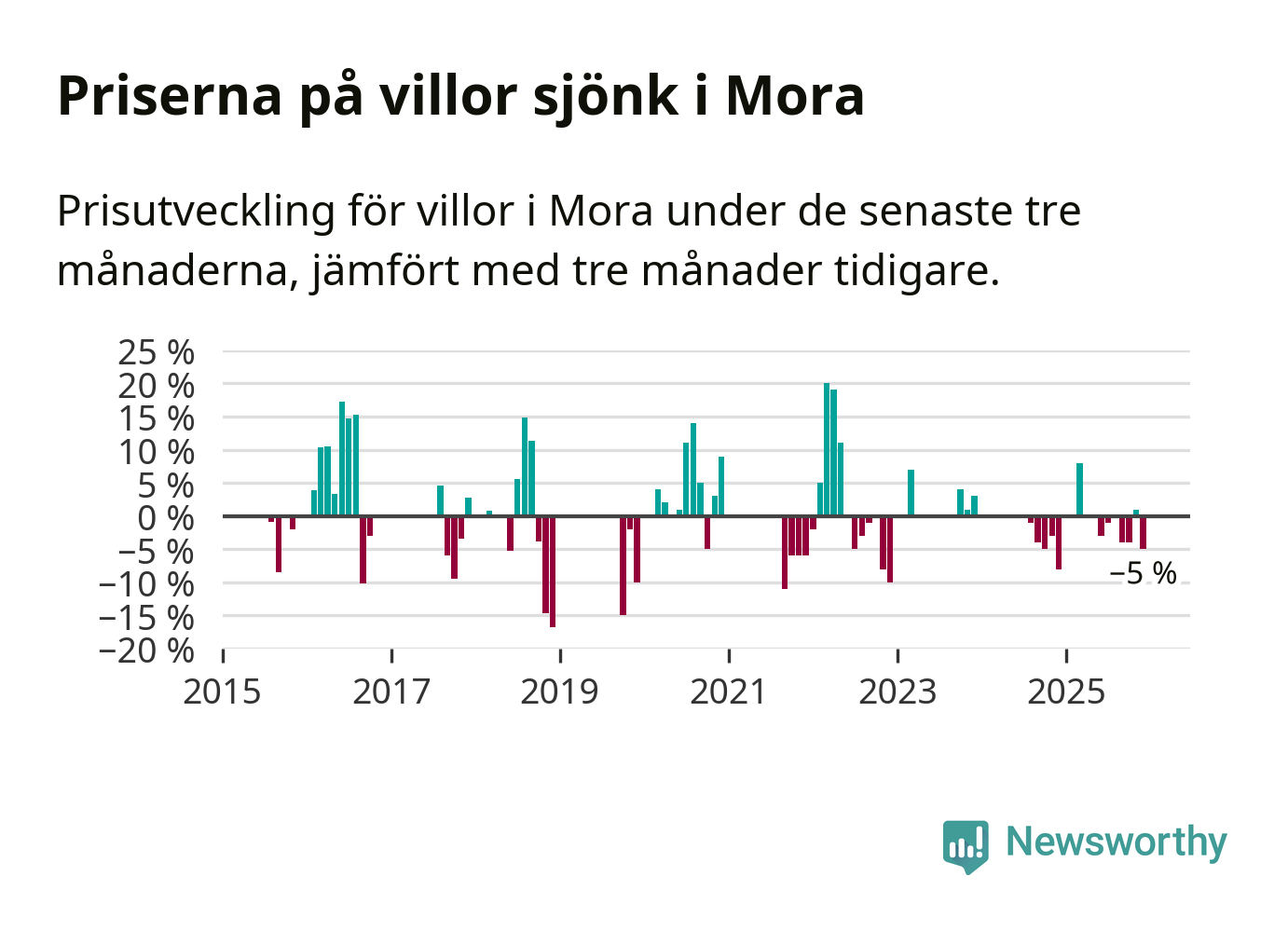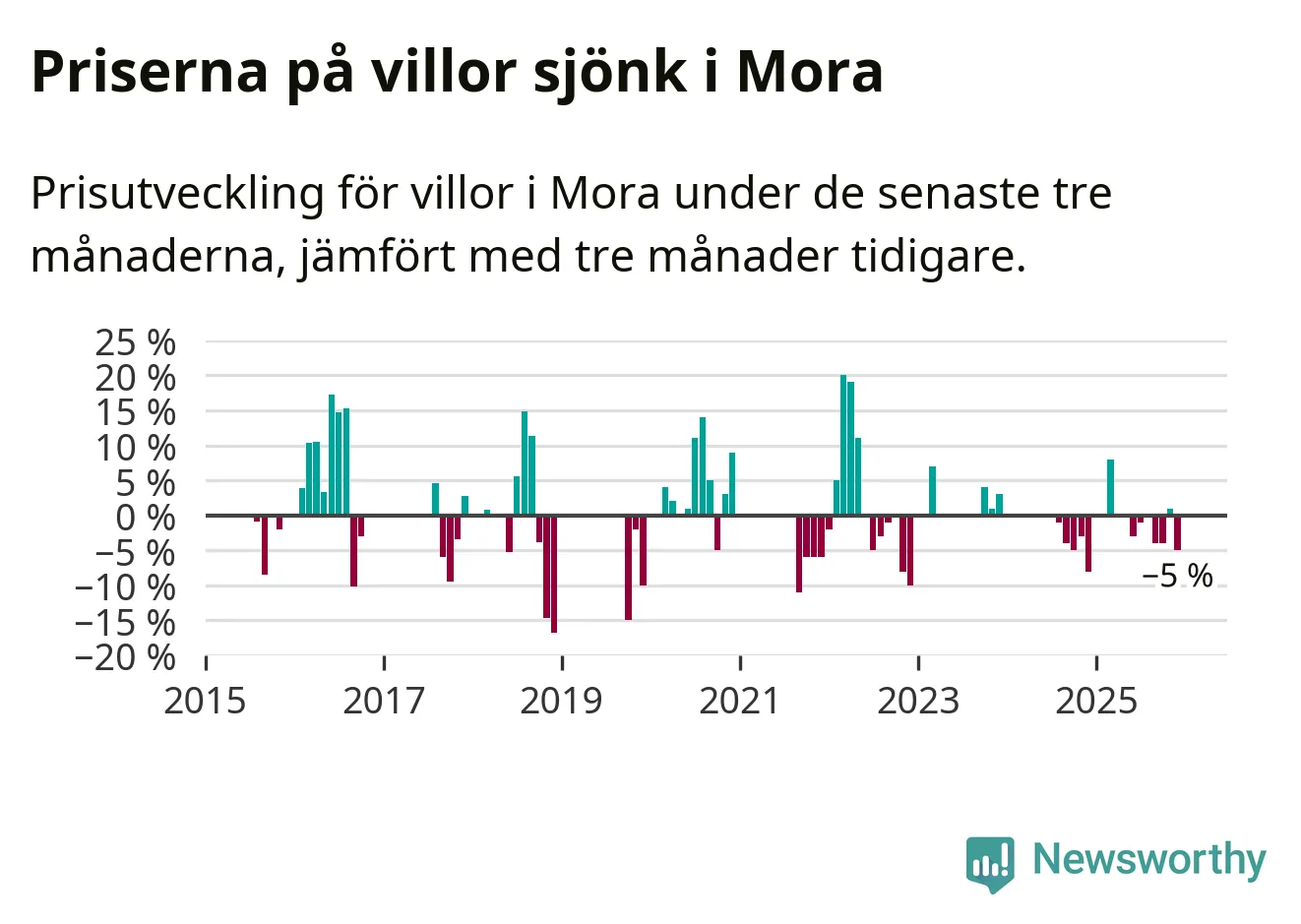 Statistiken visar även på en kännbar prisnedgång i Mora kommun. Medelpriset på försäljningarna av villor i kommunen var 5 procent lägre än för tre månader sedan. Även i hela Dalarna sjunker villapriserna. I hela länet noterades en prisnedgång på 3 procent.