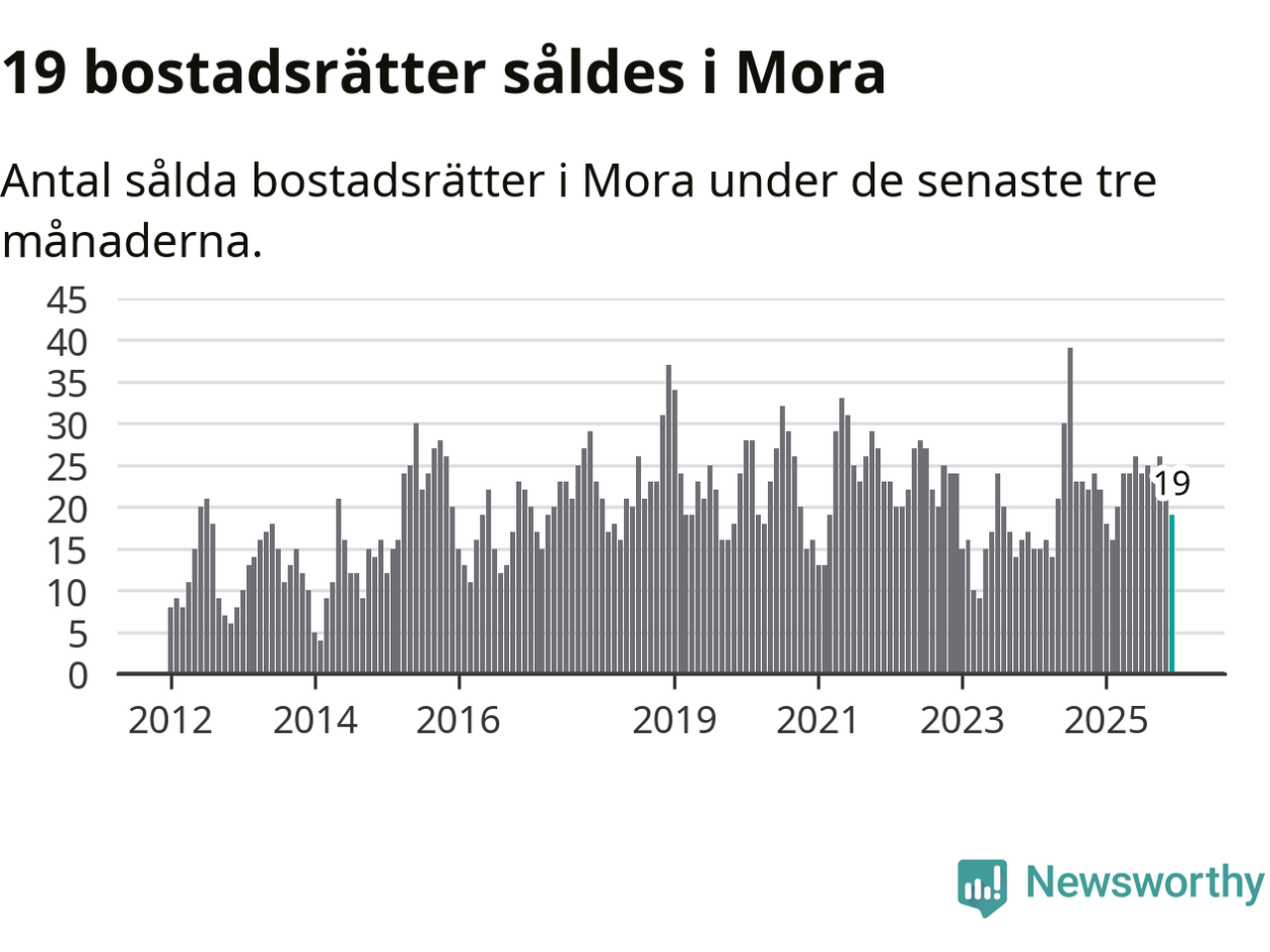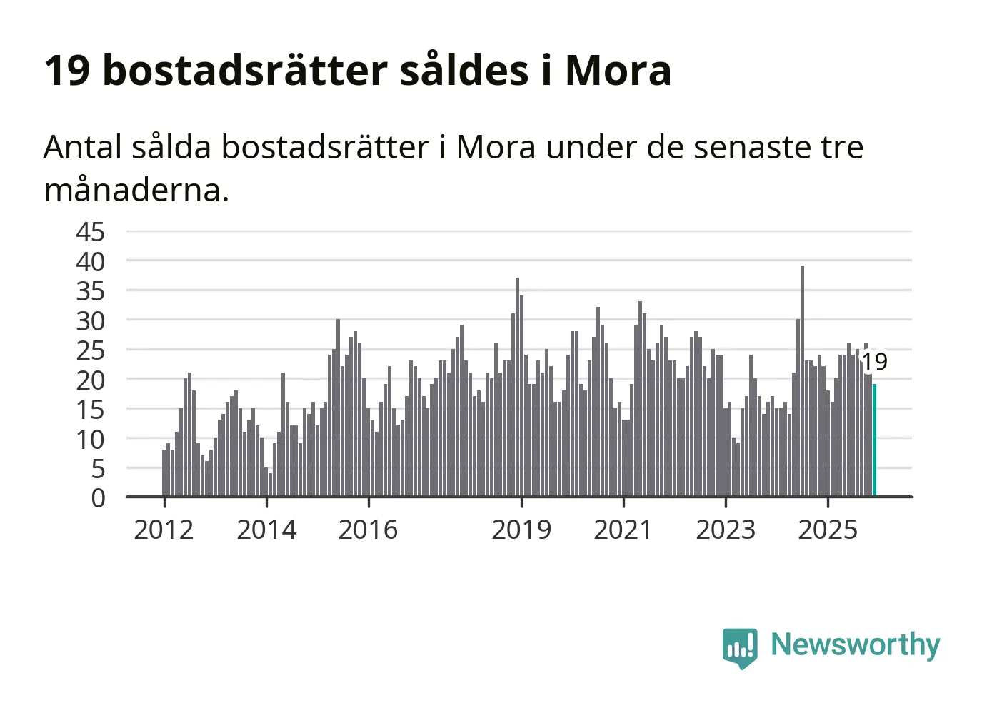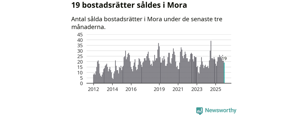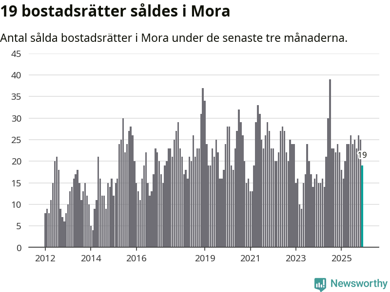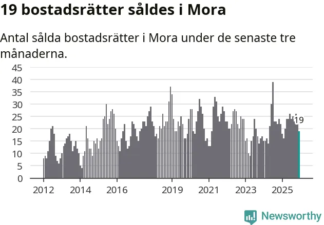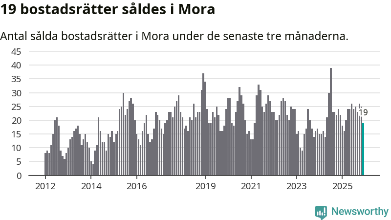 Mellan oktober och december gjordes sammanlagt 19 affärer med bostadsrätter i Mora kommun. Det kan jämföras med 22 vid motsvarande tid i fjol.