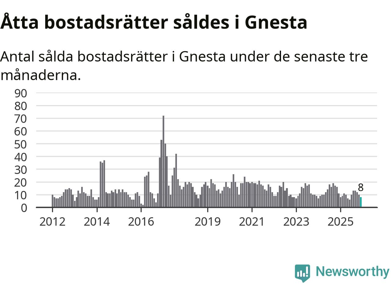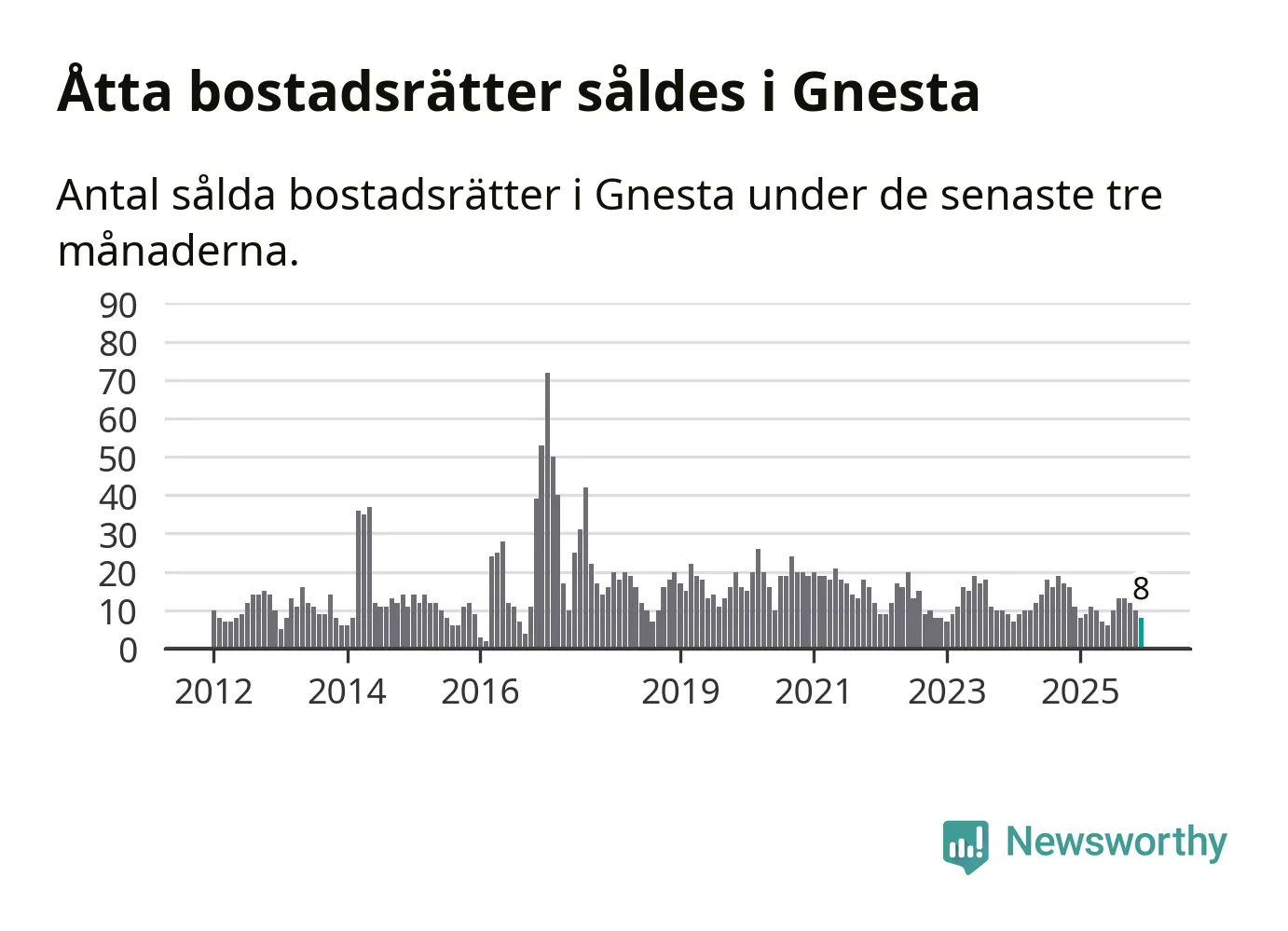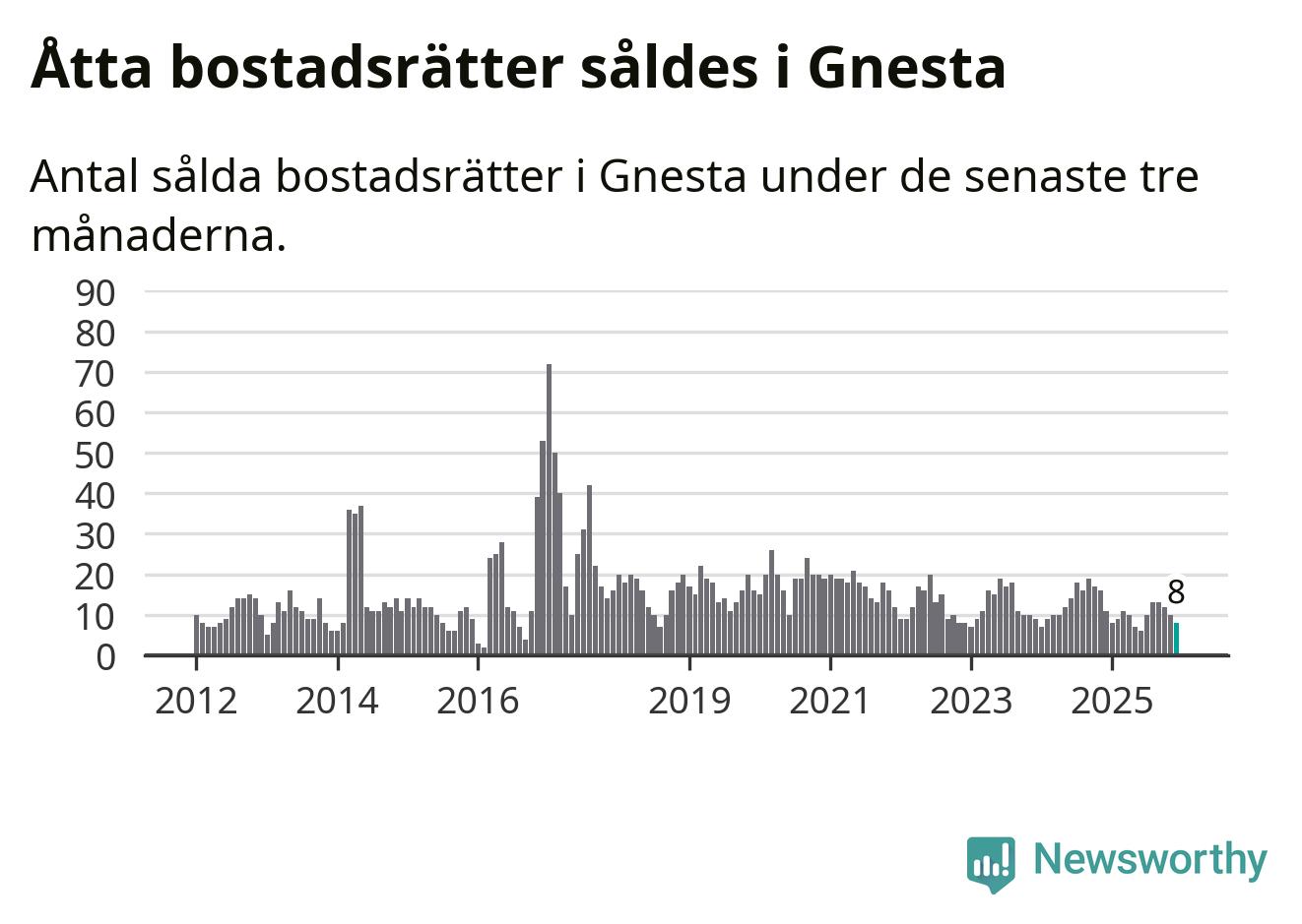 Mellan oktober och december gjordes sammanlagt åtta affärer med bostadsrätter i Gnesta kommun. Det kan jämföras med elva vid motsvarande tid i fjol.