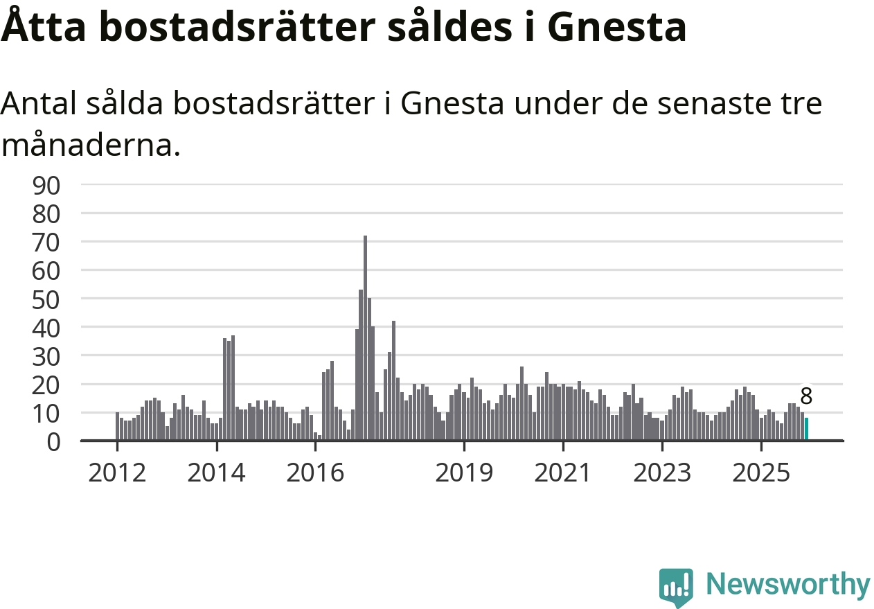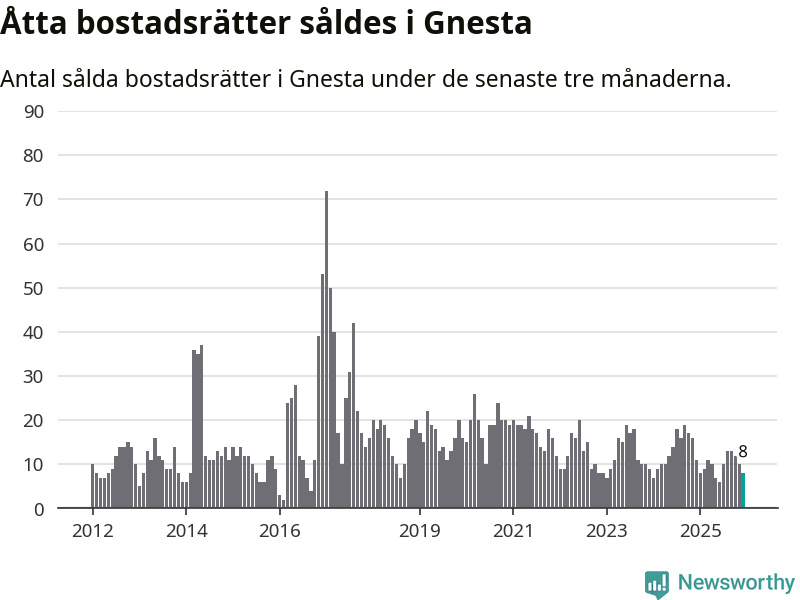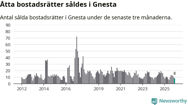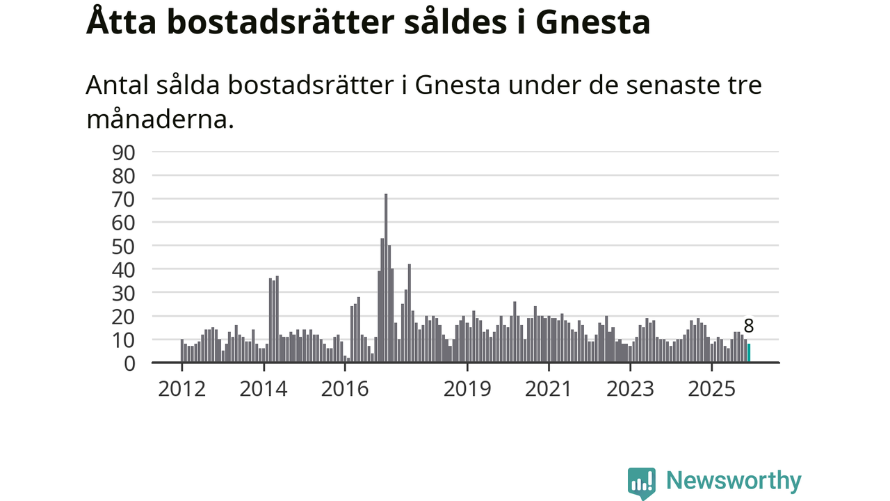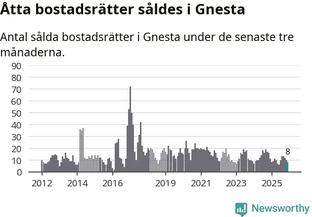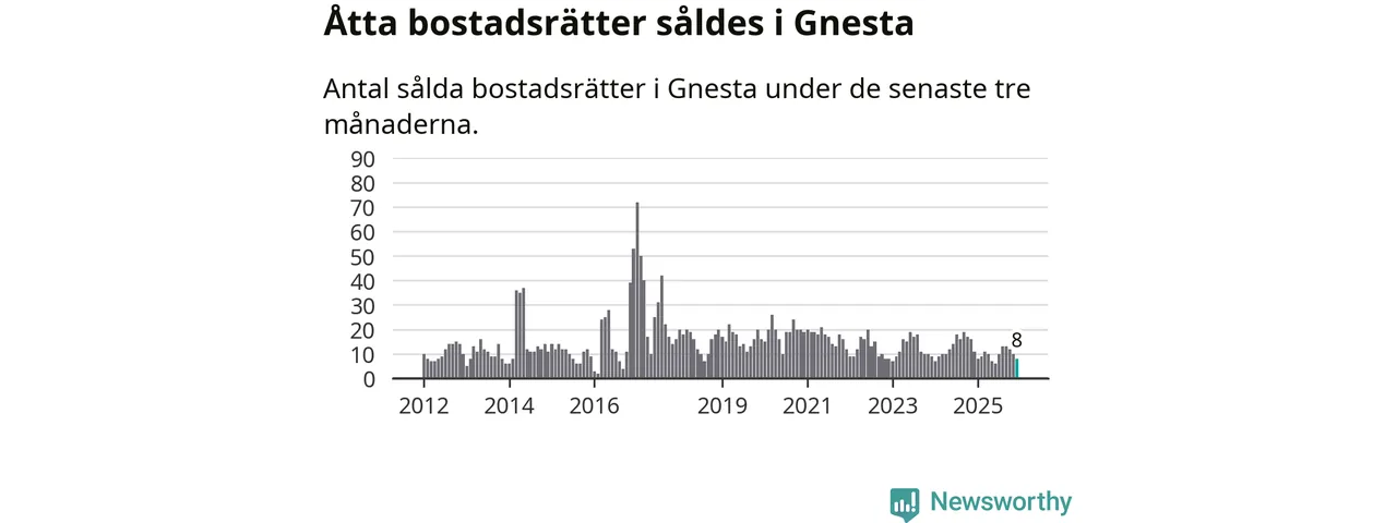 Mellan oktober och december gjordes sammanlagt åtta affärer med bostadsrätter i Gnesta kommun. Det kan jämföras med elva vid motsvarande tid i fjol.