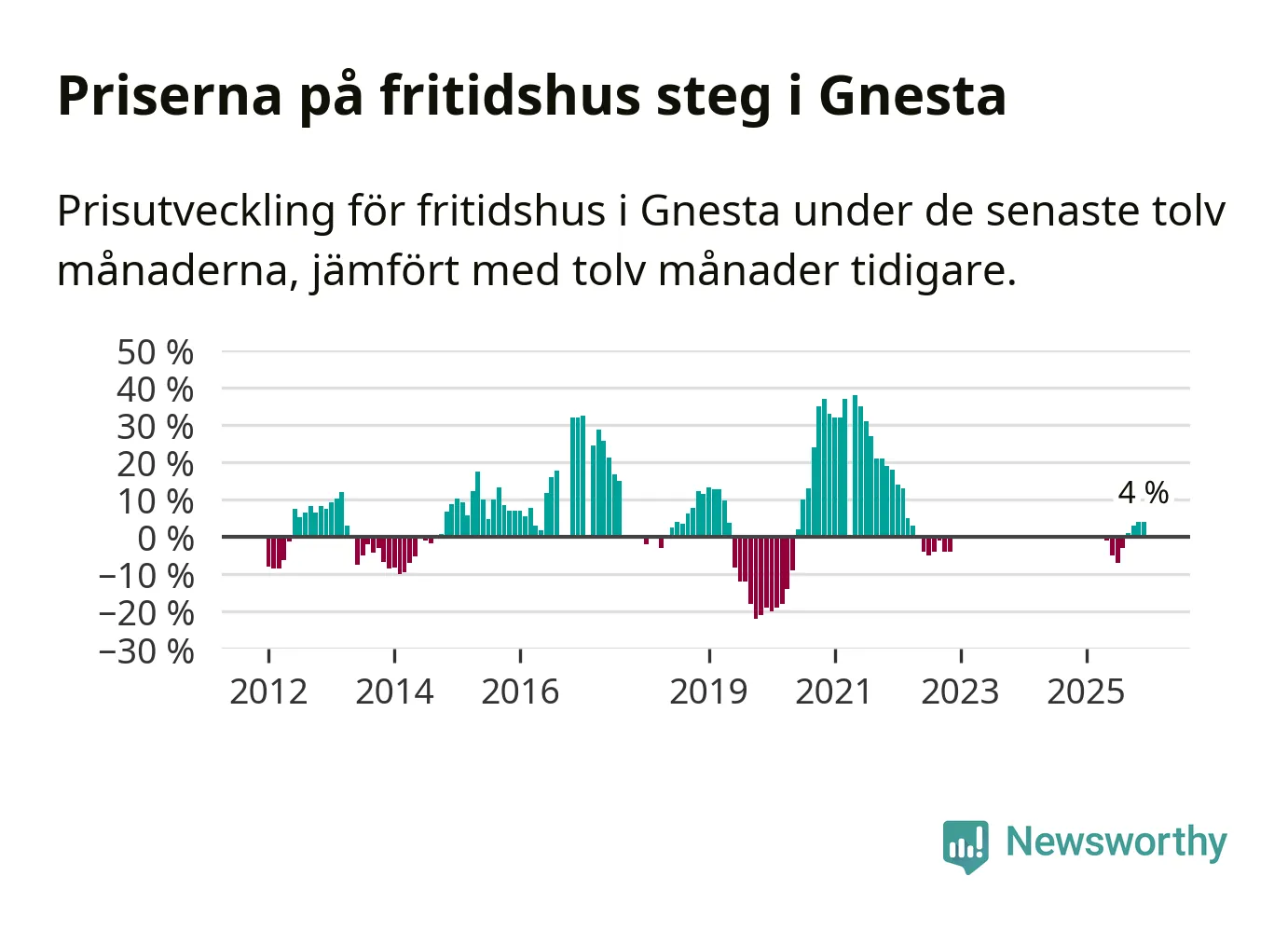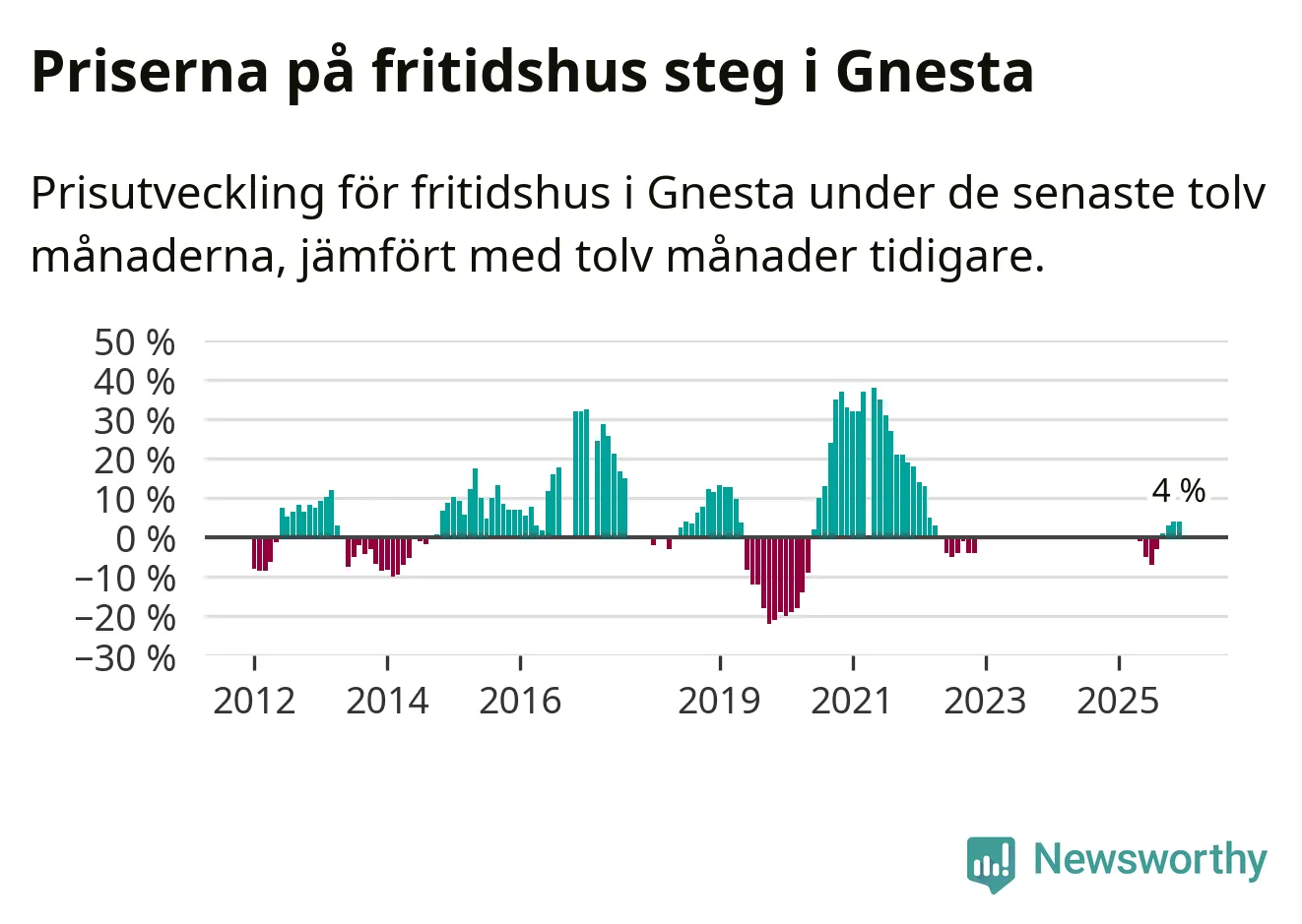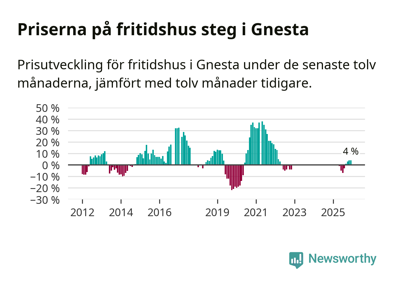 Priserna på fritidshus har gått upp i Gnesta kommun. Medelpriset på försäljningarna under de senaste tolv månaderna visar på en uppgång med 4 procent.