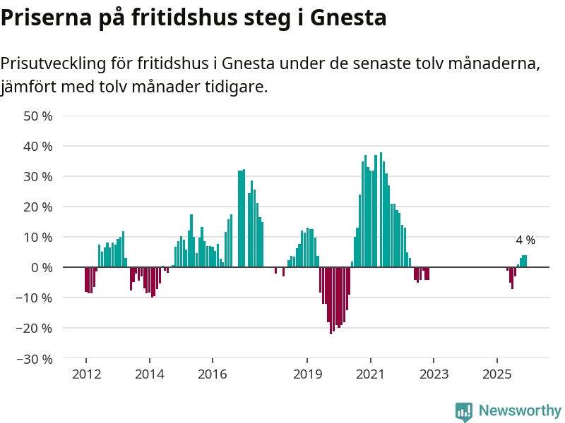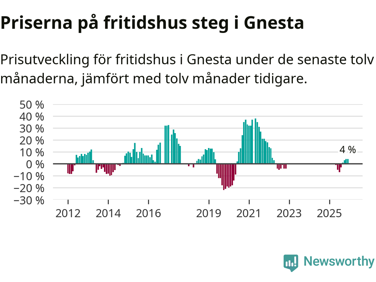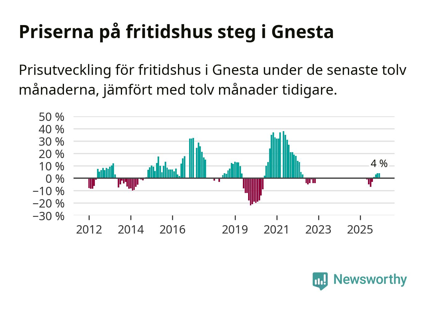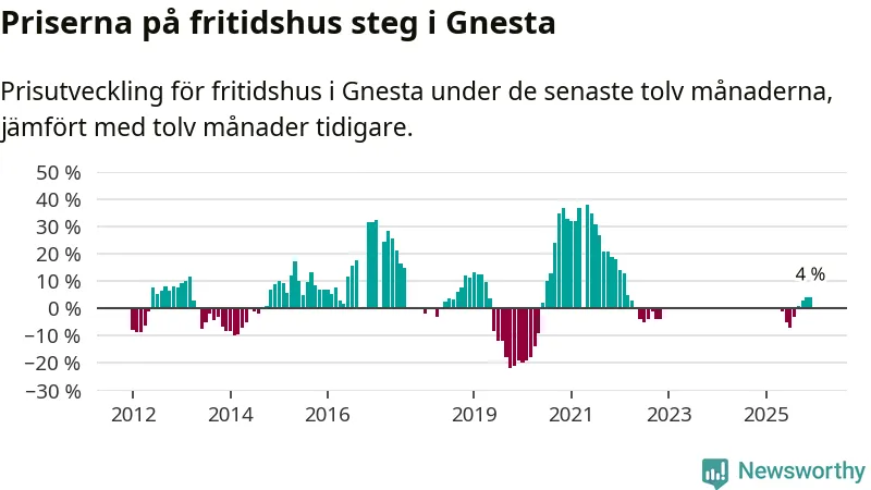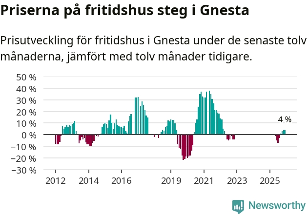 Priserna på fritidshus har gått upp i Gnesta kommun. Medelpriset på försäljningarna under de senaste tolv månaderna visar på en uppgång med 4 procent.