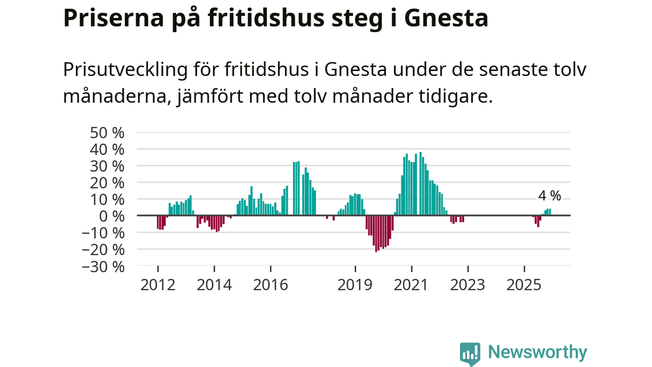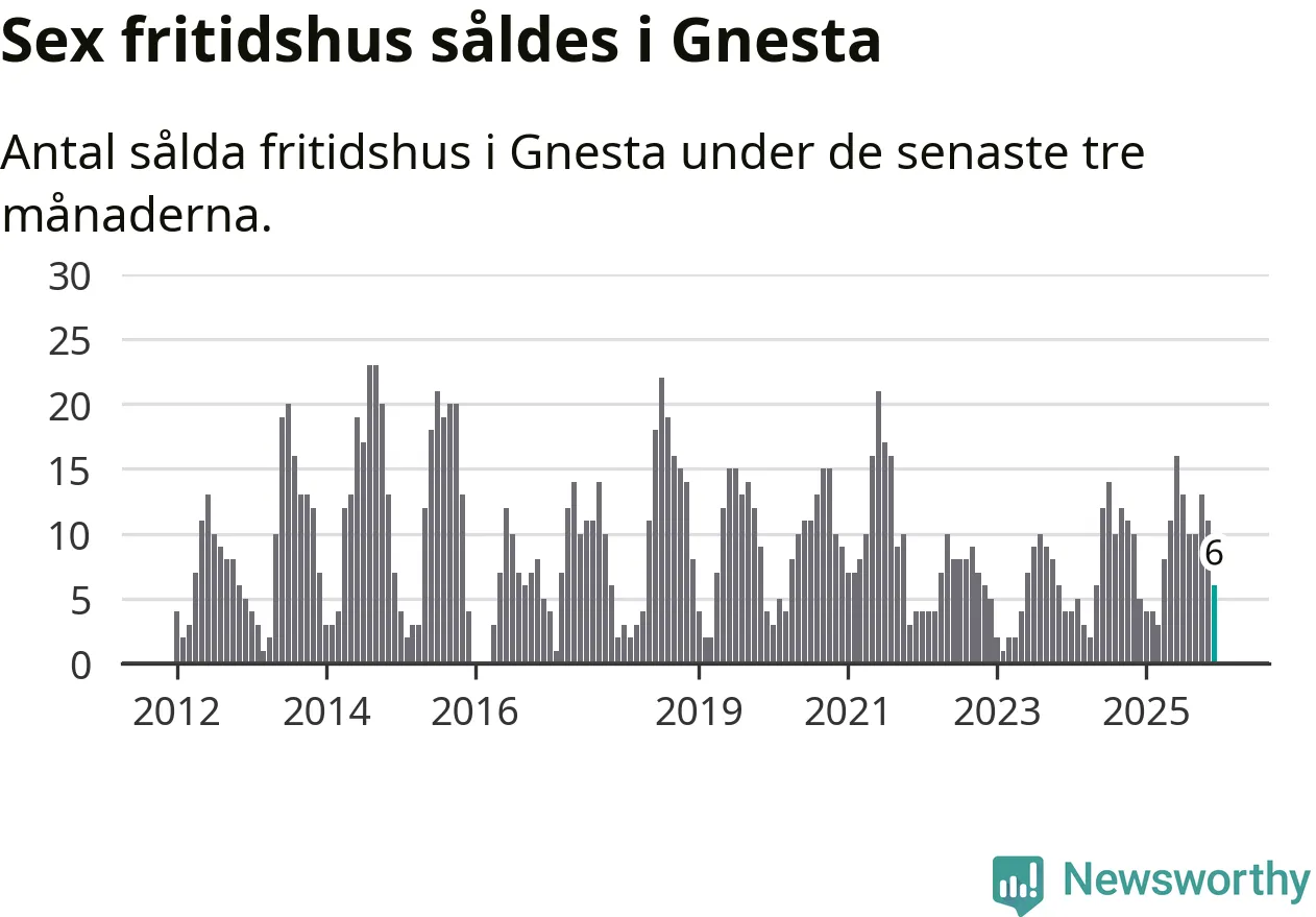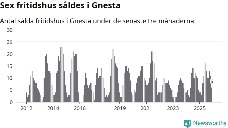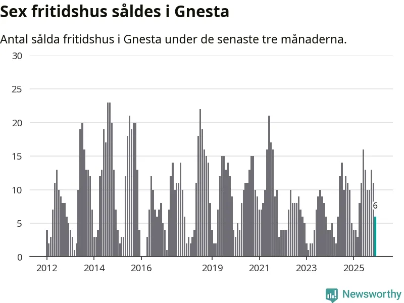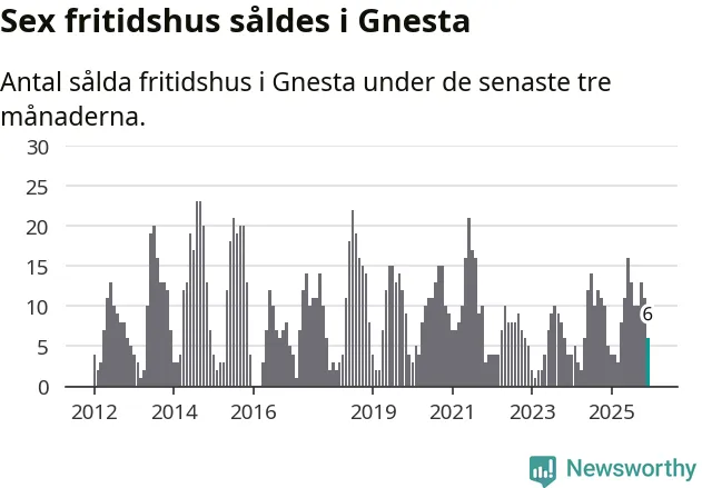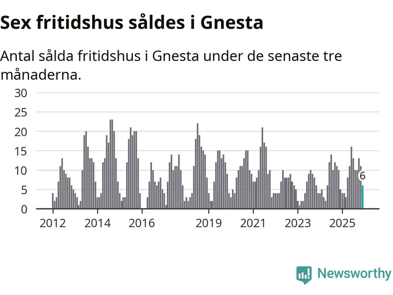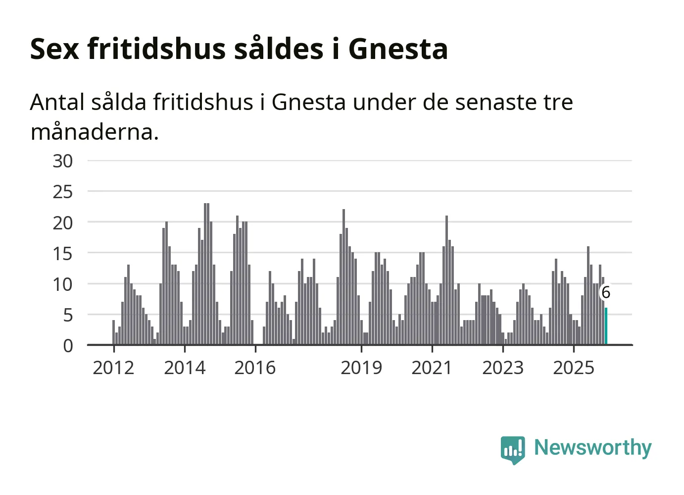 Sammanlagt såldes sex fritidshus i Gnesta kommun mellan oktober 2025 och december 2025 till ett genomsnittligt pris på 2,1 miljoner kronor. I fjol gjordes fem affärer vid den här tiden på året.