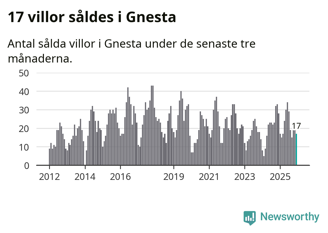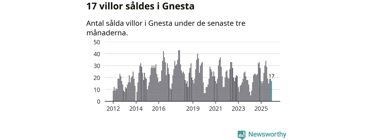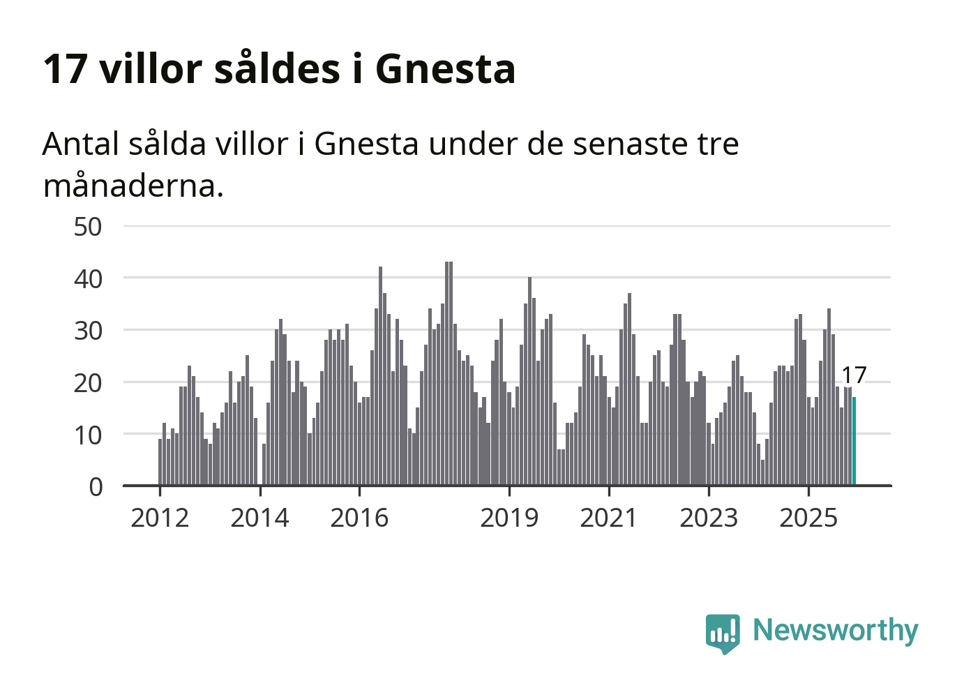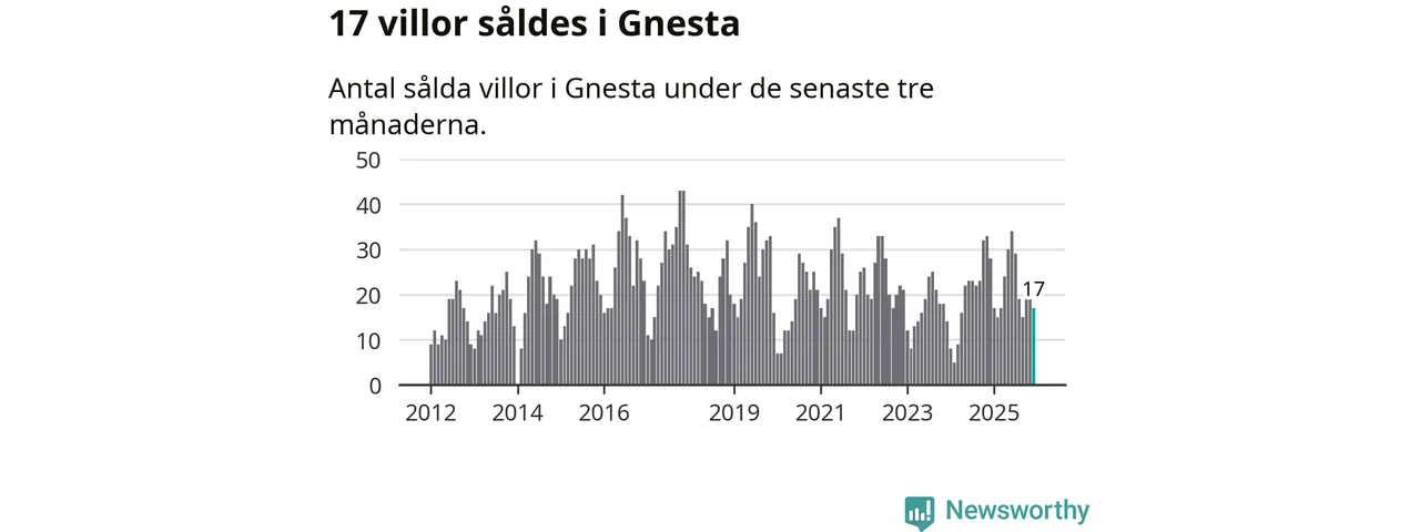 Mellan oktober och december gjordes sammanlagt 17 affärer med villor i Gnesta kommun. Det kan jämföras med 28 vid motsvarande tid i fjol.