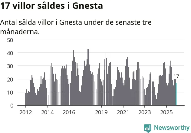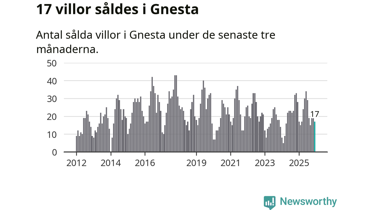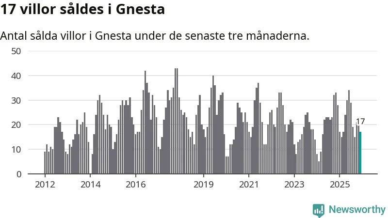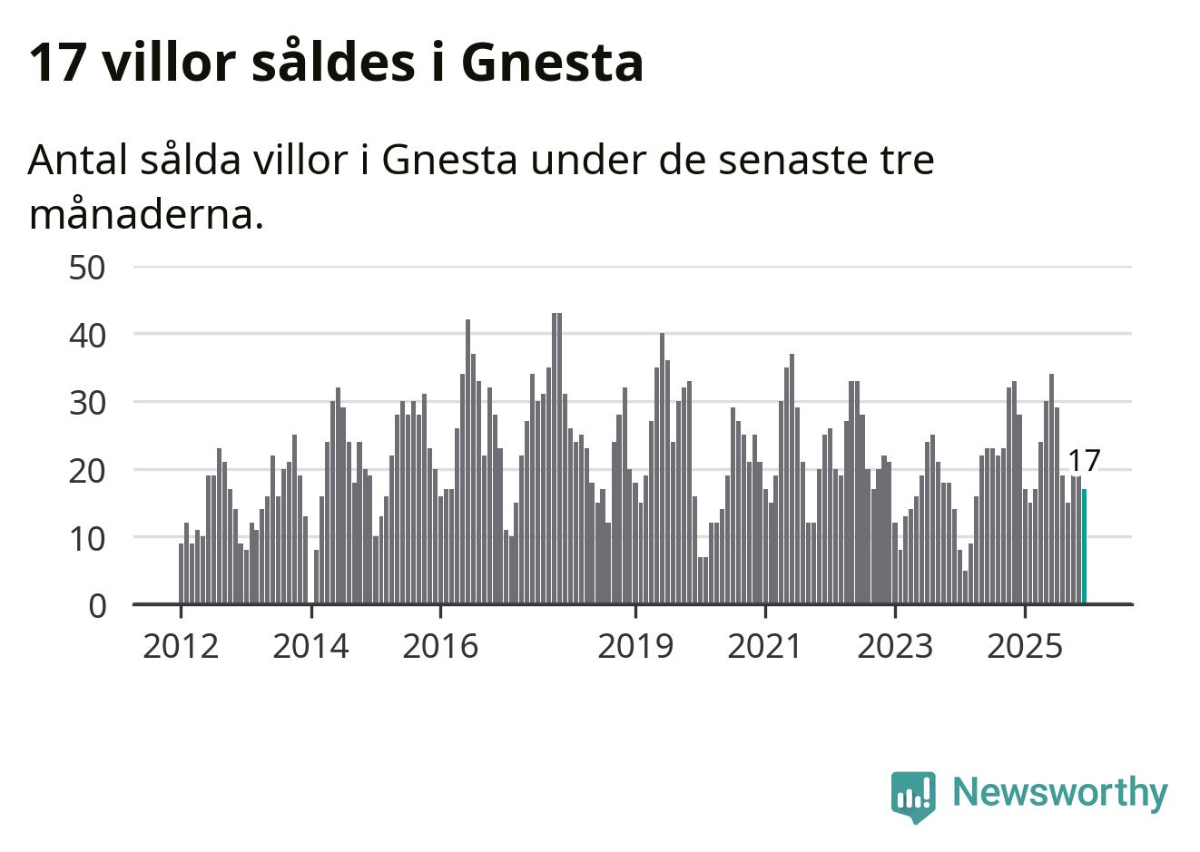 Mellan oktober och december gjordes sammanlagt 17 affärer med villor i Gnesta kommun. Det kan jämföras med 28 vid motsvarande tid i fjol.