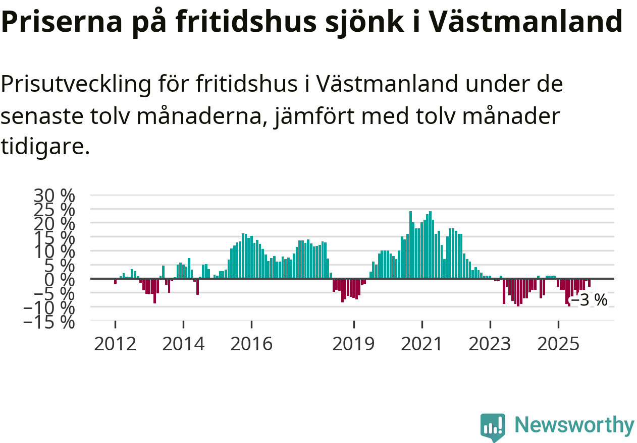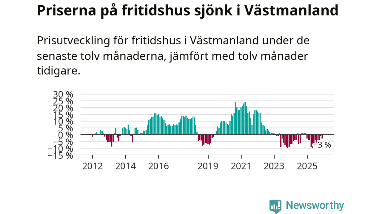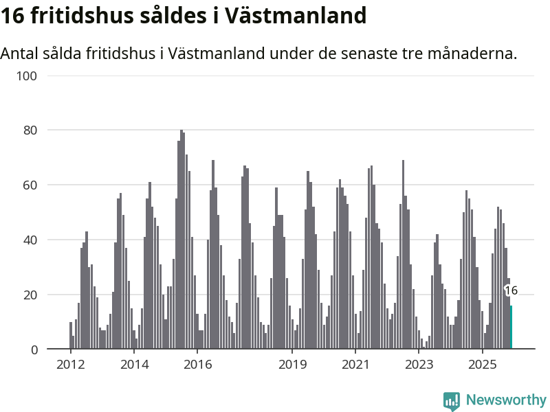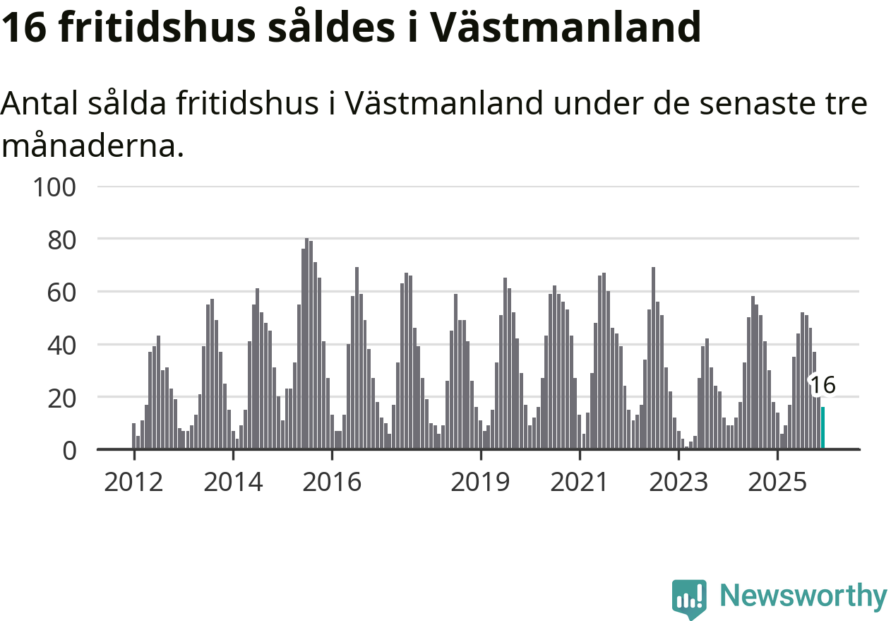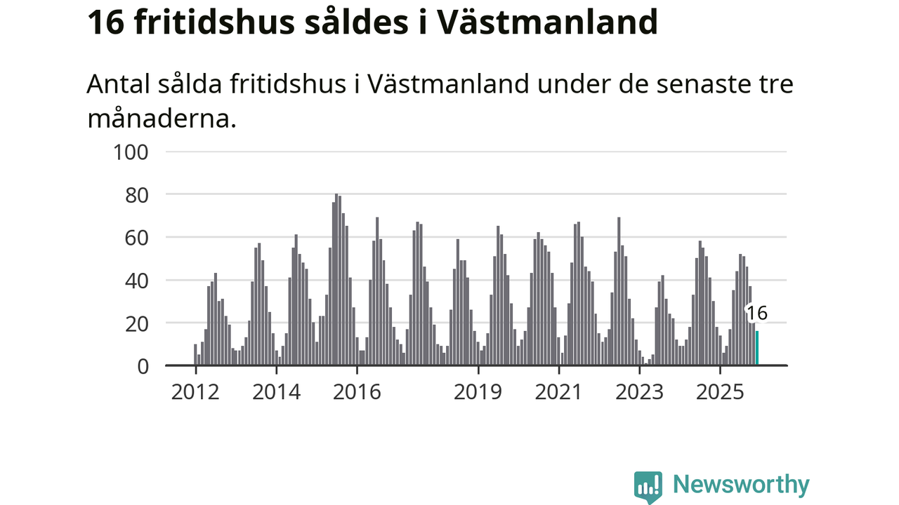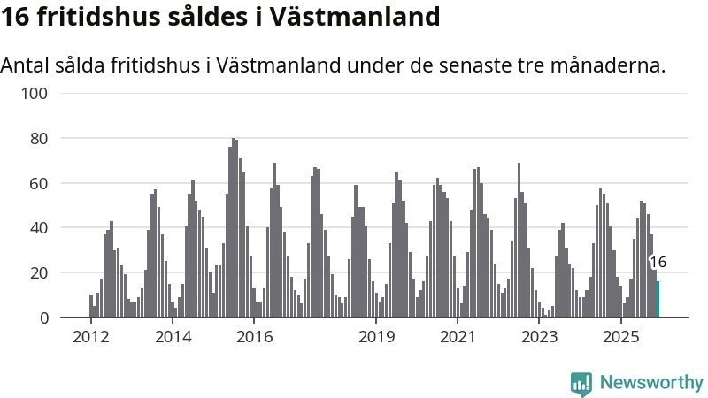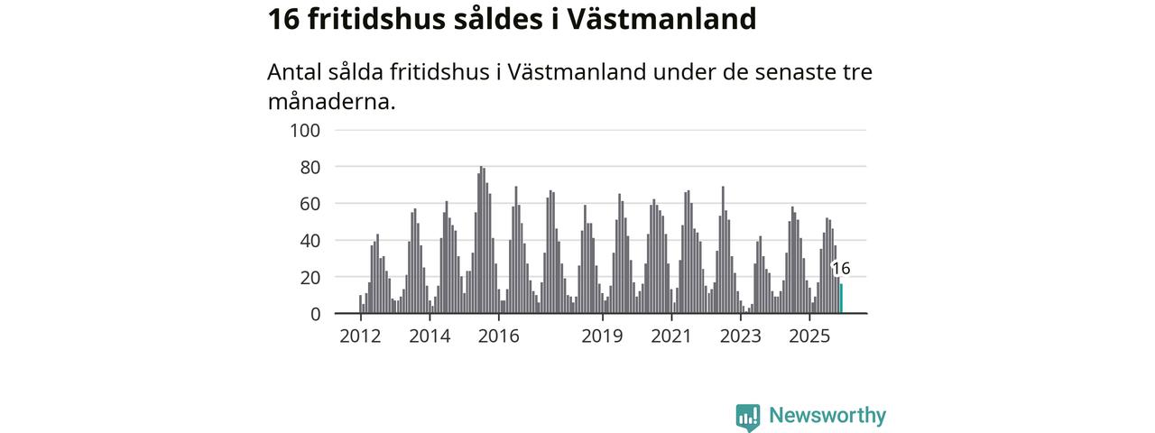 Sammanlagt såldes 16 fritidshus i Västmanlands län mellan oktober 2025 och december 2025 till ett genomsnittligt pris på 1,2 miljoner kronor. I fjol gjordes 18 affärer vid den här tiden på året.