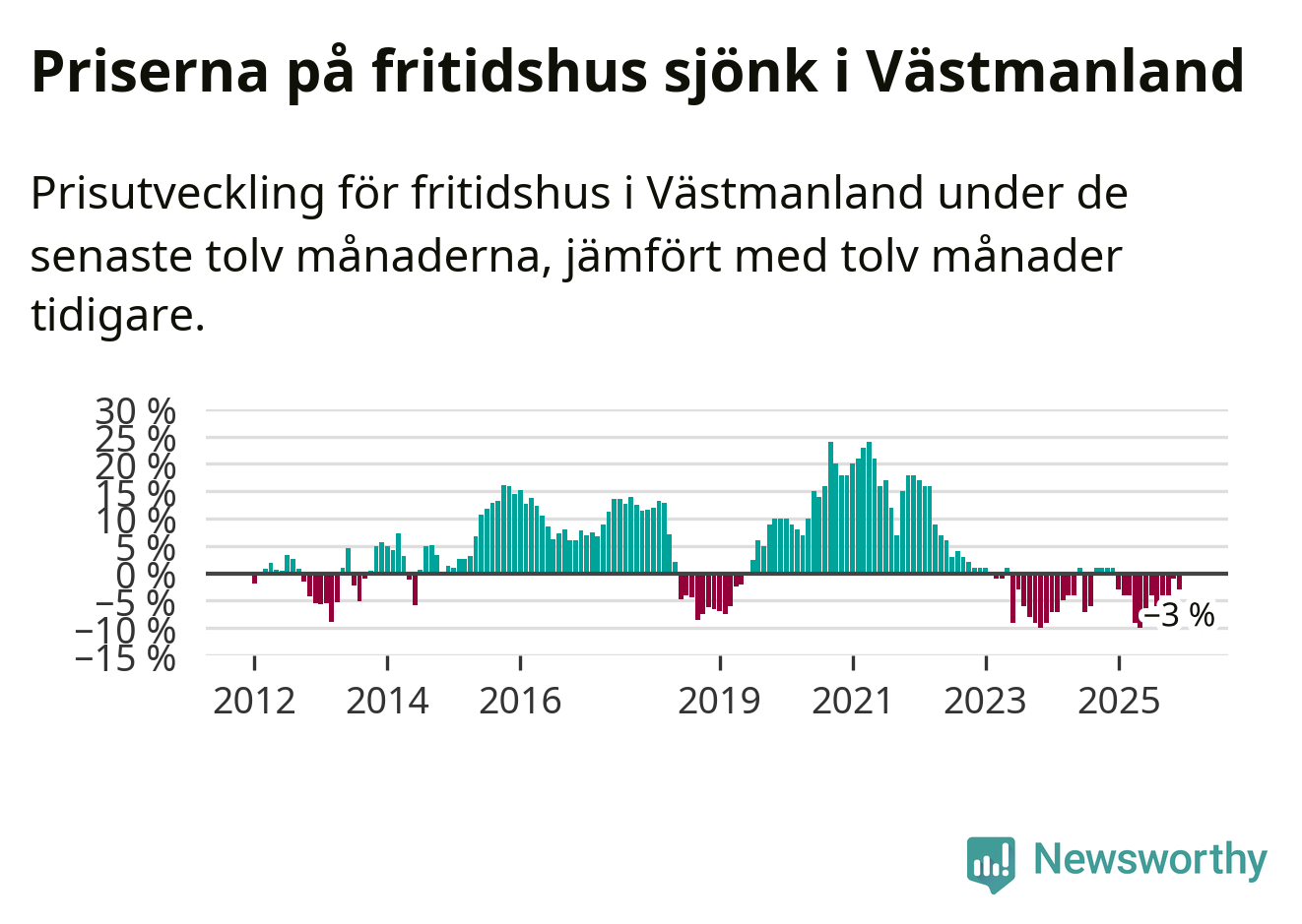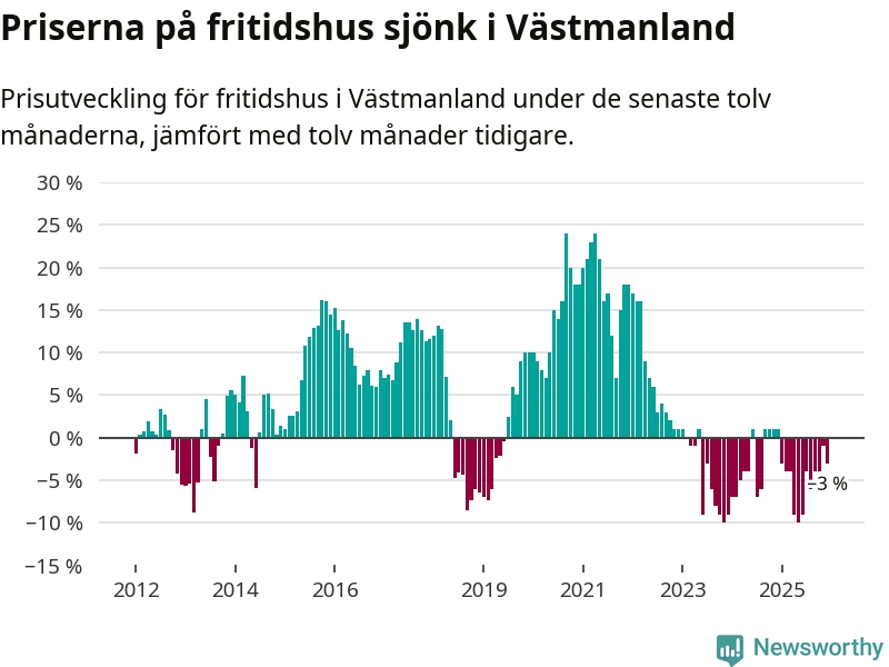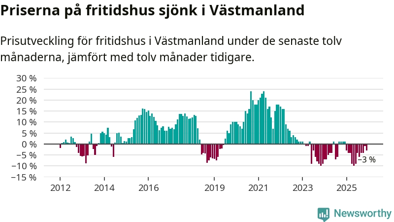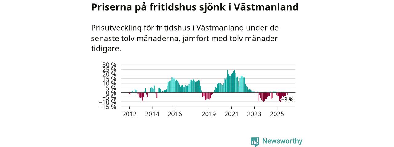 Priserna på fritidshus har gått ner i Västmanlands län. Medelpriset på försäljningarna under de senaste tolv månaderna visar på en nedgång med 3 procent.