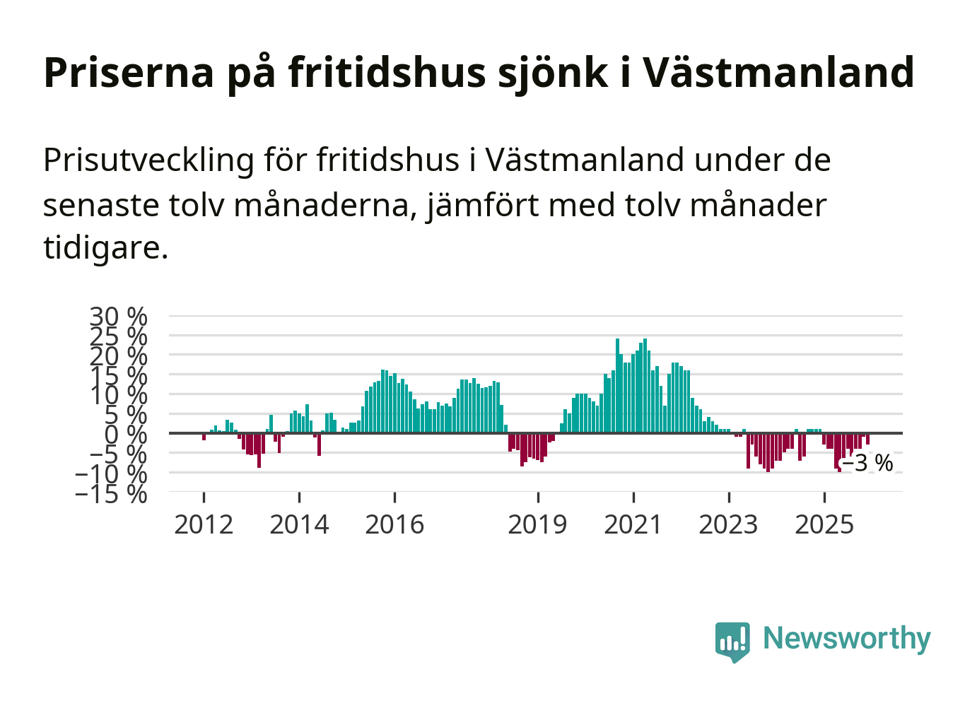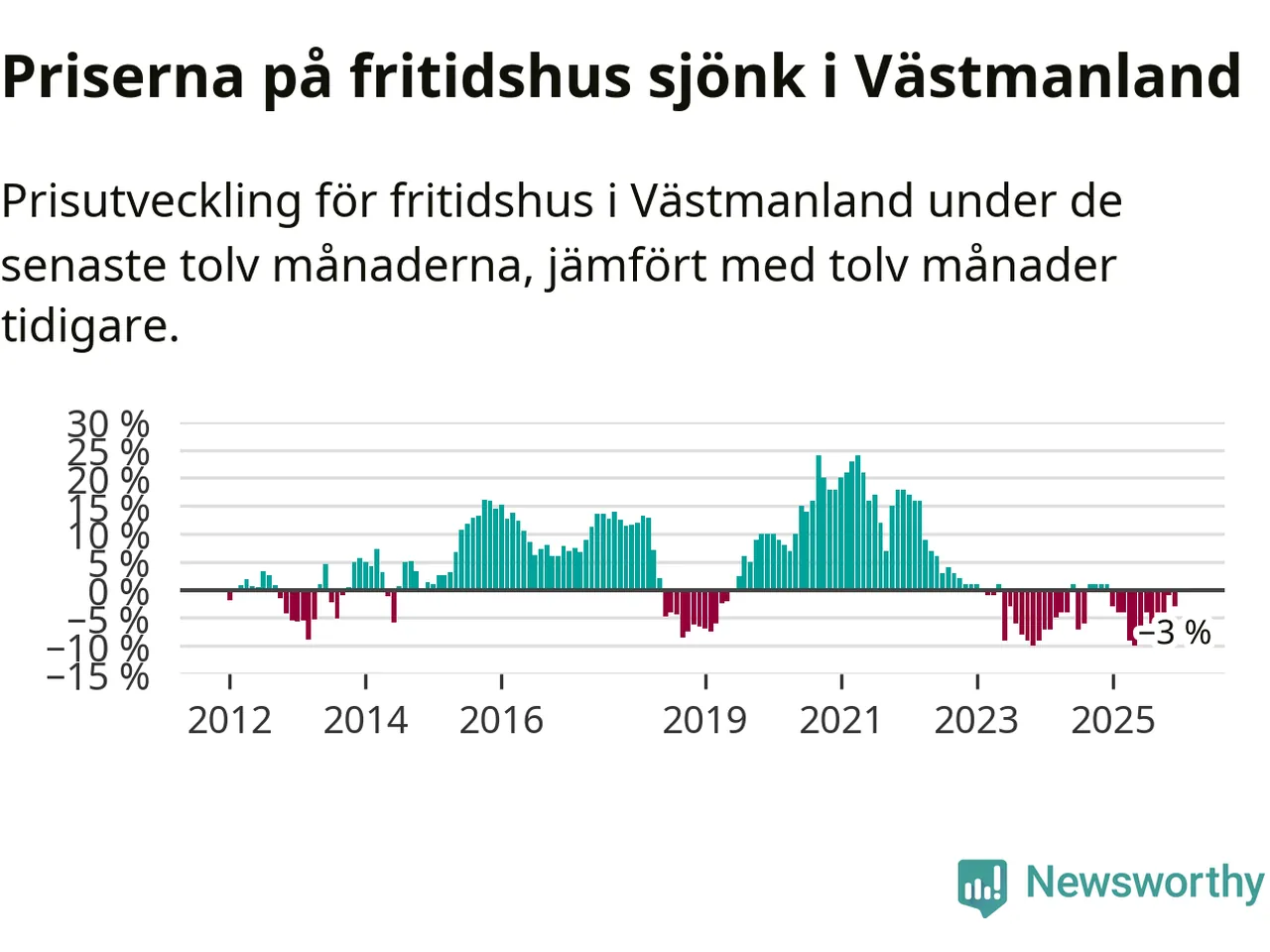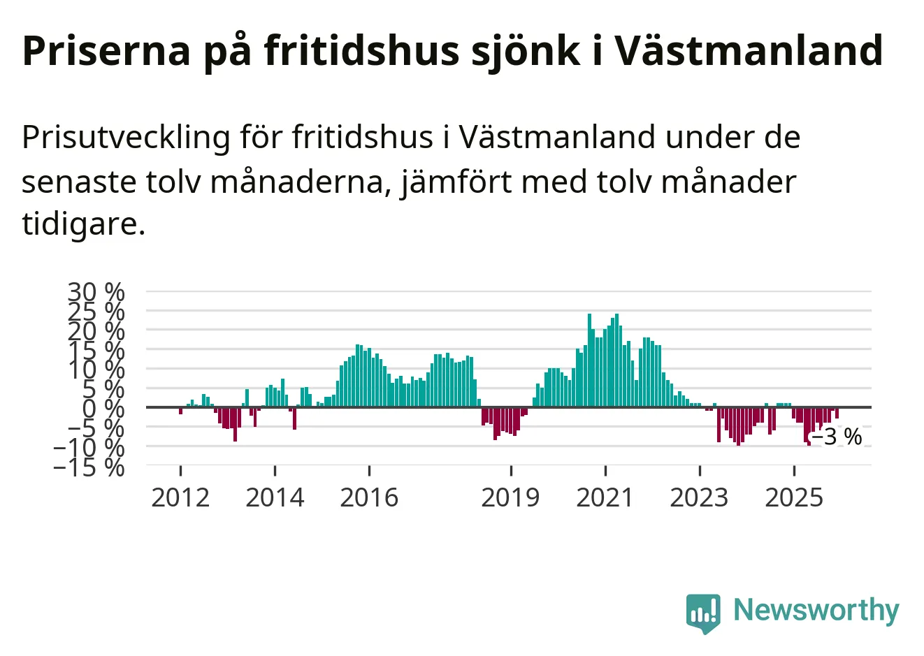 Priserna på fritidshus har gått ner i Västmanlands län. Medelpriset på försäljningarna under de senaste tolv månaderna visar på en nedgång med 3 procent.