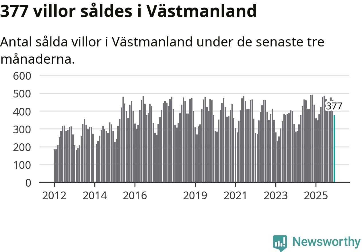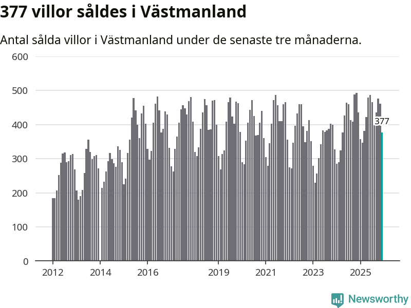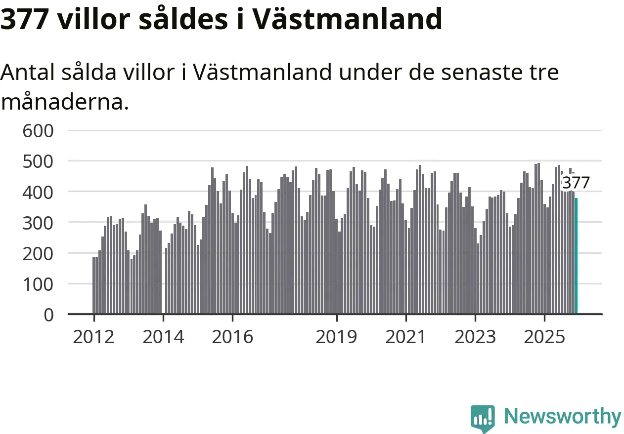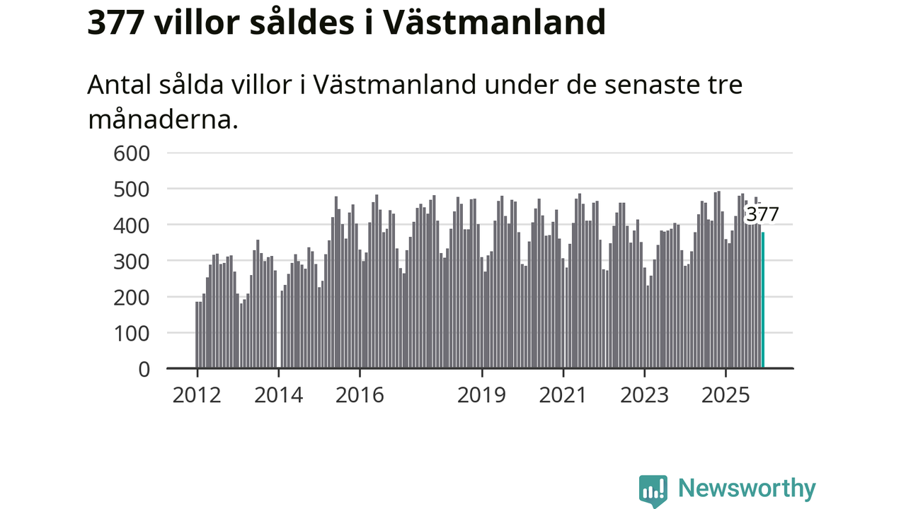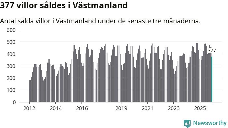 Sammanlagt såldes 377 villor i Västmanlands län mellan oktober och december till ett genomsnittligt pris på 3,2 miljoner kronor. I fjol gjordes 435 affärer vid den här tiden på året.