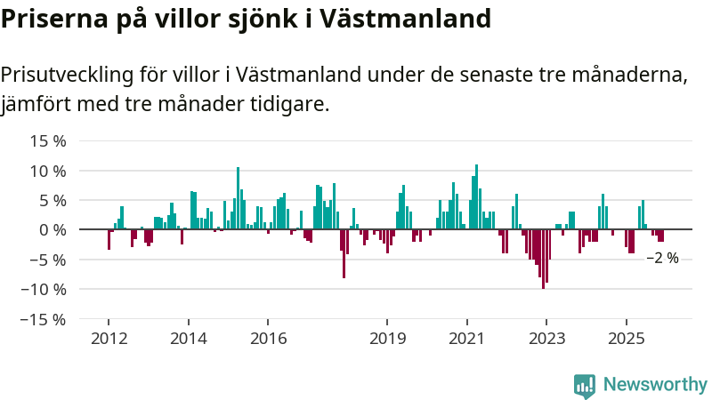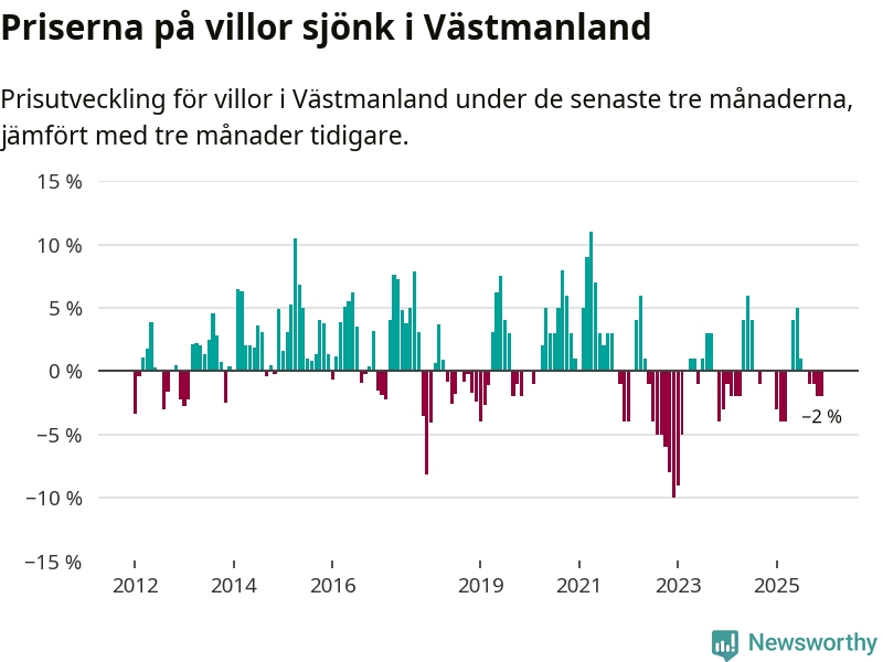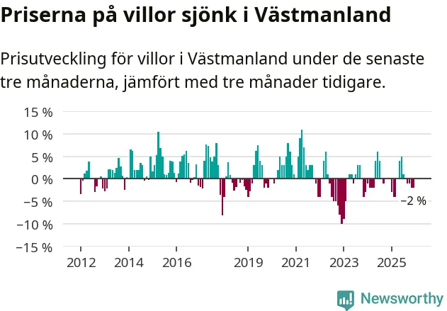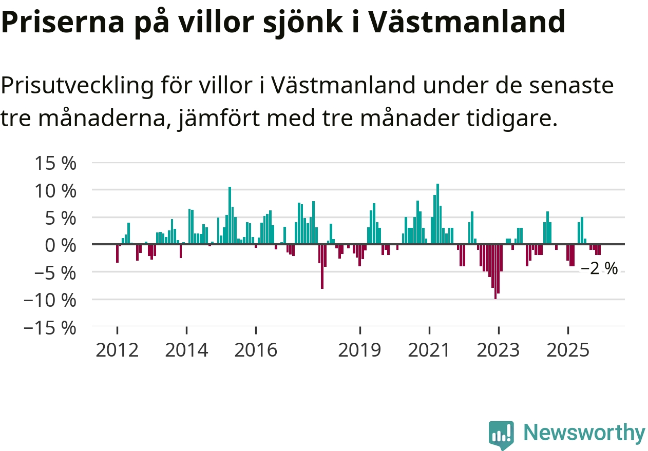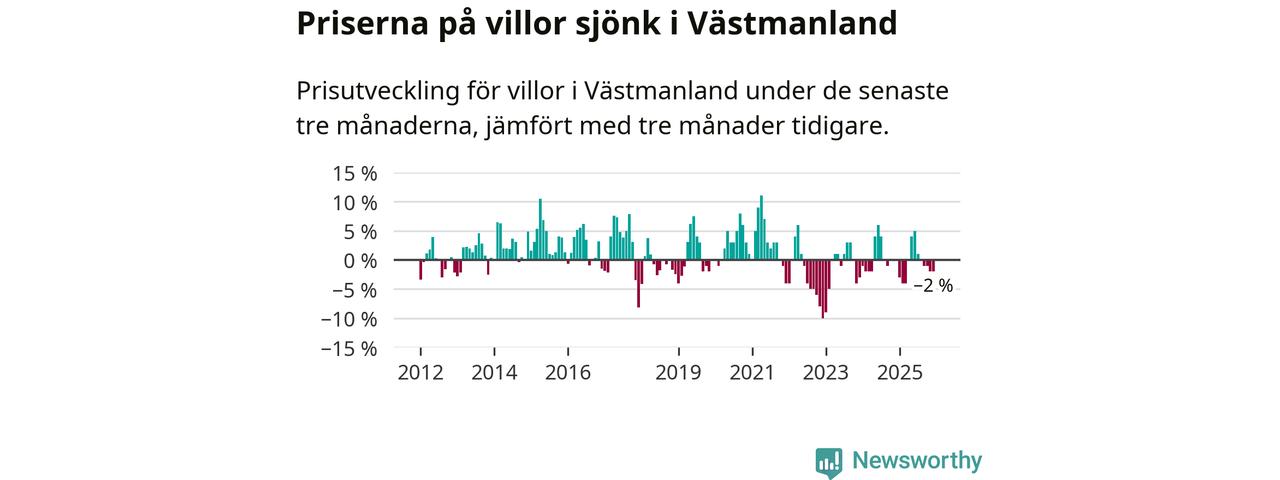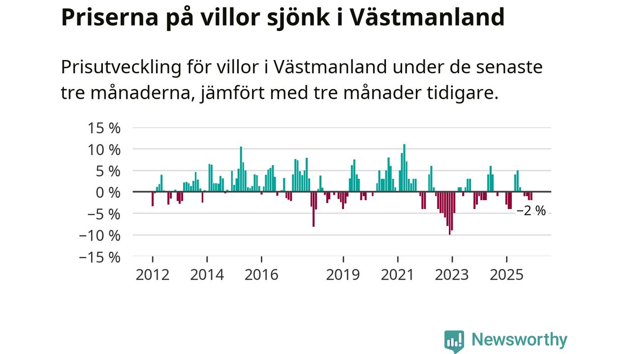 På grund av få försäljningar saknas uppgifter om prisförändringar för villor i sju av länets tio kommuner. Bland de tre vi har uppgifter om sjunker priserna i samtliga.I Västmanlands län som helhet går villapriserna ner med 2 procent. Även i hela Sverige sjunker villapriserna. I hela riket noterades en prisnedgång på 2 procent.