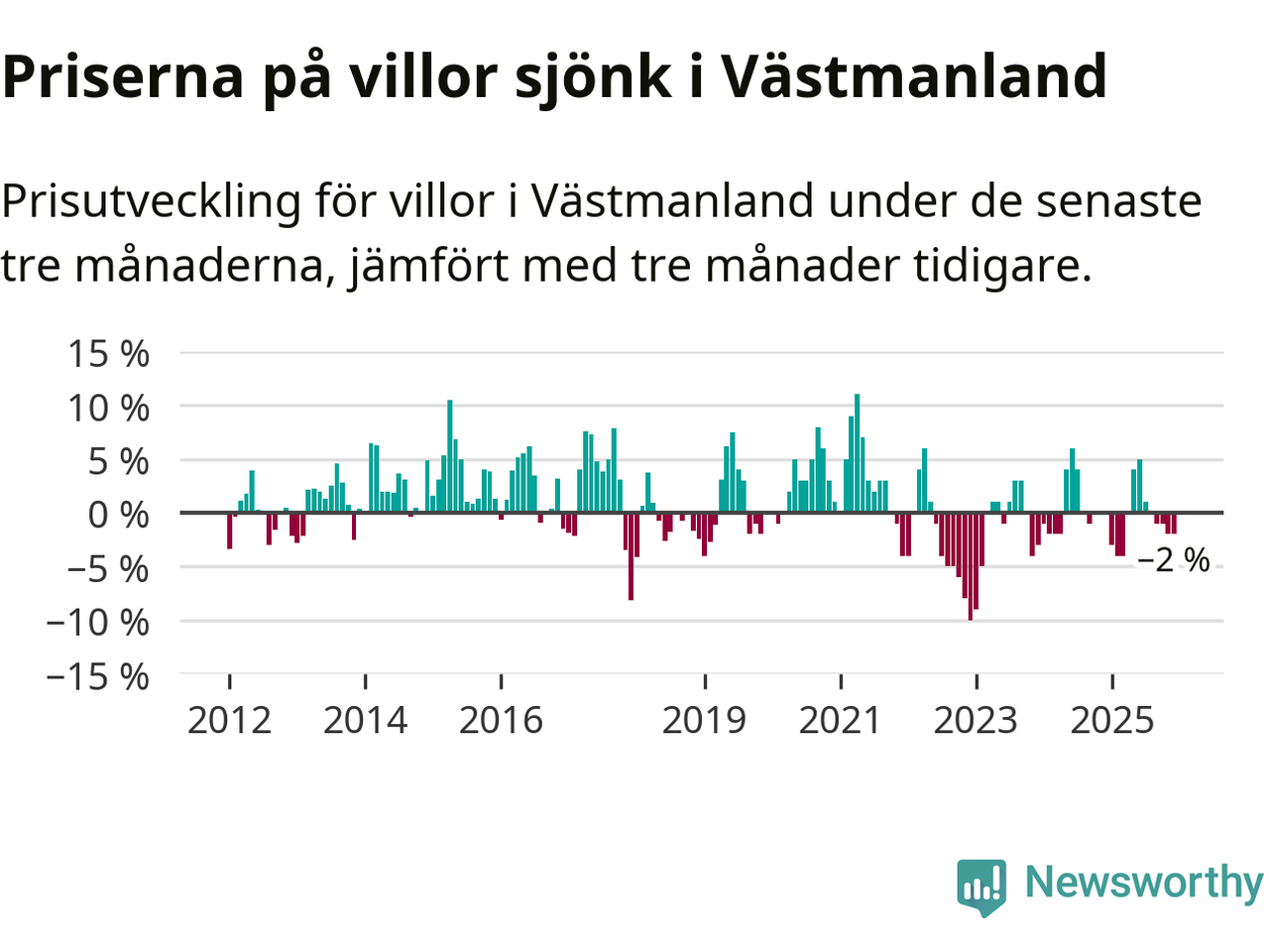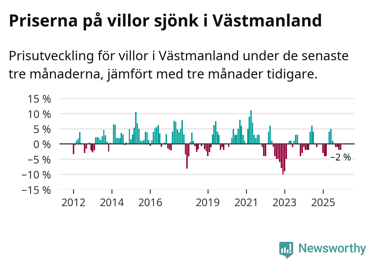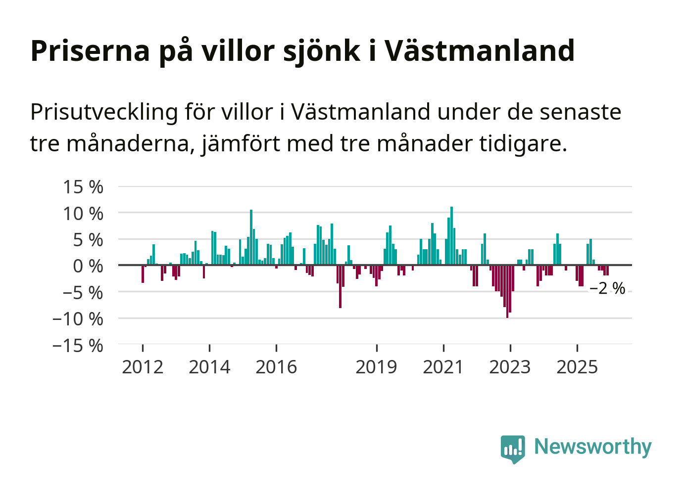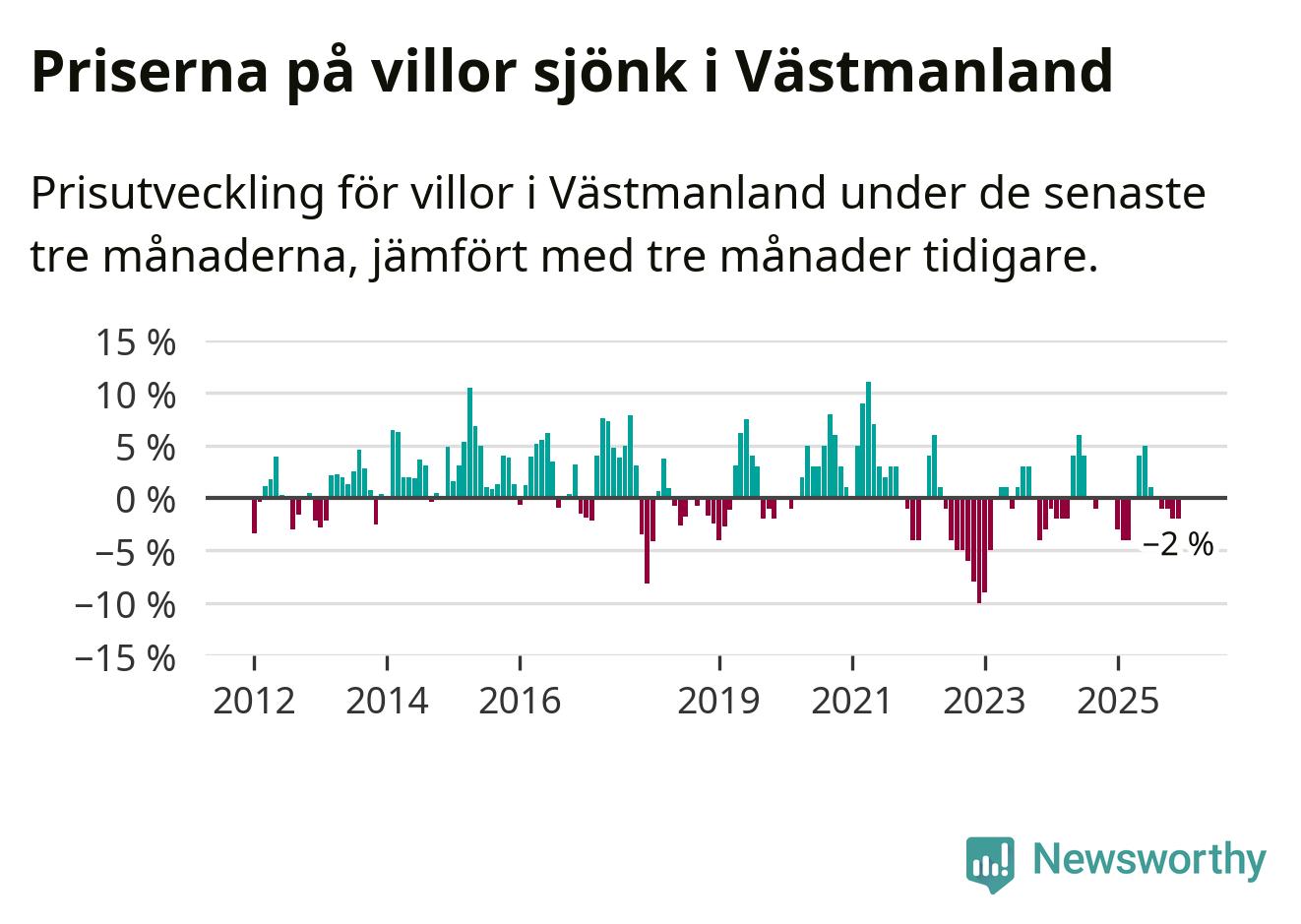 På grund av få försäljningar saknas uppgifter om prisförändringar för villor i sju av länets tio kommuner. Bland de tre vi har uppgifter om sjunker priserna i samtliga.I Västmanlands län som helhet går villapriserna ner med 2 procent. Även i hela Sverige sjunker villapriserna. I hela riket noterades en prisnedgång på 2 procent.