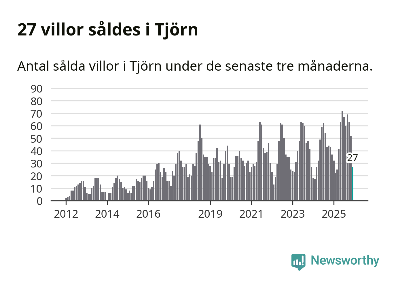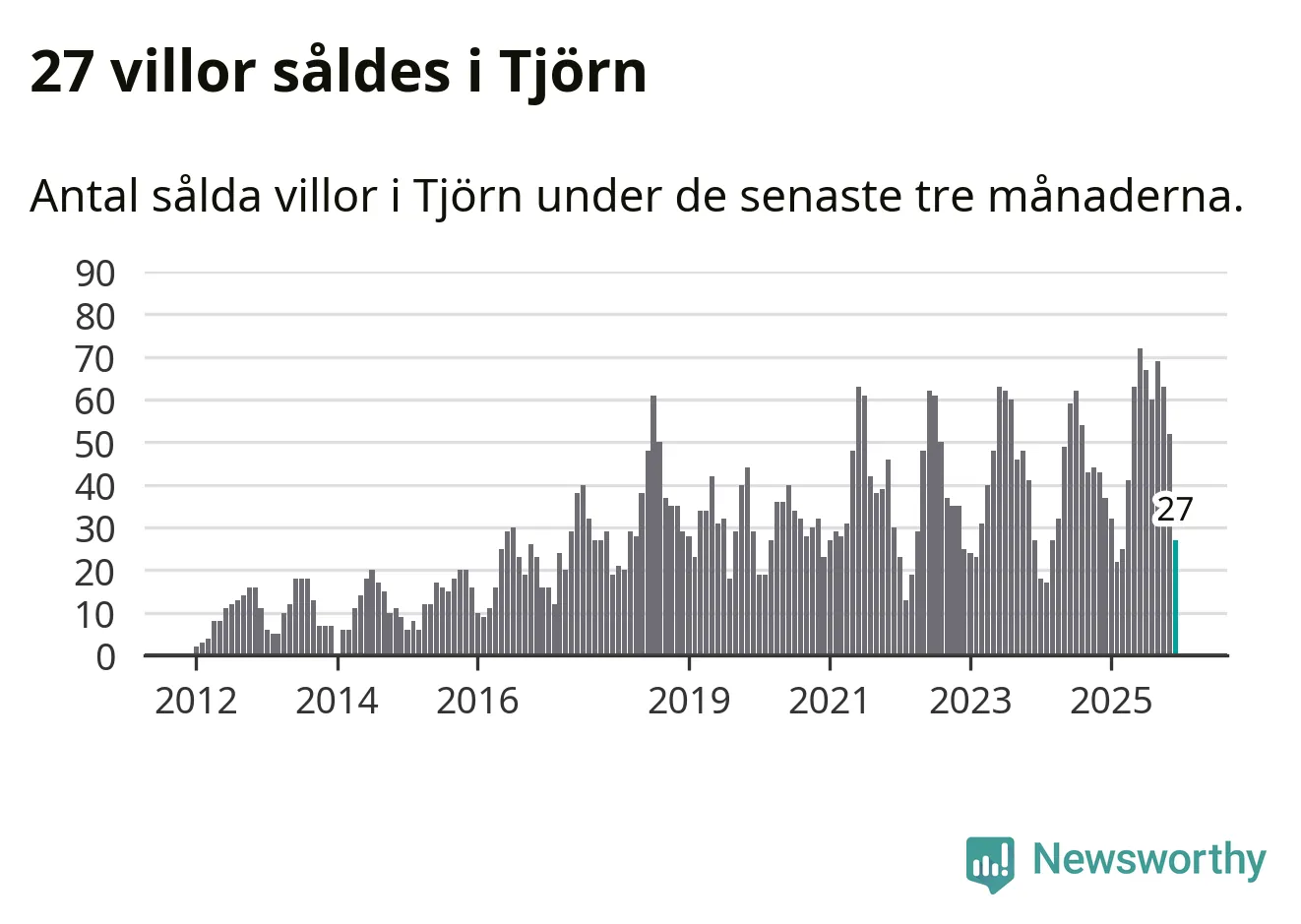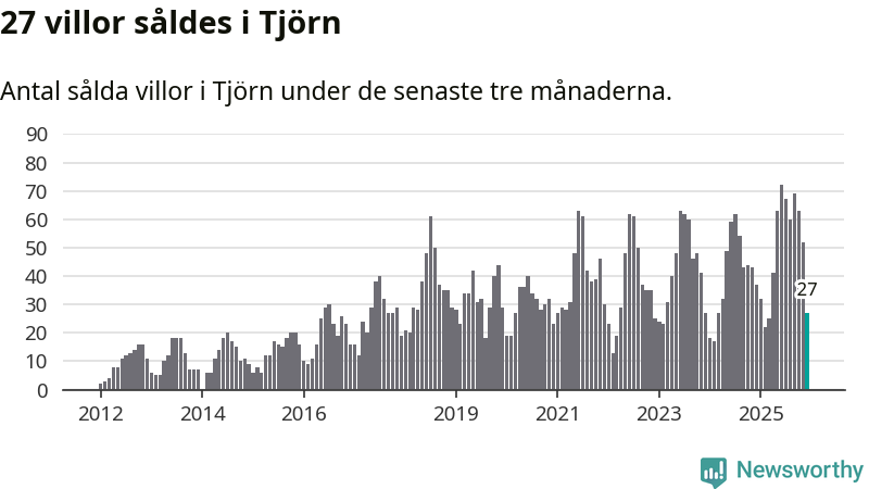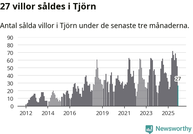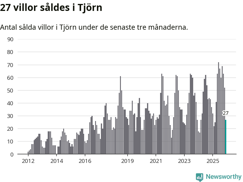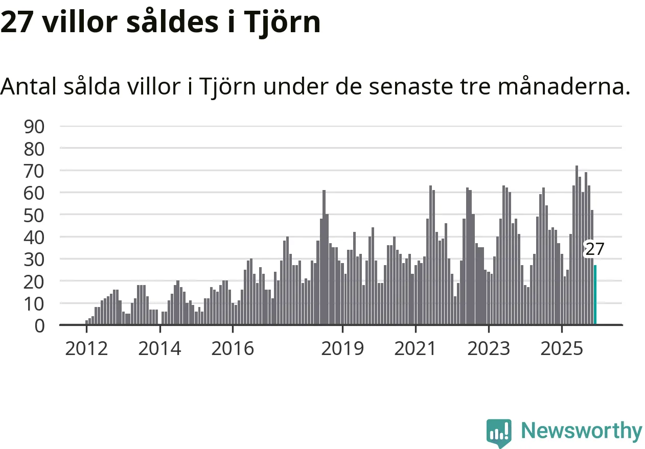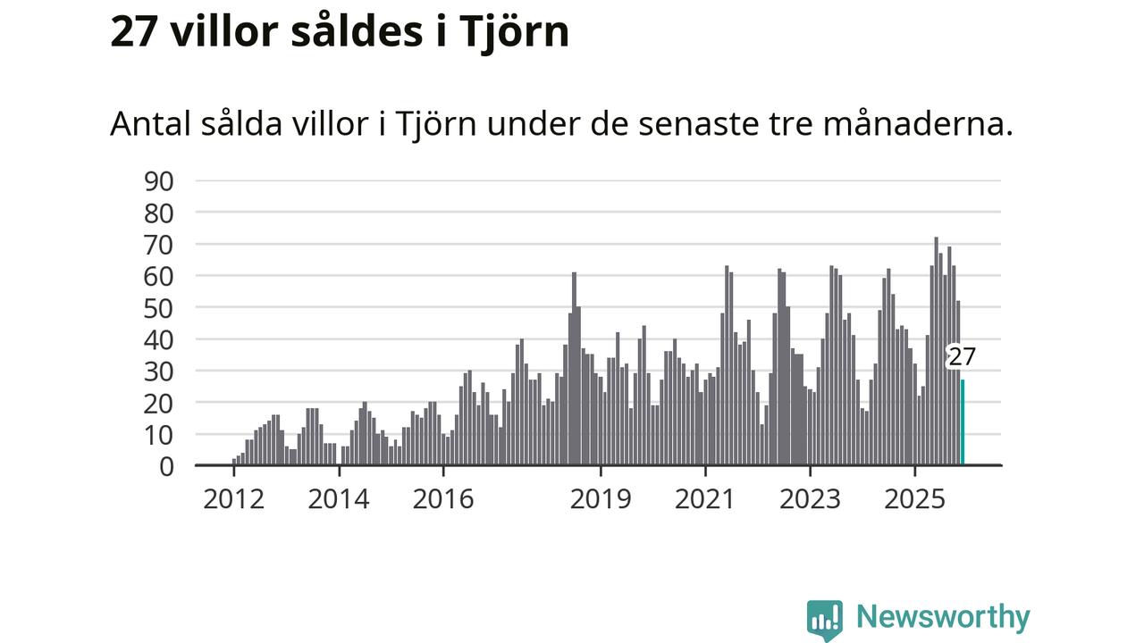 Mellan oktober och december såldes 27 villor i Tjörns kommun. Det är relativt få sett till aktiviteten på bostadsmarknaden i kommunen under de senaste tolv månaderna, samt det historiska snittet för den här tiden på året.