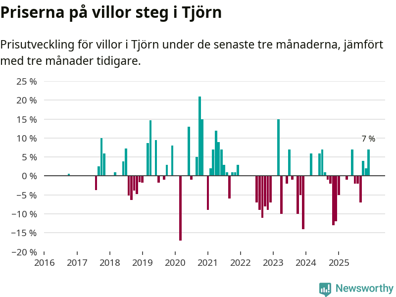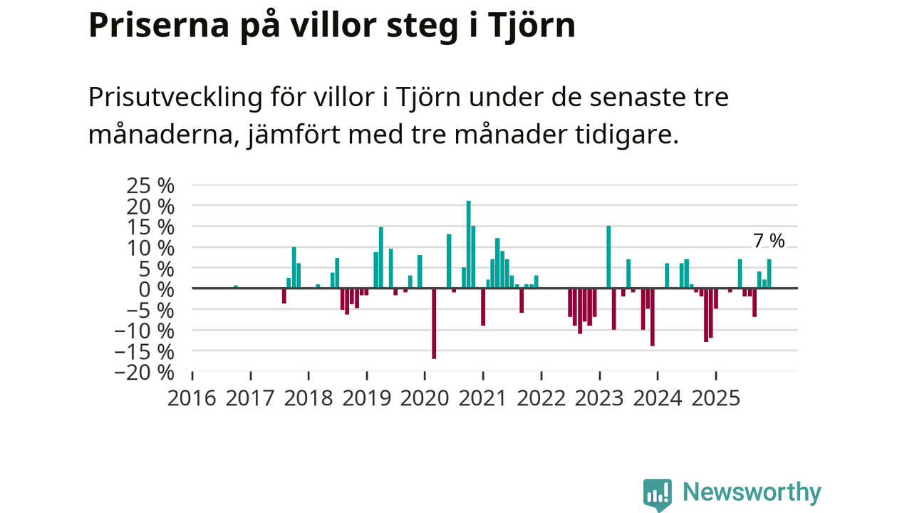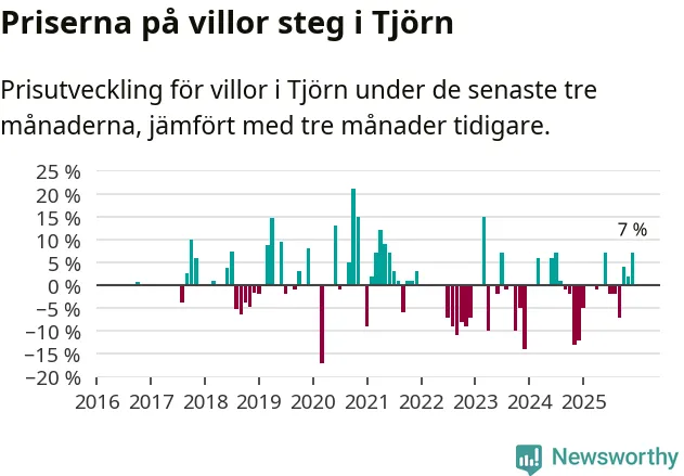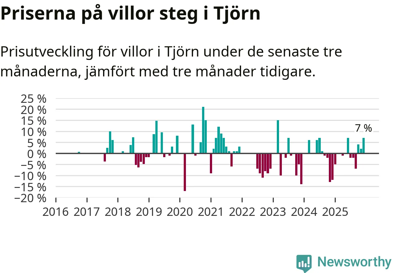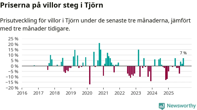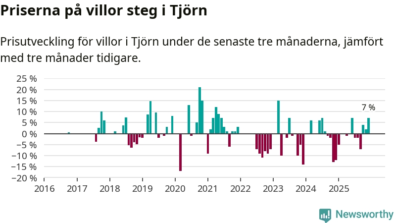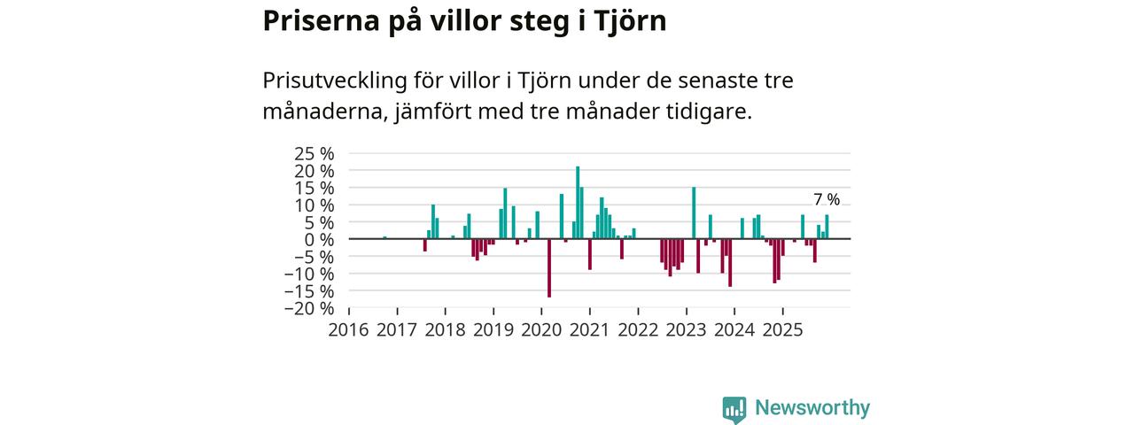 Statistiken visar även på en kännbar prisuppgång i Tjörns kommun. Medelpriset på försäljningarna av villor i kommunen var 7 procent högre än för tre månader sedan. I hela Västra Götaland däremot sjunker villapriserna. I hela länet noterades en prisnedgång på 3 procent.