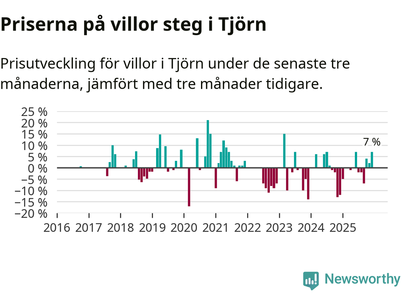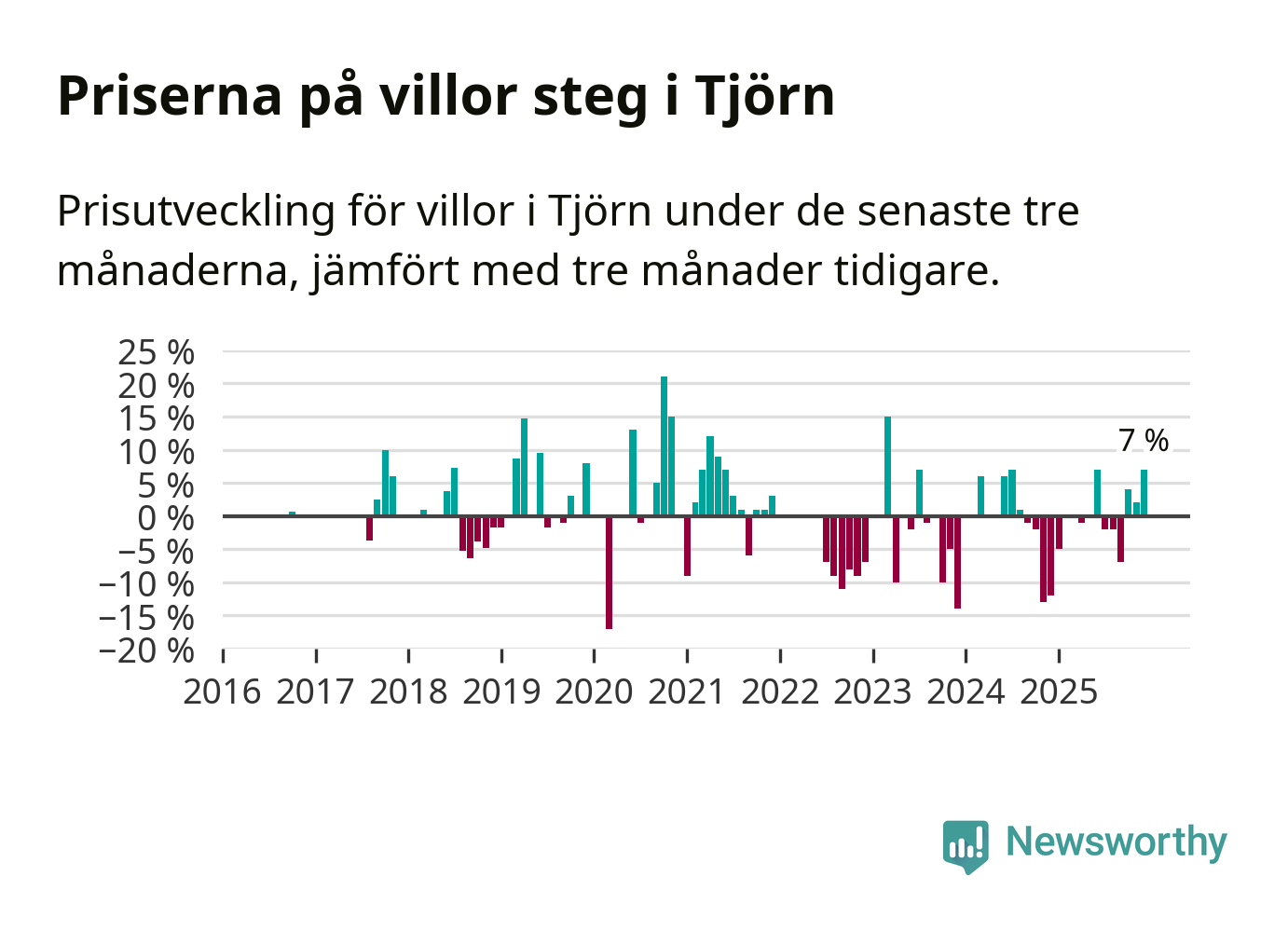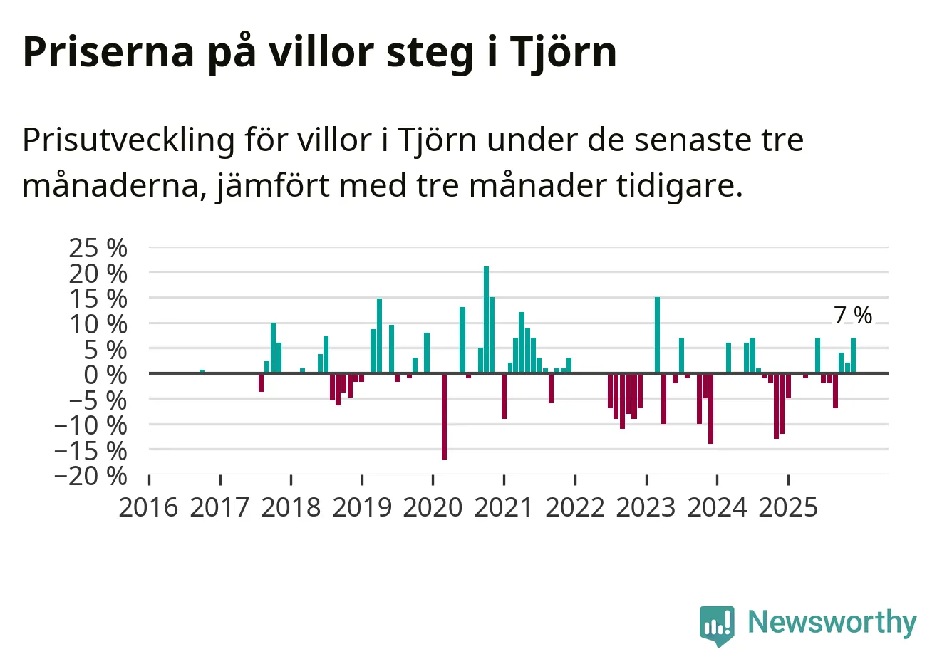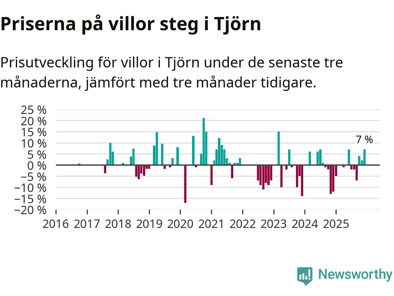 Statistiken visar även på en kännbar prisuppgång i Tjörns kommun. Medelpriset på försäljningarna av villor i kommunen var 7 procent högre än för tre månader sedan. I hela Västra Götaland däremot sjunker villapriserna. I hela länet noterades en prisnedgång på 3 procent.